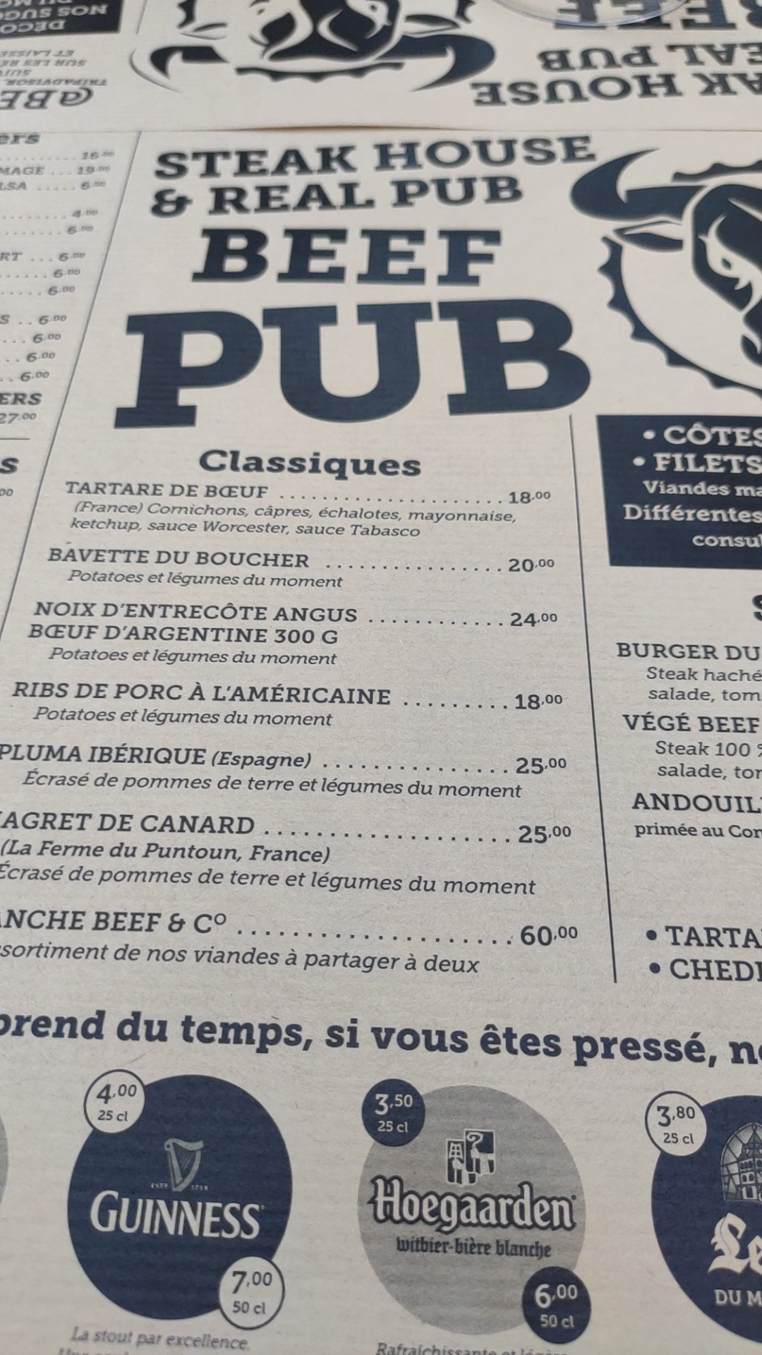 Sans hésiter, Allez y !!! Si je devais garder qu'un restaurant, ce serait le Beef. C'est et de très très loin la meilleure viande que j'ai eu l'occasion de manger. Il y a des pièces d'exception, et des viandes classiques pour un resto. Même ces viandes classiques sont traitées de telle façon, qu'elles en sont exceptionnelles. Le magret de canard est divin, le filet de boeuf une tuerie. Je ne parle pas du choix de bières... Une sélection de bières du monde et plus de 10 pression de prestige. Le personnel est super pro, agréable, accueillant et disponible. Le cadre est magnifique. C'est un sans faute... Merci et bravo le Beef Pub !!!!!!!!!!!!!!!