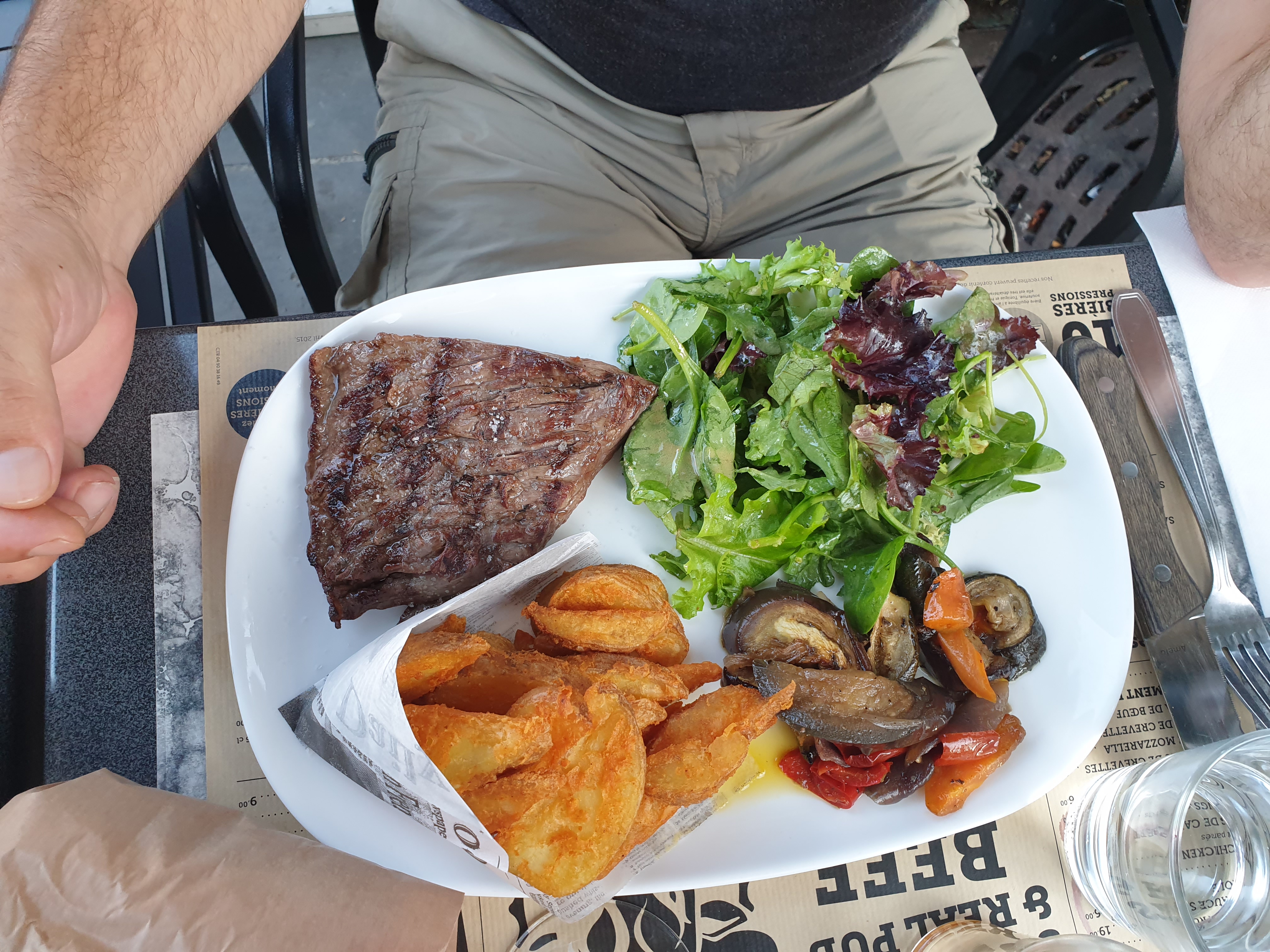 Super resto, nous avons pris la planche de 4 viandes à partager 60 E à deux, elle était très complète avec salades, frites et légumes du moment (aubergines pour nous). Merci au monsieur de nous avoir fait un doggy bag ! Les prix des autres plats sont raisonnables ! C'était très bon.
