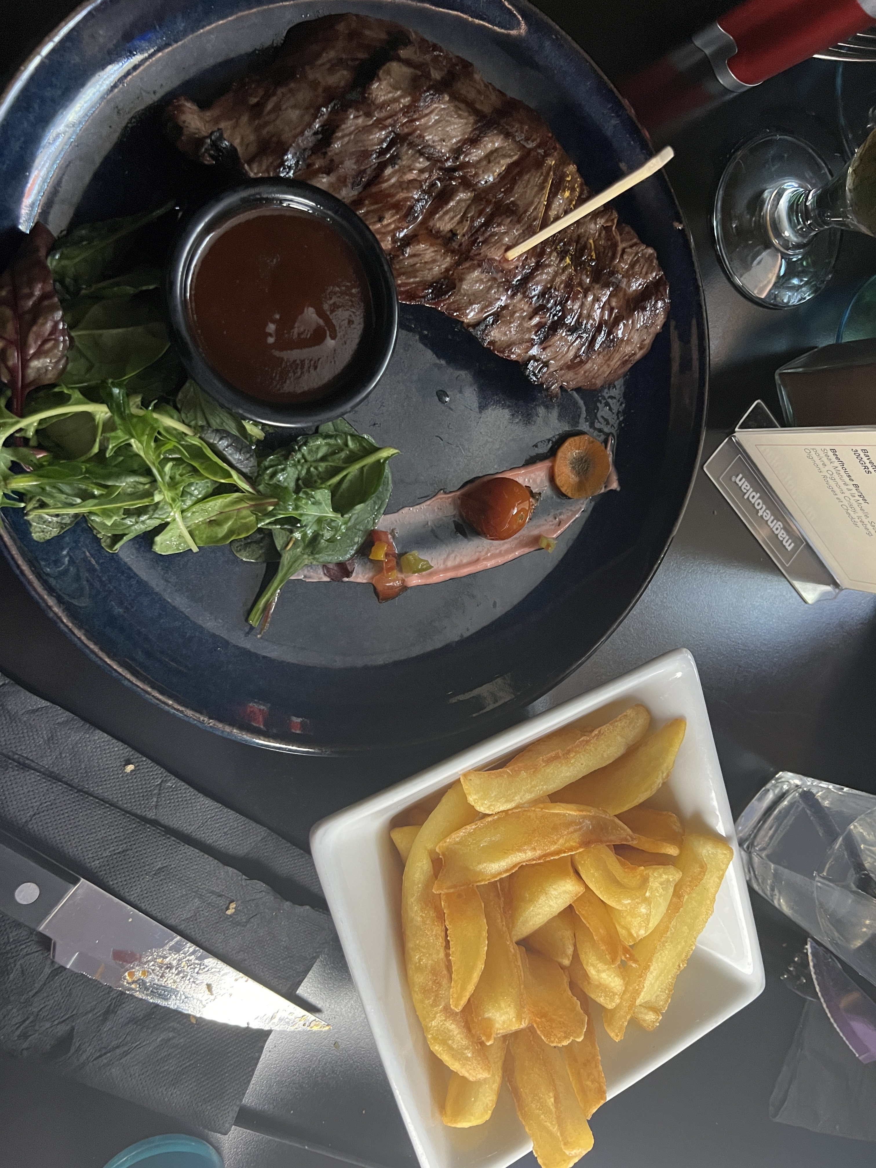 Entrecôte d’argentine très bonne et cuisson parfaite, Bandol rouge château Barthes excellent ! Accueil et service de Marion remarquable !! En résumé nous avons passé un très bon moment dans ce restaurant à la sortie du cinéma.