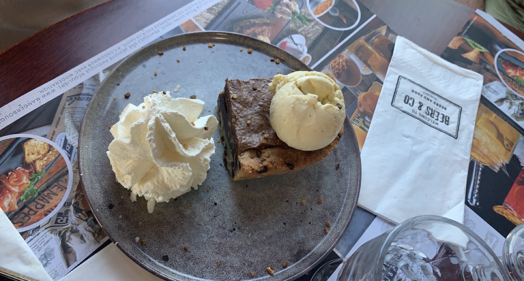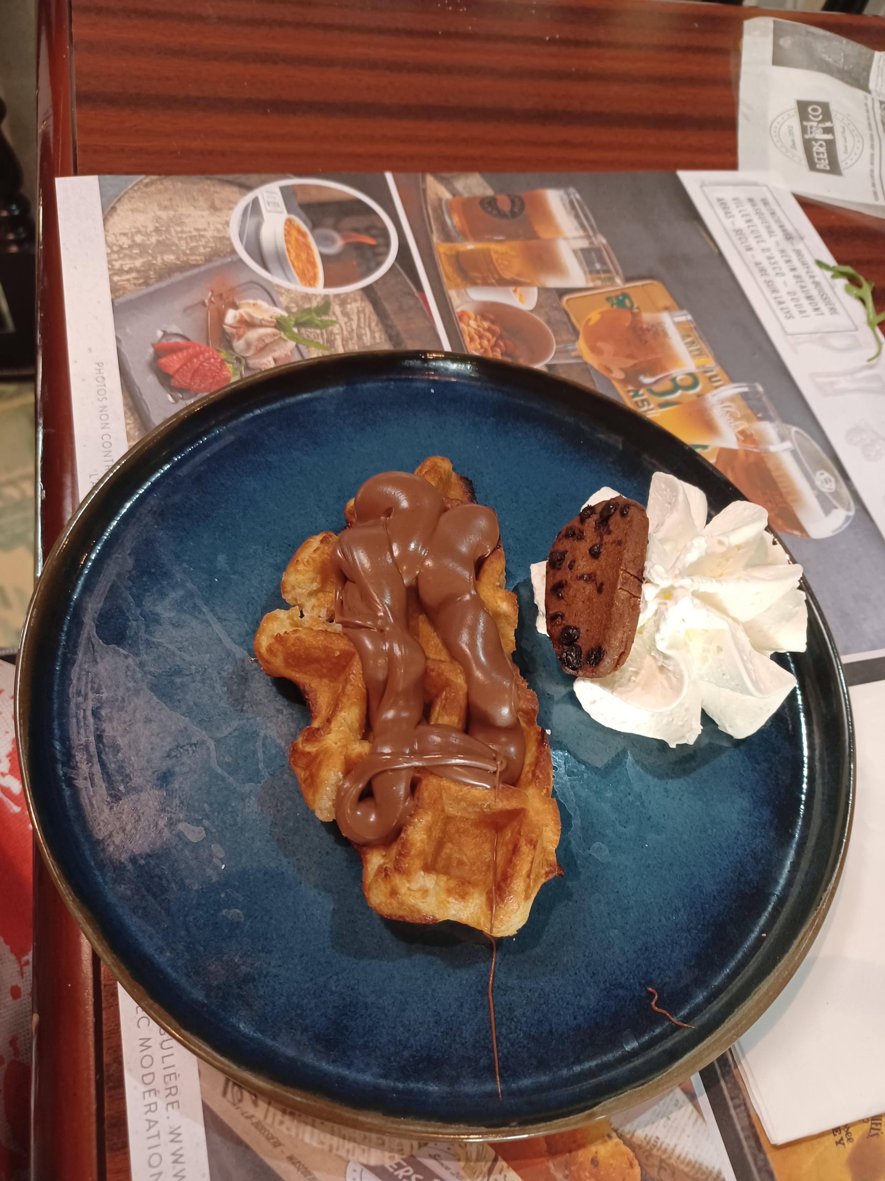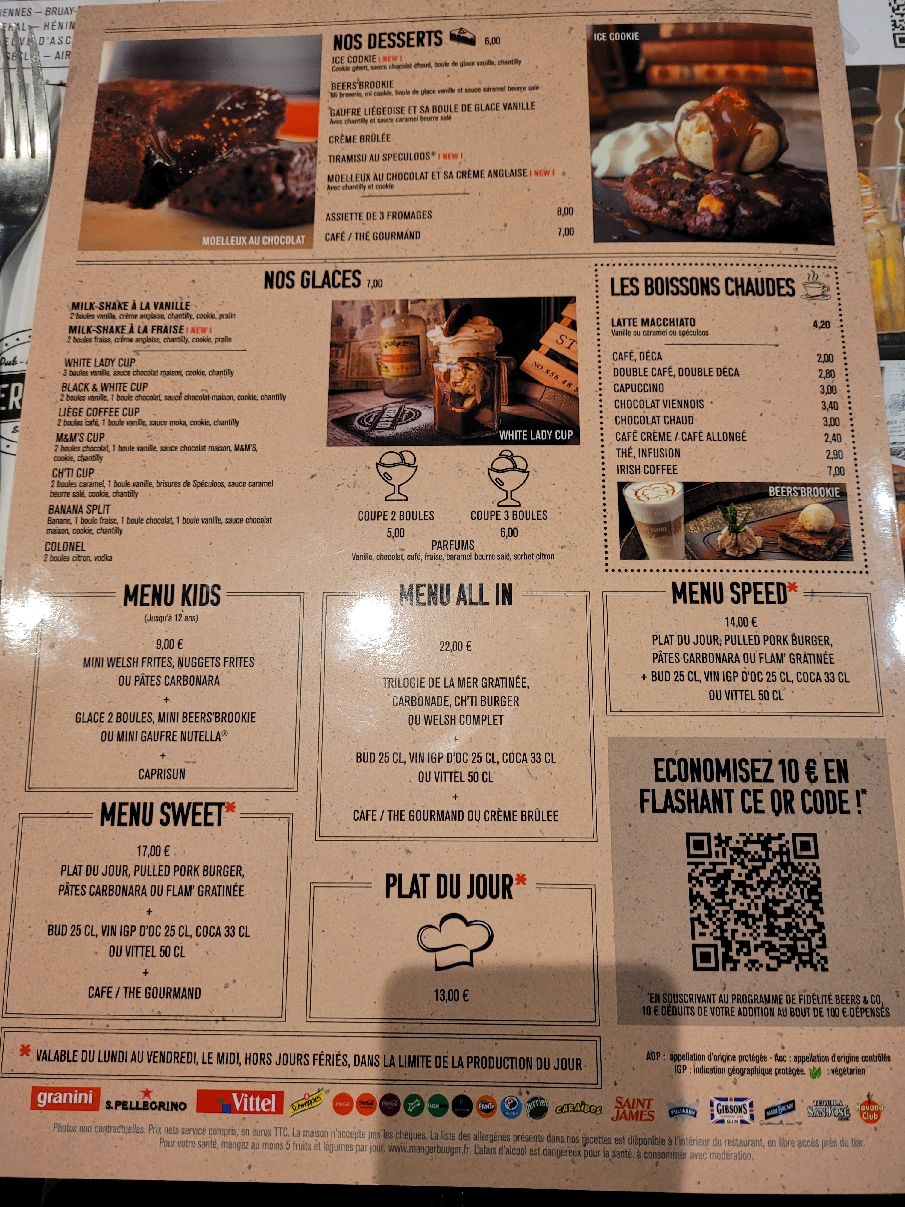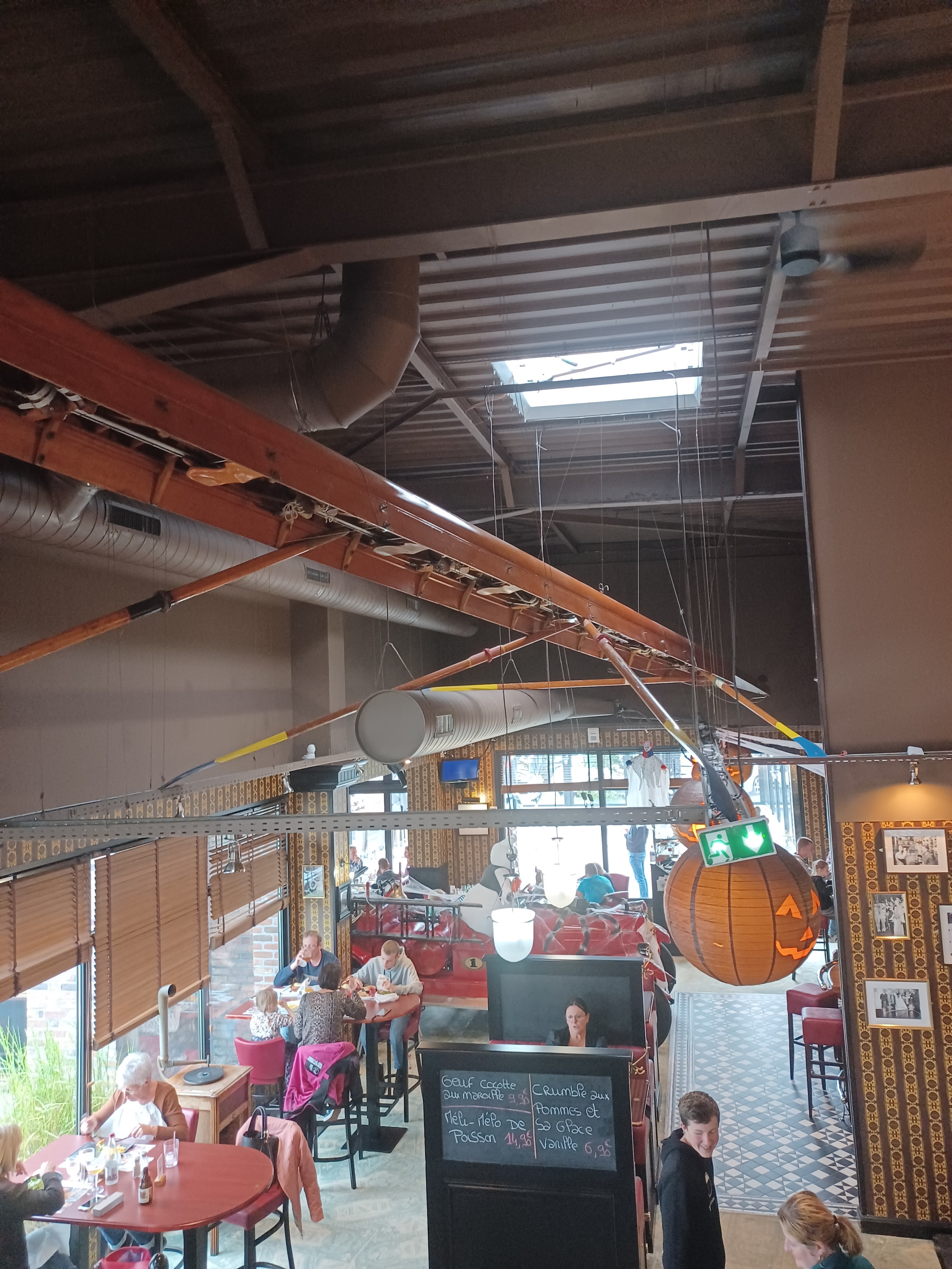 Accueil agréable tant par le décors (levez la tête vous serez surpris) que par les serveur(e)s souriant(e)s. Nous avons pu prendre le temps de découvrir la carte et de choisir. Le tout sans pousser à la consommation. Déçue par ce que j'ai commandé (viande sèche et dure, si vous aimez le welsh assurez-vous avant de commander que vous aimez leur bière : le pain en est imbibé) mais d'autres plats mérites peut-être d'être goûtés ... Par contre les desserts 👍