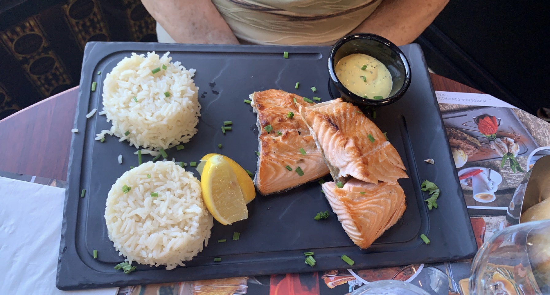 Plat pâtes aux 2 saumons. Très pauvre en saumon et surtout que du saumon fumé et faible en quantité. Dessert . Café donuts. Cher pour un expresso et un donuts.