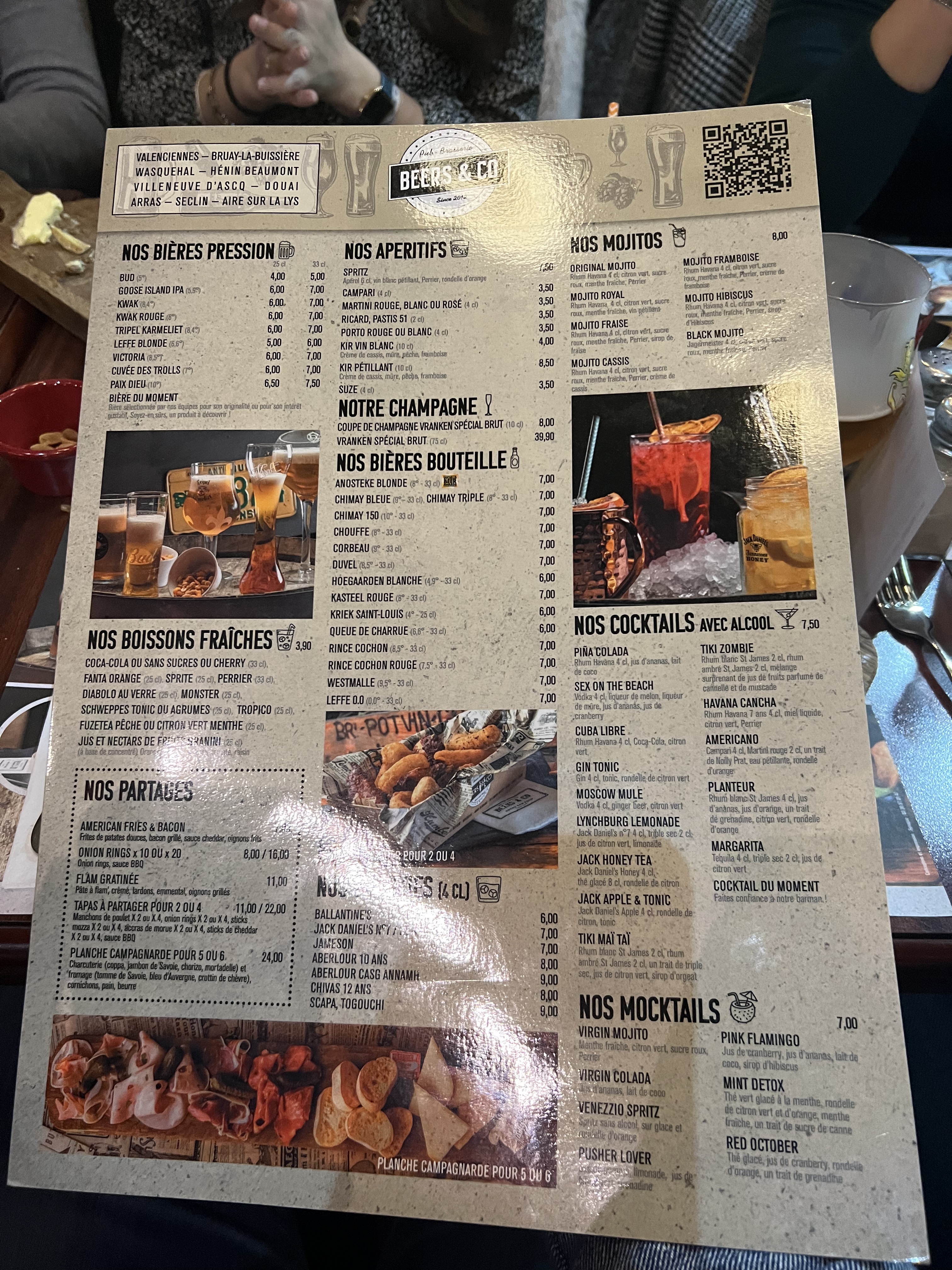 Un repas sans plus, la planche était bonne et les plats typiques du nord. Gros point négatifs, pour un restaurant de Bières, ne pas afficher à la carte des Pinte c’est moyen, surtout quand la 33cl est a 7€ (dans le Nord !!). Le reste était correct. Les serveurs/e sont super sympa en revanche.