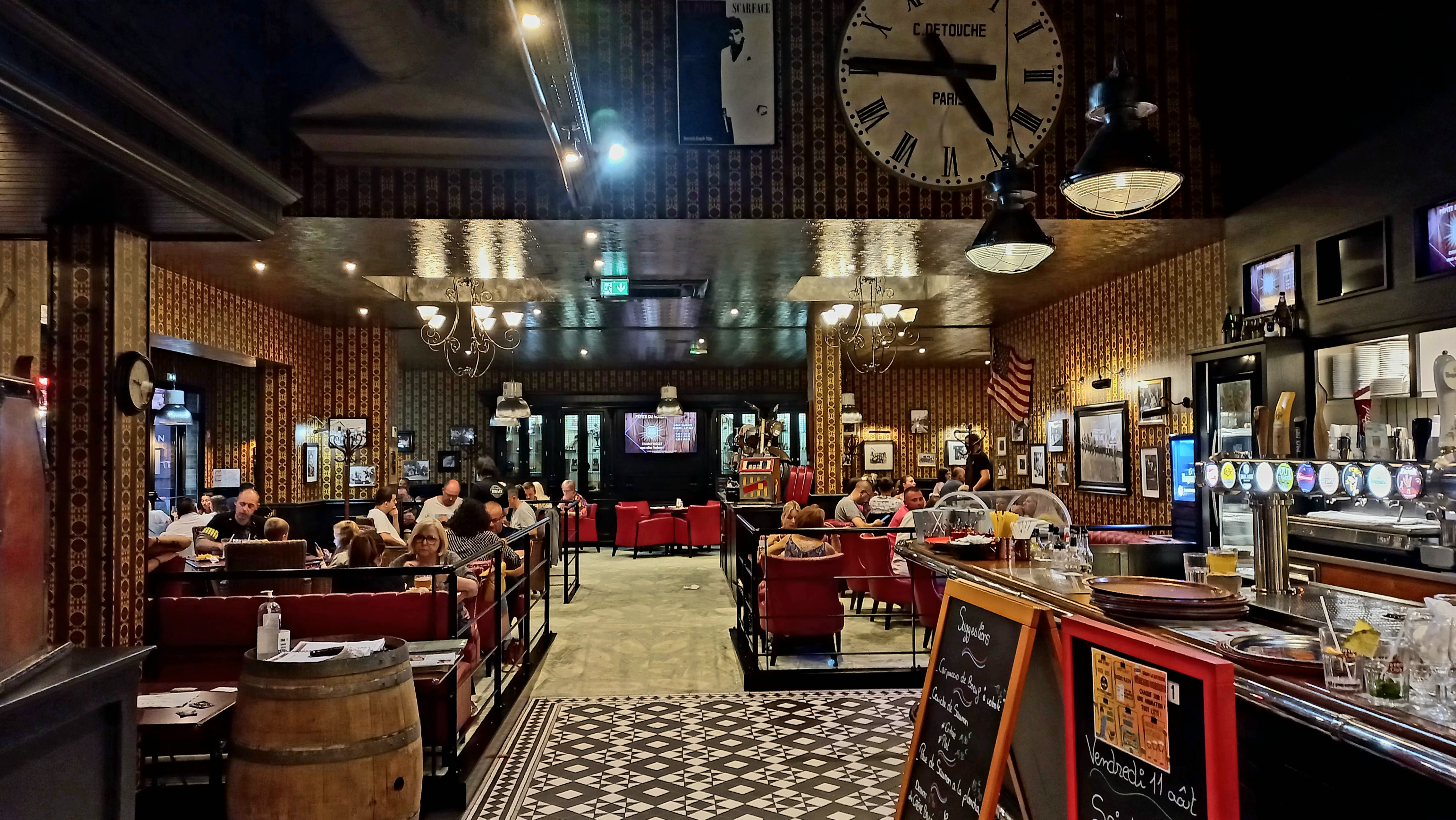 Nous étions en couple à la table 25 (ce 11 août à 20h) et nous avons passé un excellent et agréable moment dans cette brasserie dont la bonne ambiance est palpable. Le décor est très joli, ambiance pub anglais dans un contexte US. L'accueil est chaleureux et très aimable, les plats très variés et bien garnis pour une addition très correcte. Donc excellent rapport qualité/prix. Mention spéciale à la jeune fille qui nous a servi (et encaissé) pour sa sympathie, son amabilité et son naturel. Ce fut un plaisir pour nous. Nous reviendrons sans problèmes.