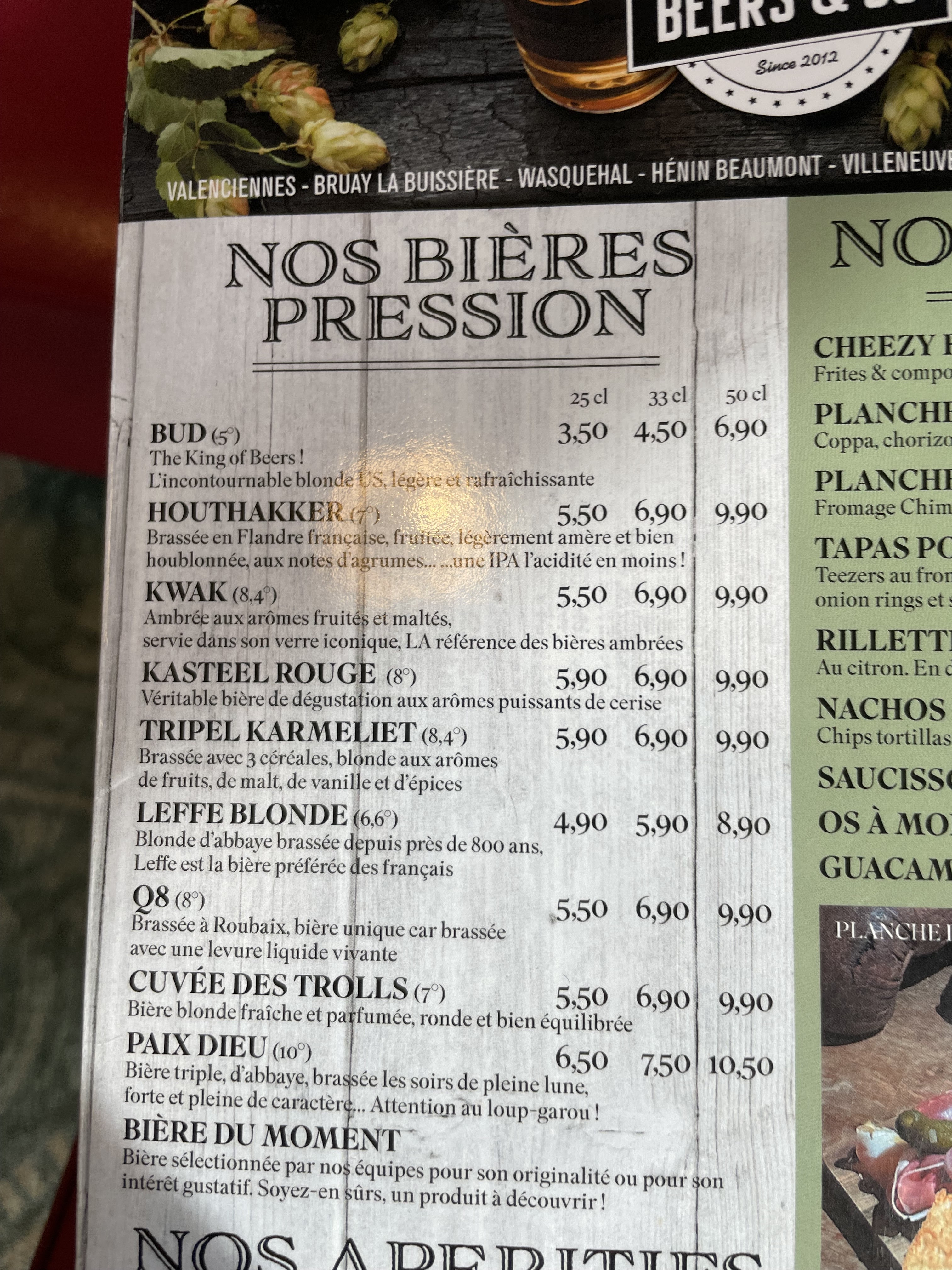 A éviter ! 2eme fois que j'y vais, 2eme fois que je suis déçu. Pourquoi ? 45 min pour prendre notre commande. Le serveur jouait sur son téléphone au lieu de s'occuper des clients. Pas vraiment sérieux. Ajouter une trentaine de minutes pour être servis. Mon plat : ch'ti burger > le fromage à dû fuir l'établissement, le burger n'avais aucun goût de maroilles... Les frites étaient toutes dures. Pas de sauce en accompagnement, faut la demander à part. Même au McDo, y a des sauces (quasiment) d'office sur le plateau ! On entendait les autres clients à proximité qui râler également pour être servis. Puis la galère à l'encaissement. A l'heure d'aujourd'hui, tous les restos semblent s'en sortir avec le chacun sa part. 2 fois que j'y vais avec des collègues, 2 fois que c'est la galère. Je paie en dernier, on m'annonce 45€... Pour un burger à 15,90 et une bière à 6,20€... Les comptes sont pas bons Kévin ! Bref, le plat pas terrible, l'attente plus qu'abusé et un encaissement à la ramasse. Faites comme mon fromage, fuyez !