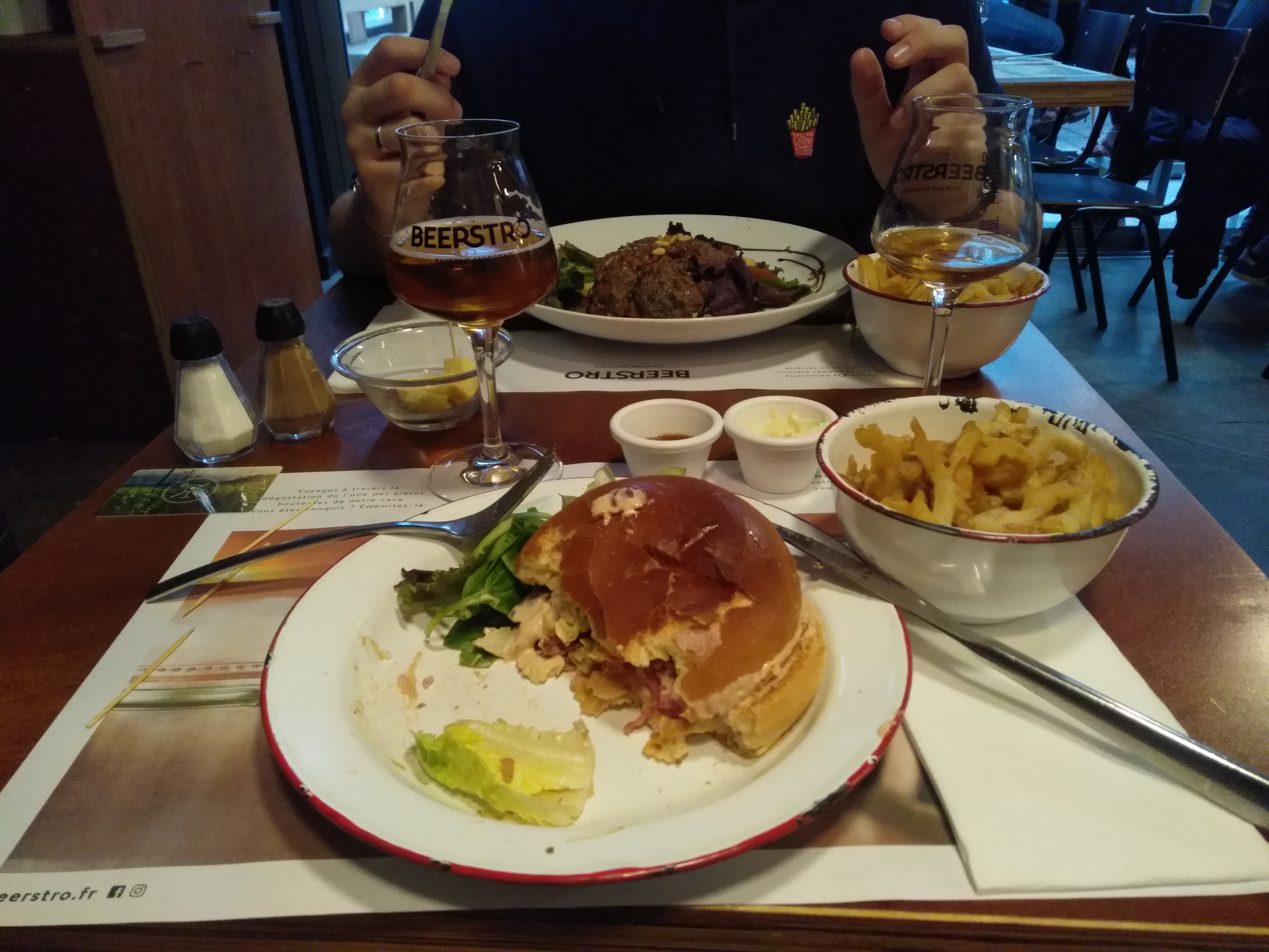 Pas mal de choix de bières mais pas assez d'IPA, ce serait sympa d'avoir une bonne NEIPA à la carte. Le principe de la carte pour se servir est bien mais ce serait franchement mieux de pouvoir en avoir plusieurs pour une tablée. Côté plats, c'est bon mais ça manque clairement de fromage dans les burgers (VG compris) et de frites dans l'assiette. Le lieu est chouette mais malheureusement il a quelques odeurs d'égouts certainement dû aux récentes pluies.