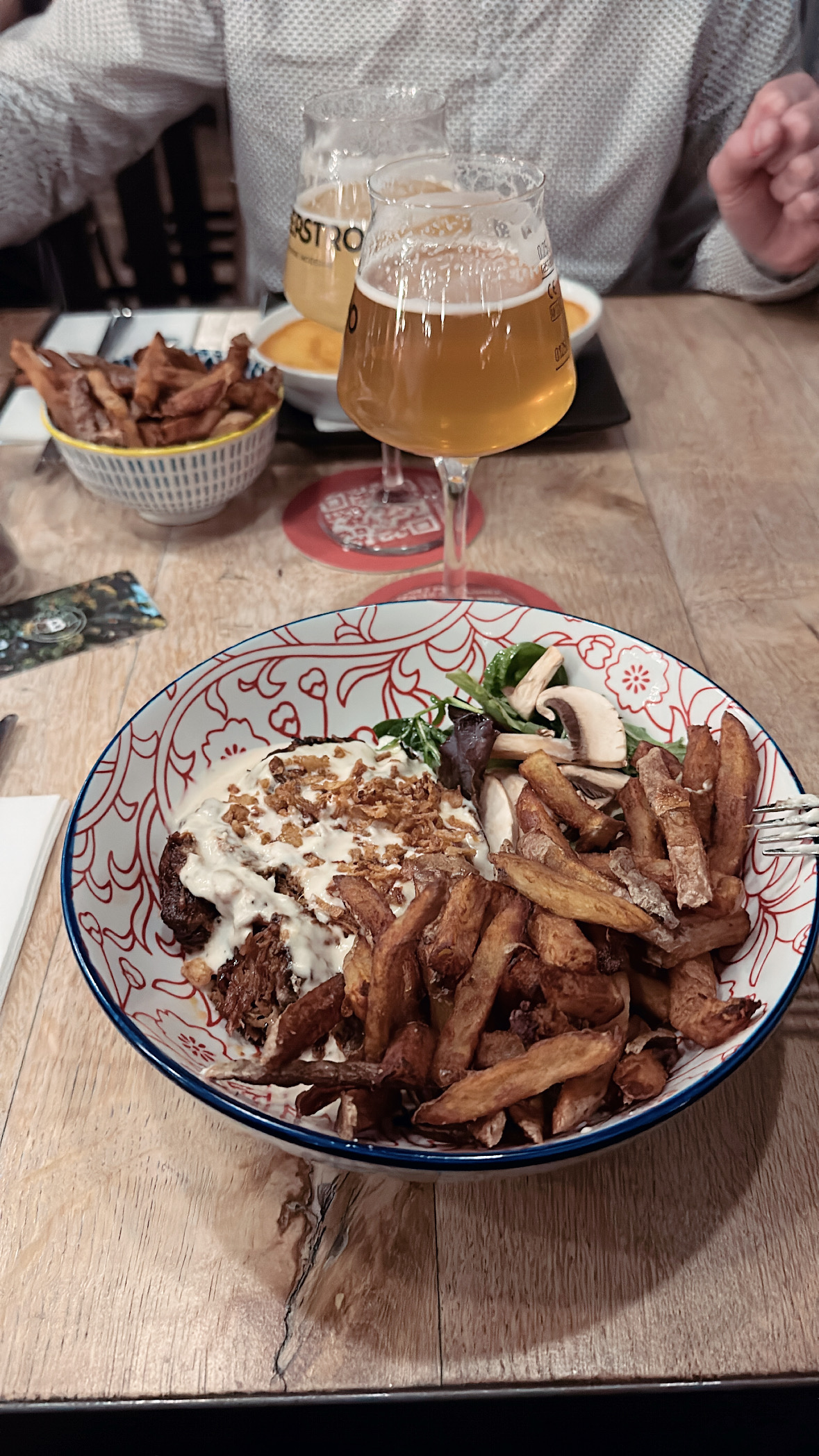 Visite essentielle! Si vous cherchez à déguster de la bonne nourriture, des spécialités locales ET des bières incroyables, c'est l'endroit où aller ! Au coeur du Vieux Lille, le Beerstro dispose d'un superbe patio, d'une ambiance très chaleureuse. La bière est on ne peut plus fraîche : vous vous servirez aux différents robinets mis à votre disposition pour choisir vos marques préférées. J'aime goûter un peu de chaque bière...! Options végétariennes au menu, options végétaliennes disponibles sur demande. La nourriture est fraîche !!