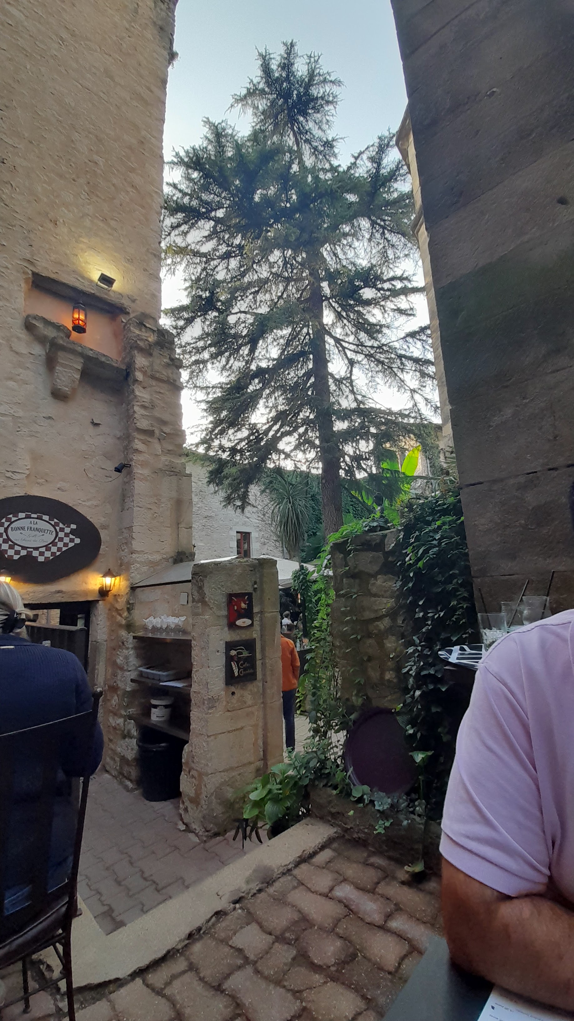 Service aimable. Cadre agréable au frais entre les vieilles pierres de la maison romane du 13e siecle. Peu d'attente pour nos menus du jour malgré le monde. Menu du jour à 14€: gaspacho bien assaisonné et steak frites. Viande tendre mais les frites manquaient de cuisson.