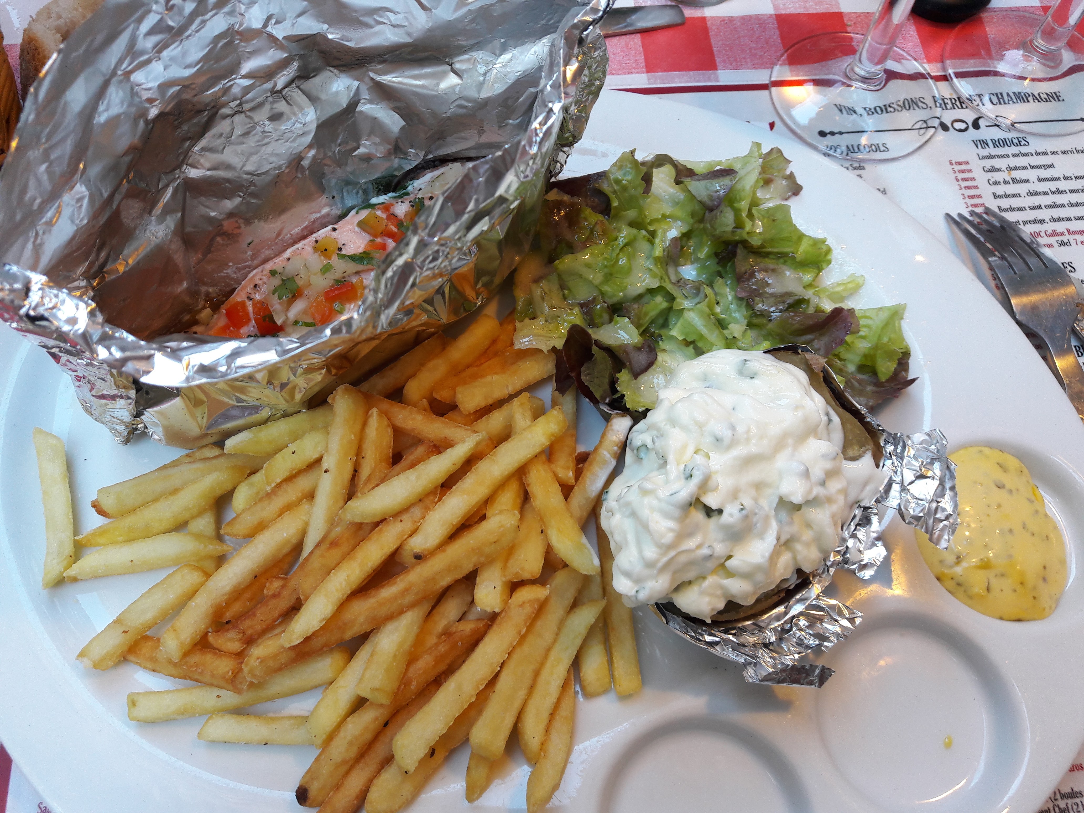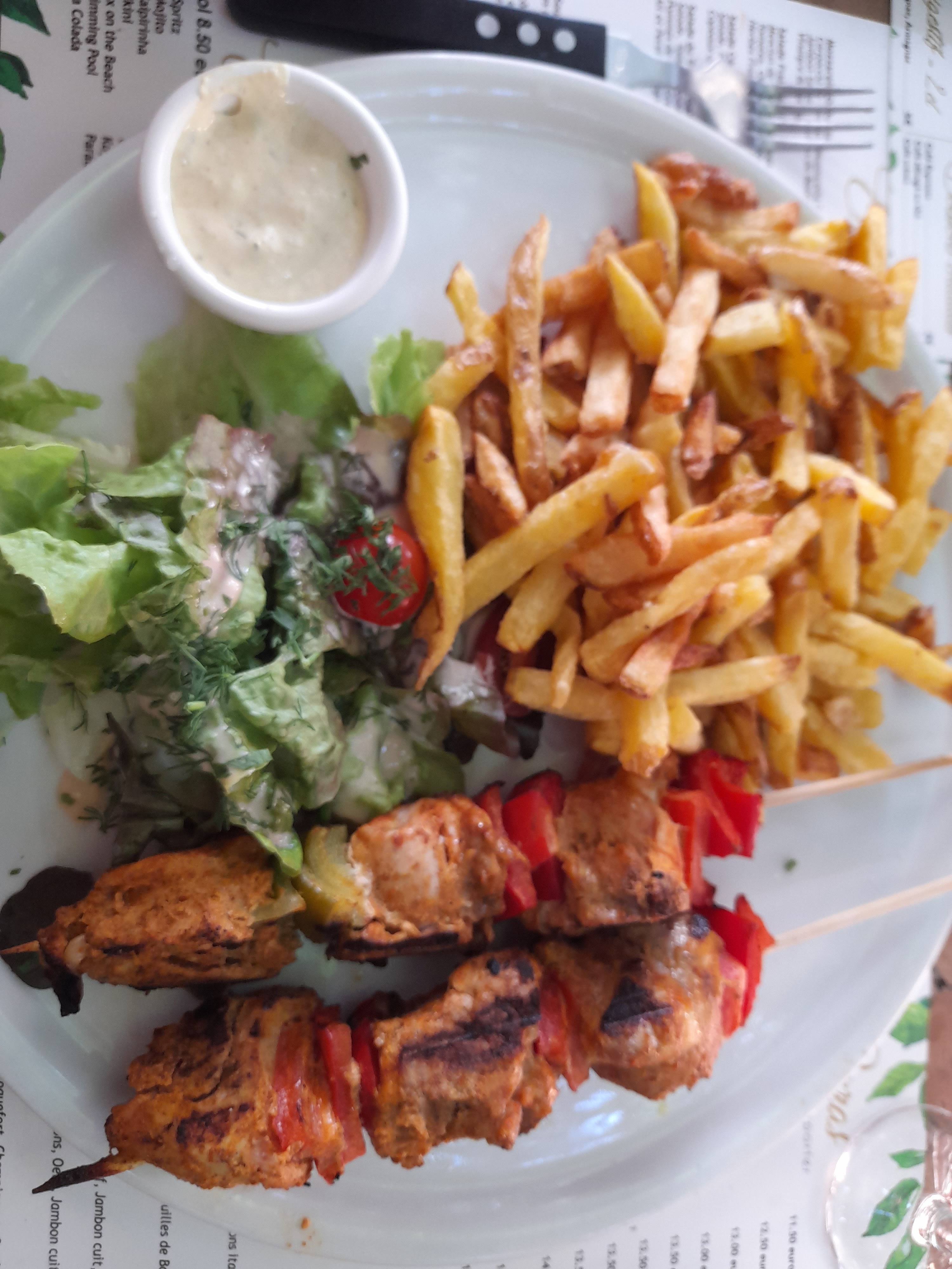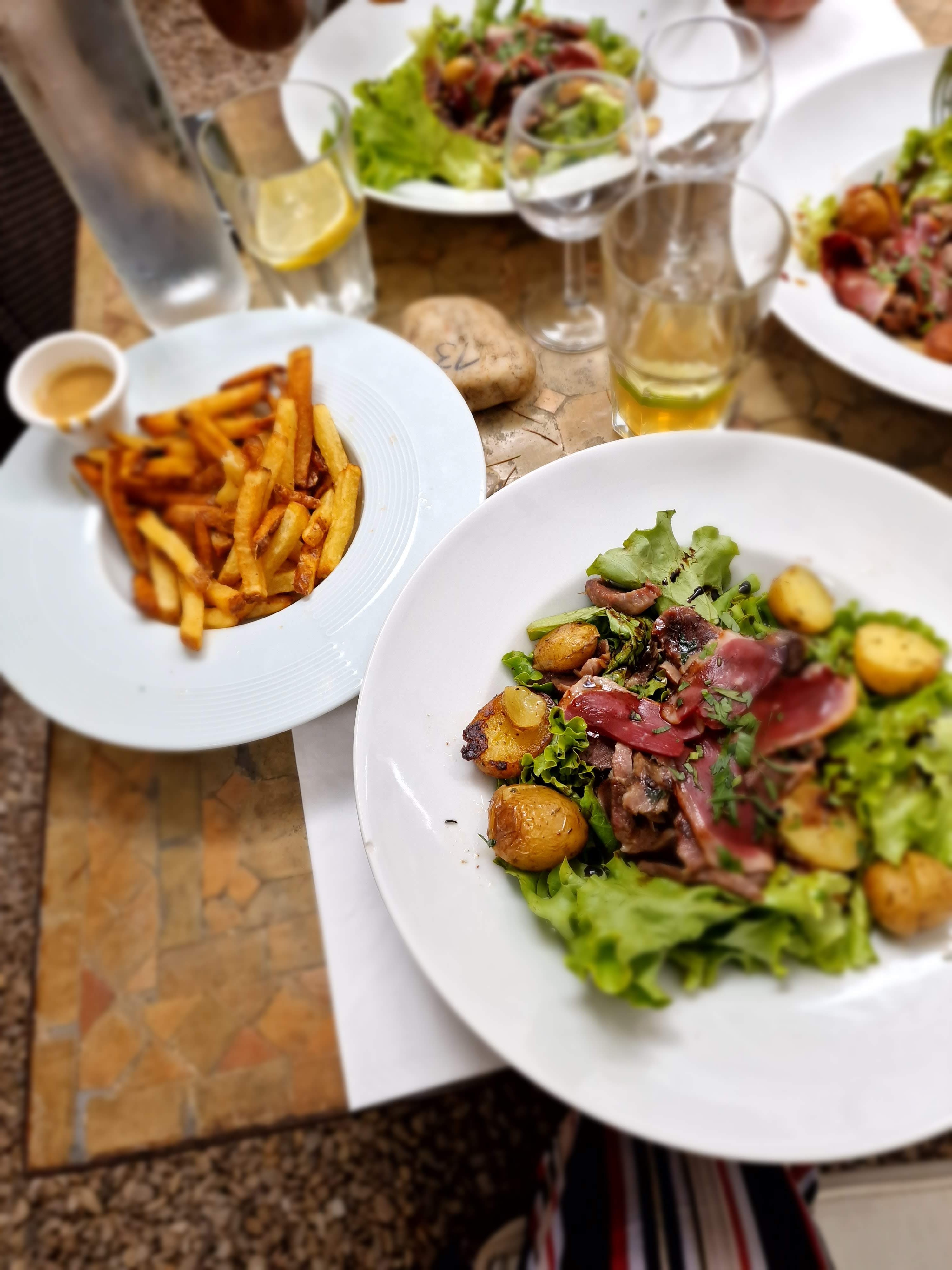 Les frites étaient délicieuses et le cadre était enchanteur, ce qui était vraiment très bien. Après, toutes les tables étaient collées les unes aux autres, ce qui posait des soucis d'intimité... Manger en sentant la sueur et la clope de la table d'à côté coupait un peu l'appétit. Je ne sais pas si les normes de sécurité étaient respectées, mais les normes sanitaires ne l'étaient pas. Les charmants poils dans la salade peuvent en attester. Il y avait du monde et les pauvres serveurs devaient courir sous la chaleur. Ils devaient êtres débordés, ce qui explique les multiples erreurs dans notre commande. En revanche, ça n'excuse pas leur agacement à notre encontre, surtout quand on ne leur a pas reproché leurs erreurs. Mais bon, le prix annonçait la couleur. Pas trop élevé. Il faudrait souligner la gestion des serveurs, puisque nous avons attendu une heure pour manger. Mais enfin, il y avait du monde... J'imagine... Attention, les TPA buguent un peu ! Prévoir du liquide pour aller dans ce restaurant, ce que nous ne referons pas et que nous ne recommandons pas. (Mais les frites étaient bonnes)