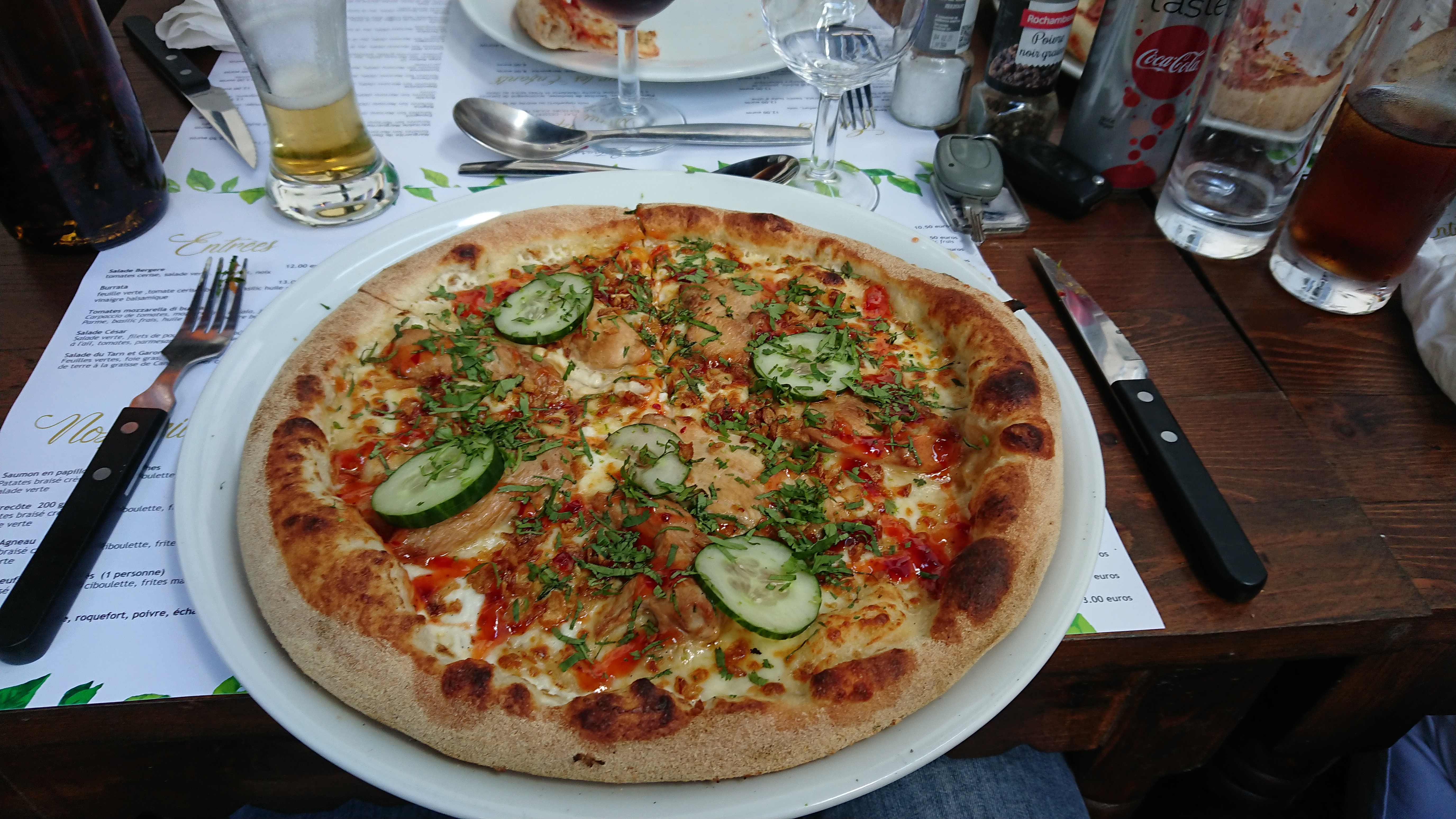 À mon sens la meilleure table de St antonin. J'ai lu énormément de commentaires avant d'y aller. J'ai lu que le pizzaiolo avait sûrement des notions de gastronomie italienne, c'est vrai, ses pizzas sont fabuleuses. J'ai lu que c'était un peu un attrape touriste et que le cadre ne fesait pas tout. C'est faux, le cadre est incomparable, le plus beau que j'ai eu pendant mes vacances en Aveyron. La carte est certes simple, mais personnellement je pense que tout le monde y trouve son compte. Si vous voulez de la bonne viande, il y a le choix. Ma femme a pris les cotes d'agneau, elles étaient bien tendres et pas trop grasses, les frites maisons étaient parfaites, bien croustillantes et onctueuses à l'intérieur, la sauce au poivre était délicieuse. J'ai pris la pizza chicken thaï, pleine de promesses sur la carte et elle les tient largement dans l'assiette, c'est la pizza la plus élaborée et la plus fine dans les saveurs que j'aie mangé (photo), la quantité est aussi au rdv, nous n'avons pas pris de dessert préférant nous promener dans les ruelles moyen-ageuses et profiter d'un très bon glacier en ville. Le prix est très correct. J'ai aimé le lavabo dans un grand vase à l'ancienne, dommage que le WC soit unique, il est cependant très bien décoré. Je finis par la réservation, étape incontournable pour une adresse si courue. J'ai tenté une dizaine de fois de les joindre au téléphone sans succès, j'ai donc fait un détour en passant par là pour réserver de vive voie, cette fois sans problèmes ! Ce qui nous a permis de profiter de cette adresse un dimanche midi, jour de très forte affluence. J'ai lu aussi que le moindre cm carré était optimisé pour y entasser un max de clients, c'est faux nous avons eu suffisamment d'espace et d'intimité même en pleine terrasse même un dimanche midi. Bref ne vous découragez pas et réservez vite ! PS:Nous étions la table 4😉