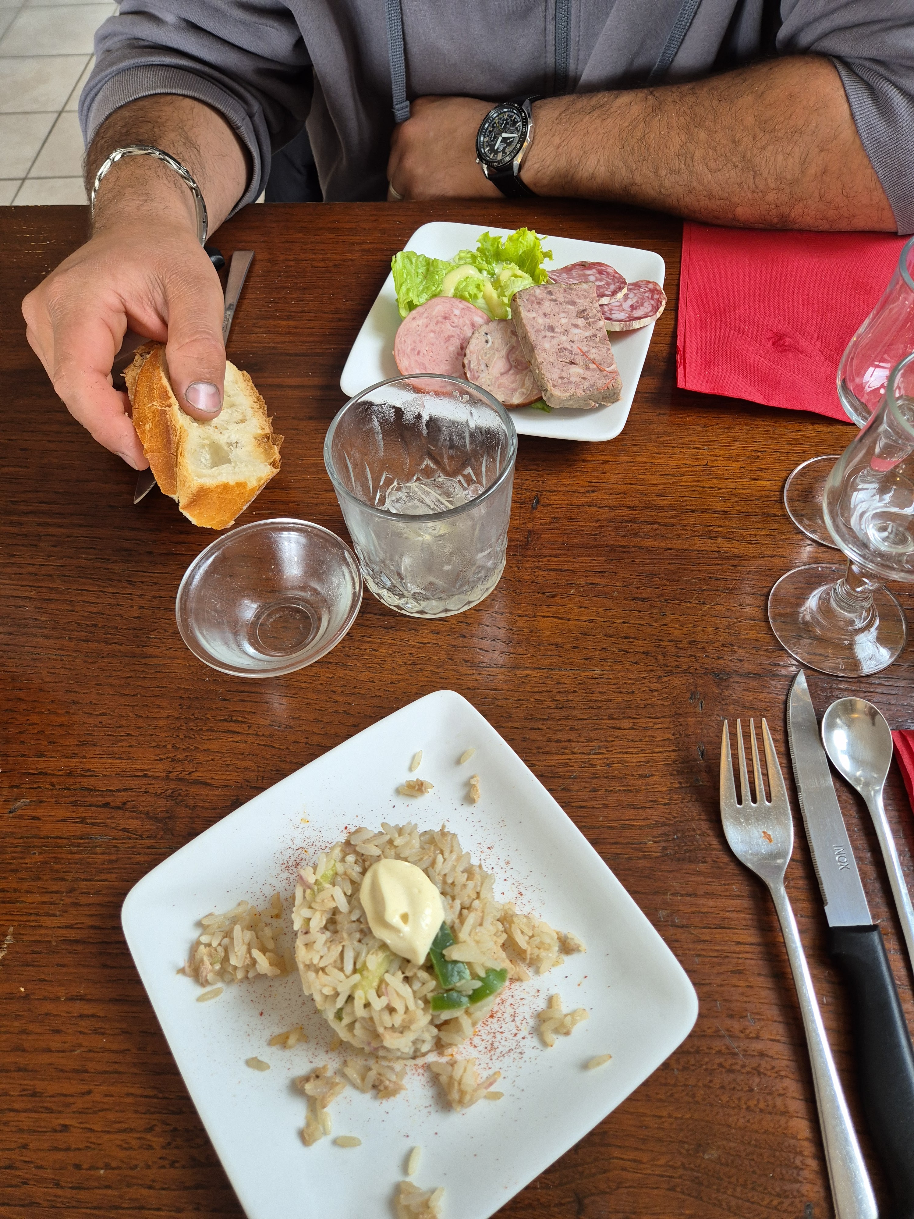 Personnel sympathique et souriant. Nous avons été bien accueilli. Par contre on nous a servi la planche apéro, il s'agissait de charcuterie mis en vrac dans une feuille de sopalin, très moyen pas hygiénique du tout. Le poisson pour le plat n'était pas frais, le riz trop cuit et du sable dans la salade. Nous l'avons signalé et on nous a servi un bol de salade avec toujours du sable dedans.