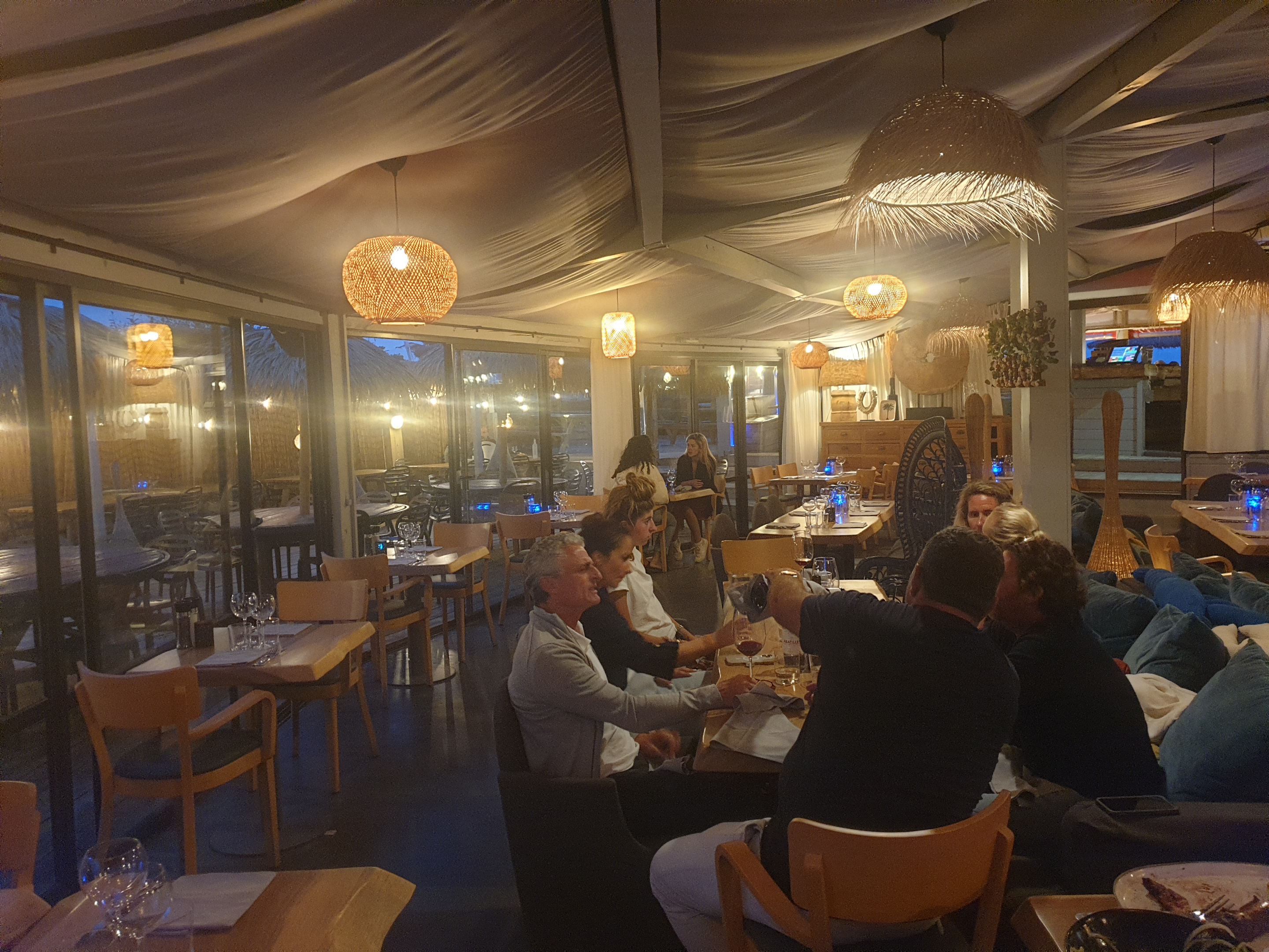 Paillote chic au bord de la plage. A l'intérieur un Restaurant à la déco soignée, possibilité de boire un verre les pieds dans le sable devant le coucher de soleil. Terrasse avec vue très prisée l'été évidemment. 2 menus le soir entrée/ plat ou entrée dessert à 31 € entrée plat dessert à 36€,sinon une à la carte, poisson crustacé ou viande.cuisine plutôt exotique. Prix relativement élevés mais qualité au rv. Service jeune et rapide.