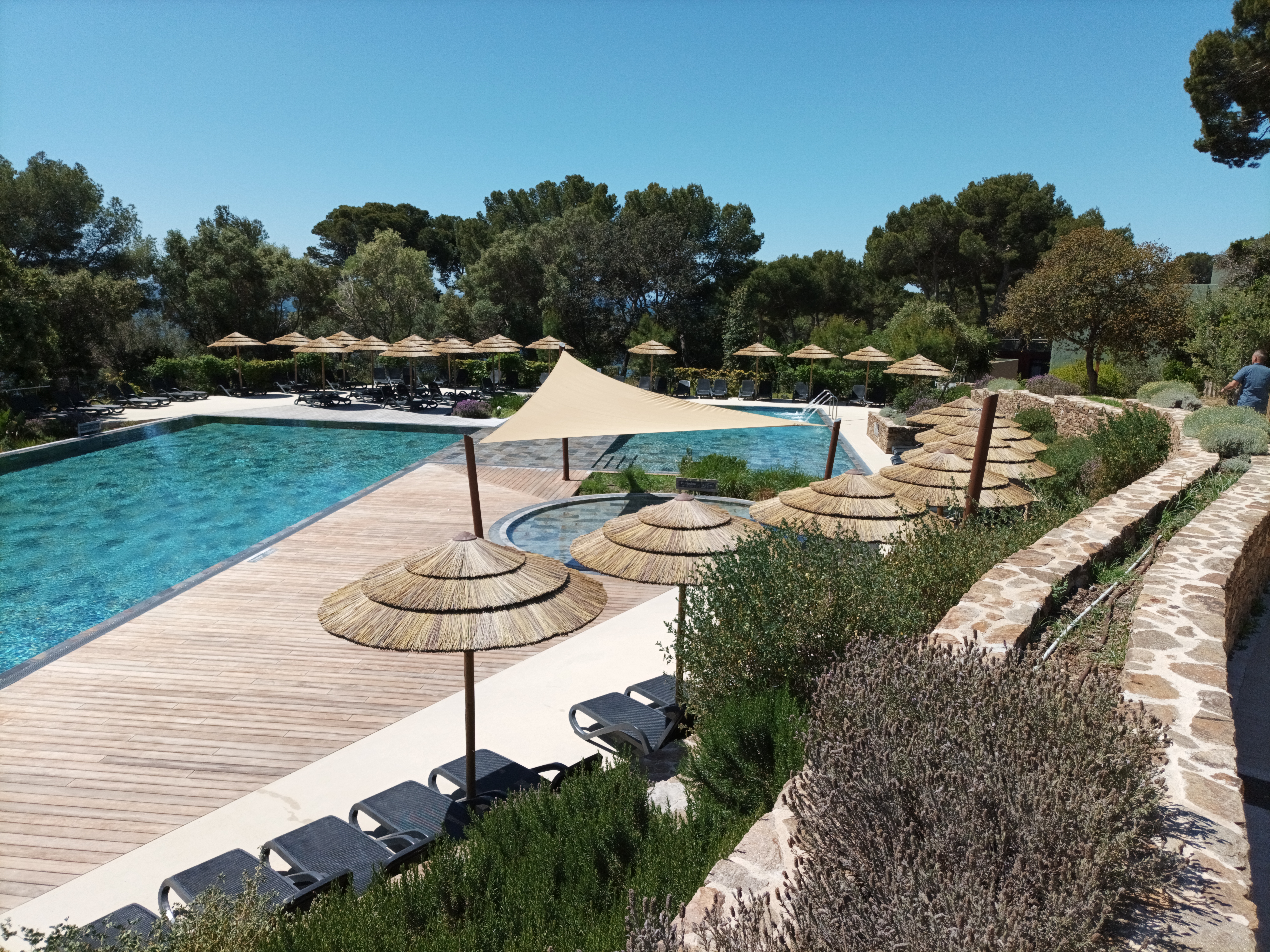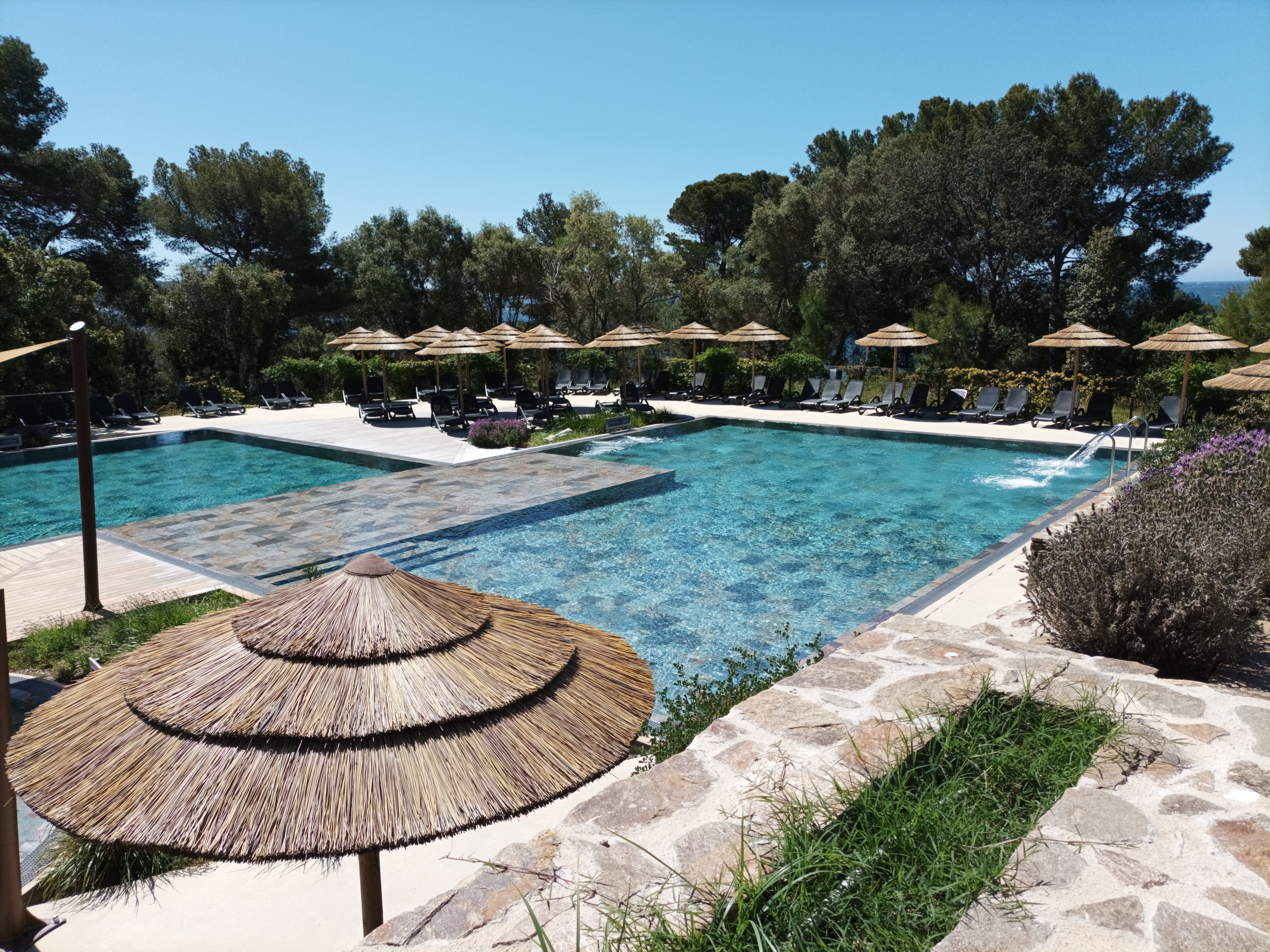 site exceptionnel avec de nombreuses criques et de petites balades aux alentours. Vue direct sur porquerolles et accès sans voiture jusqu’à embarcadère. Tout pour être au top … Seulement les logements vraiment pas à la hauteur… Litterie catastrophique (matelas vielliot de 10cm d’épaisseur ),aucune pression dans la douche et température intégrable, wifi et réseau inexistant dans la chambre (impossible d’être joignable à l’intérieur) Espace piscine magnifique mais très froide pour une piscine censée être chauffée Restauration et service très bon Dommage