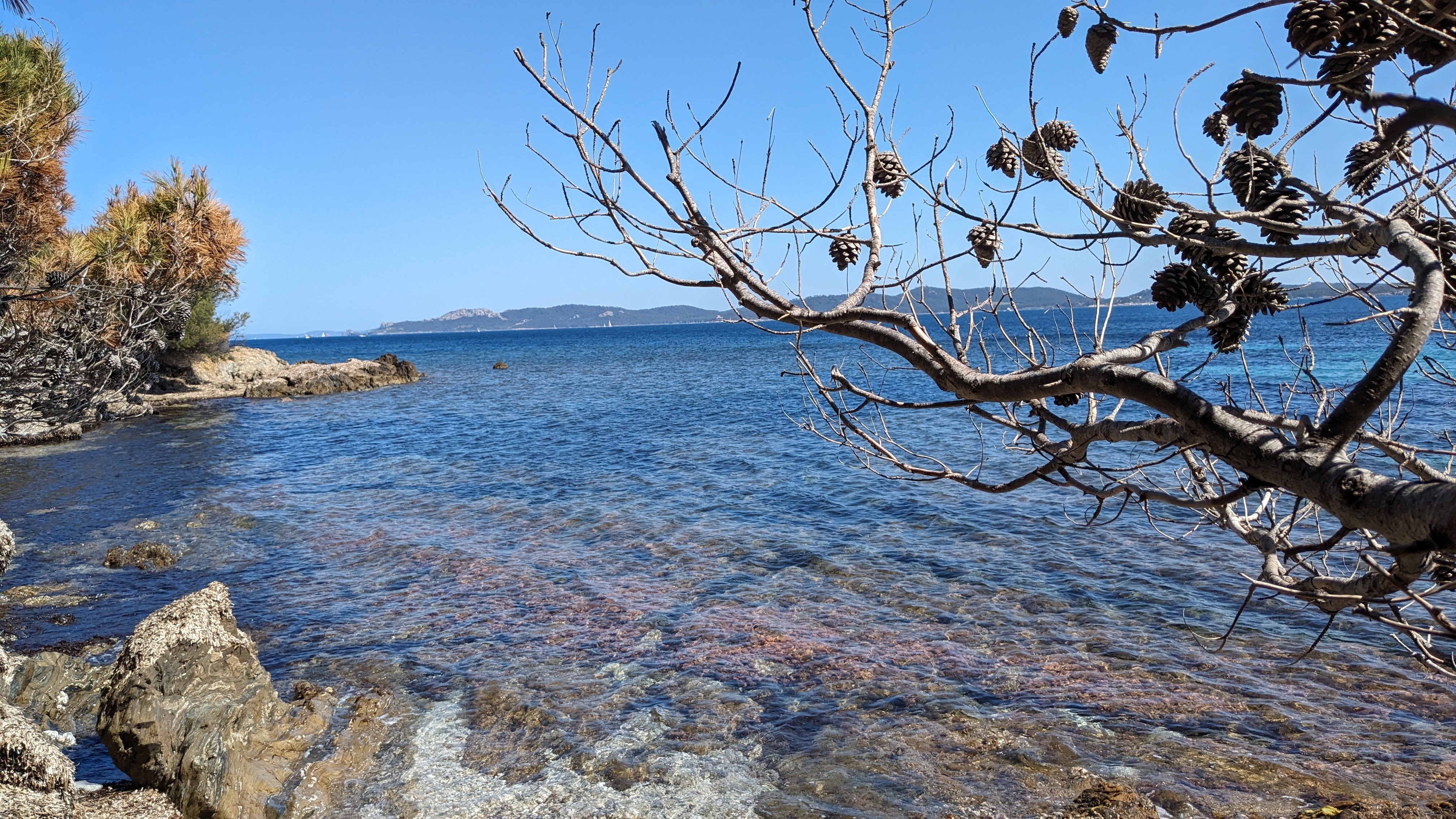 Vraiment un cadre exceptionnel avec de petites criques en bord de mer face à l'île de Porquerolles,de plus on peut aller à pied à l'embarcadère pour aller sur l'île en 15 mn à peine.... Plus besoin de voiture,c'est trop cool.