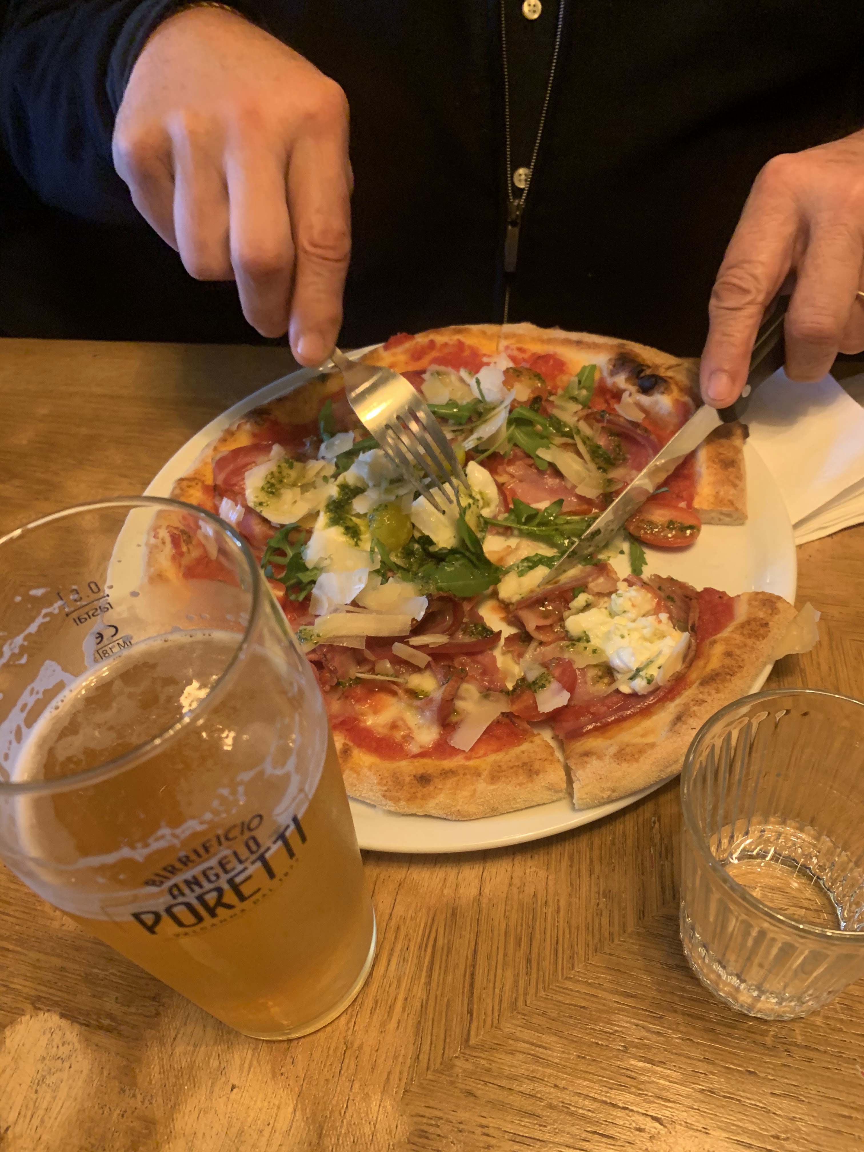 Nous venons de manger la pizza et c'est trop bon ! La croûte est plus fine (notre préférence), belle sélection de pizzas, ils n’en font pas trop sur le fromage, ce qui signifie que ce n’est pas un gâchis gras. Un œuf a été ajouté à notre pizza « Parme » - miam ! Juste assez de chaque garniture. Et très abordable, un excellent rapport qualité-prix pour ce que vous obtenez. Proposez également des plats de pâtes, quelques salades et autres plats. Les plats à emporter sont également une option. Restaurant plus petit, personnel pittoresque et sympathique, sélection de vins petite mais agréable.