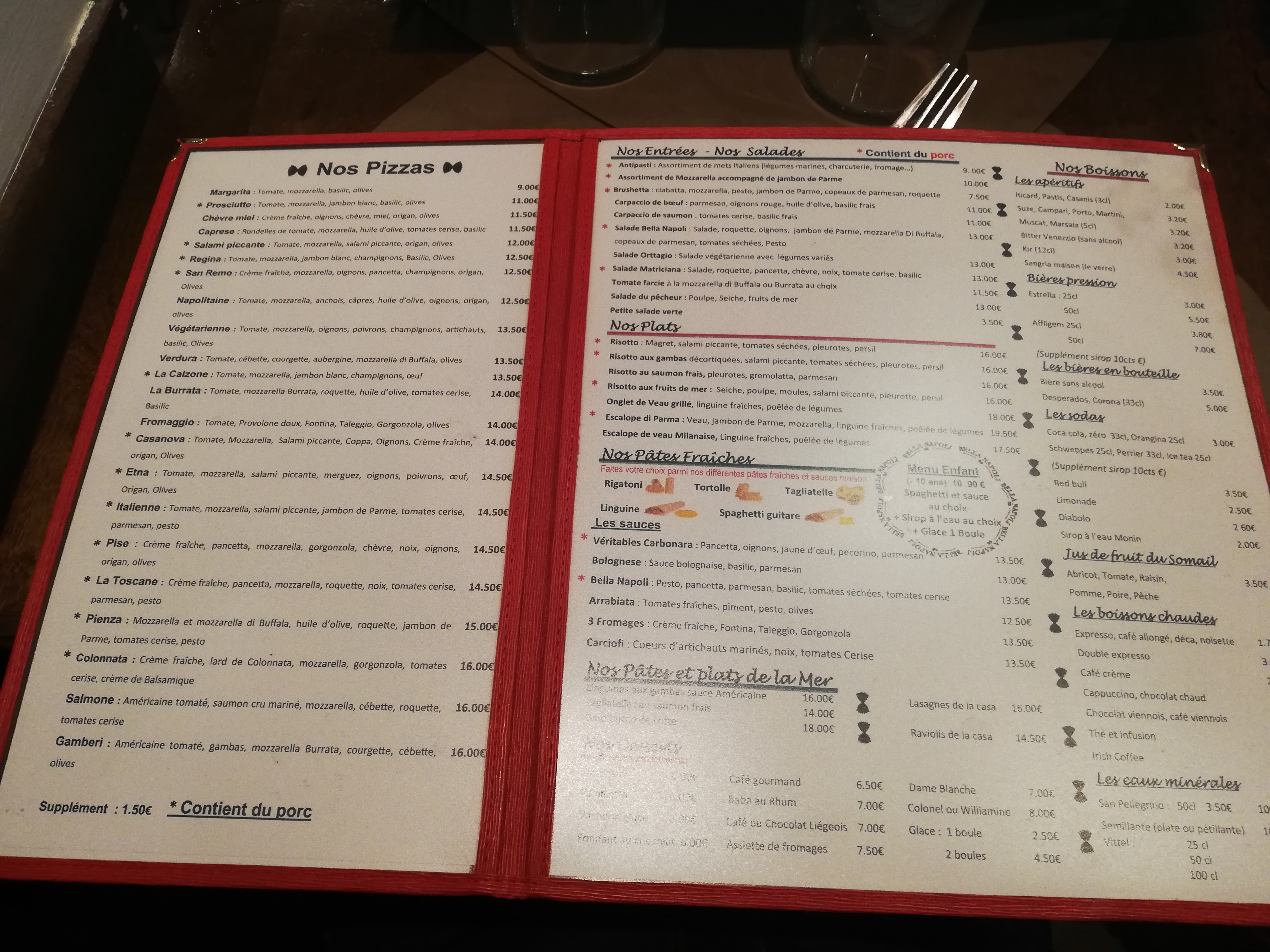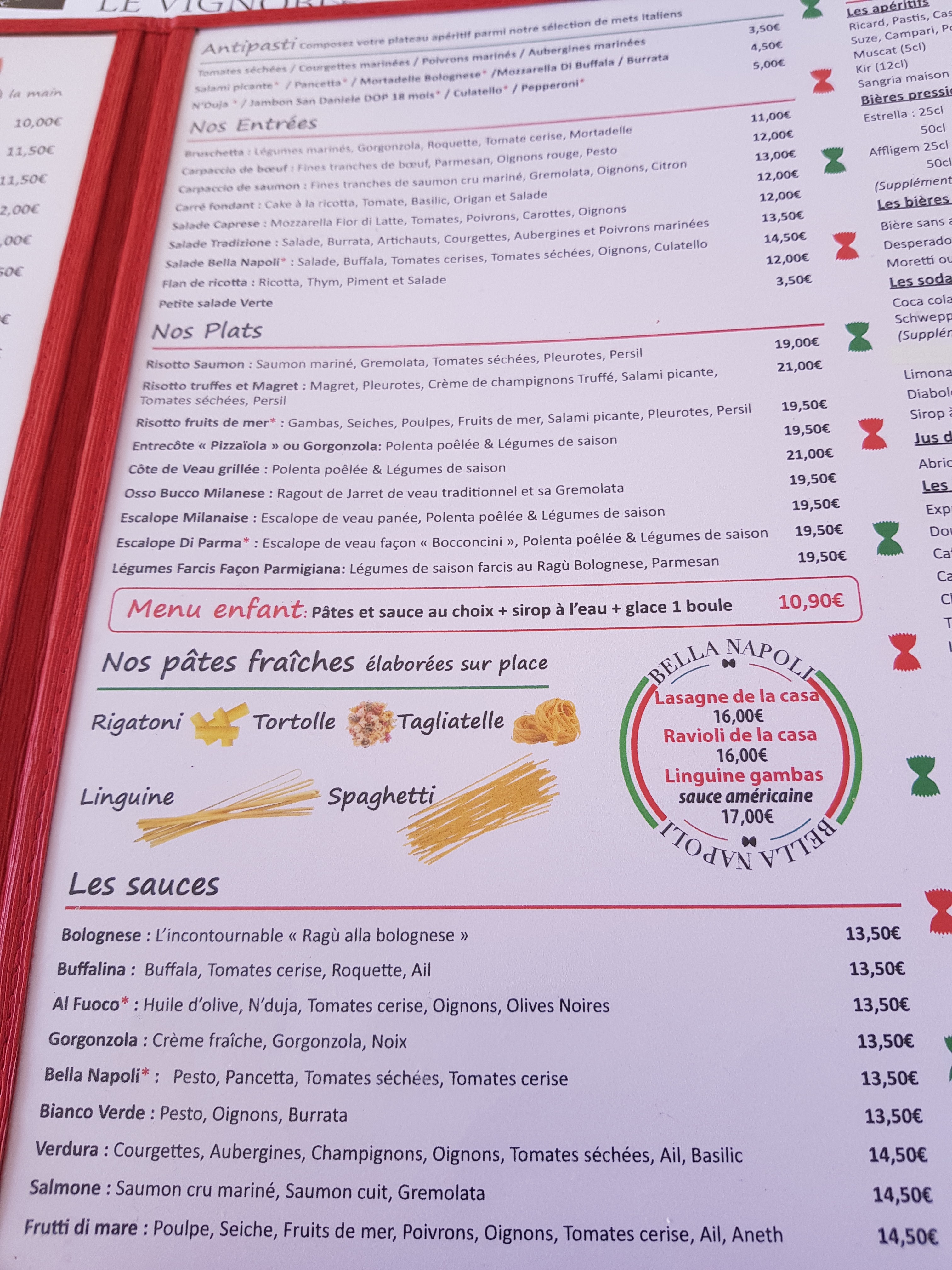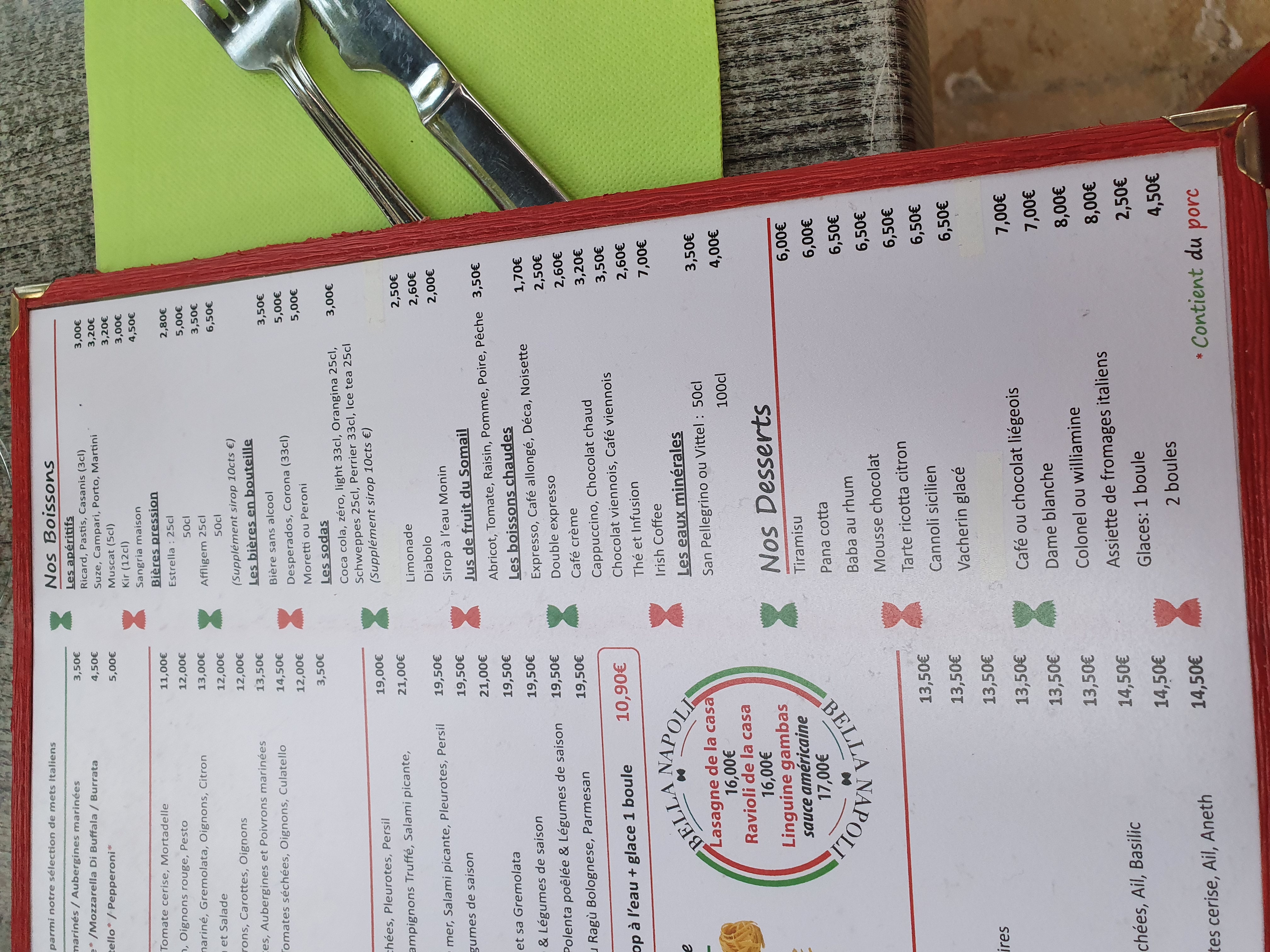 J ai dîner plusieurs fois à bella napoli et il n y avait rien à dire. J y suis retournée la semaine dernière et très déçue : - le menu enfant très cher pour une grenadine, une assiette de pâtes ridicule et une minuscule boule de glace ! - les assiettes de pâtes pour les adultes étaient elles aussi ridicules ! Résultat : nous n avons pas pris le dessert là bas et nous n y retournerons plus