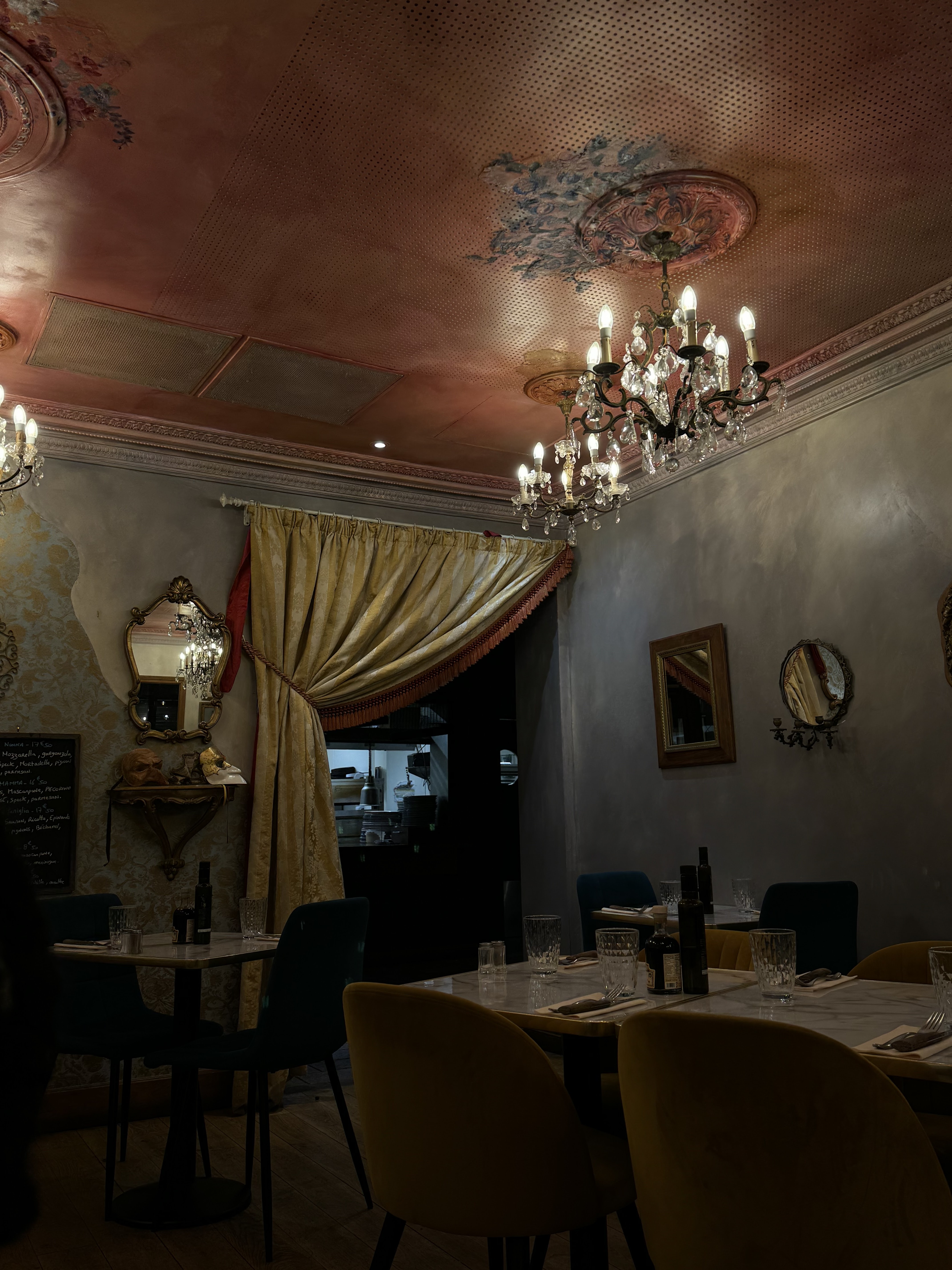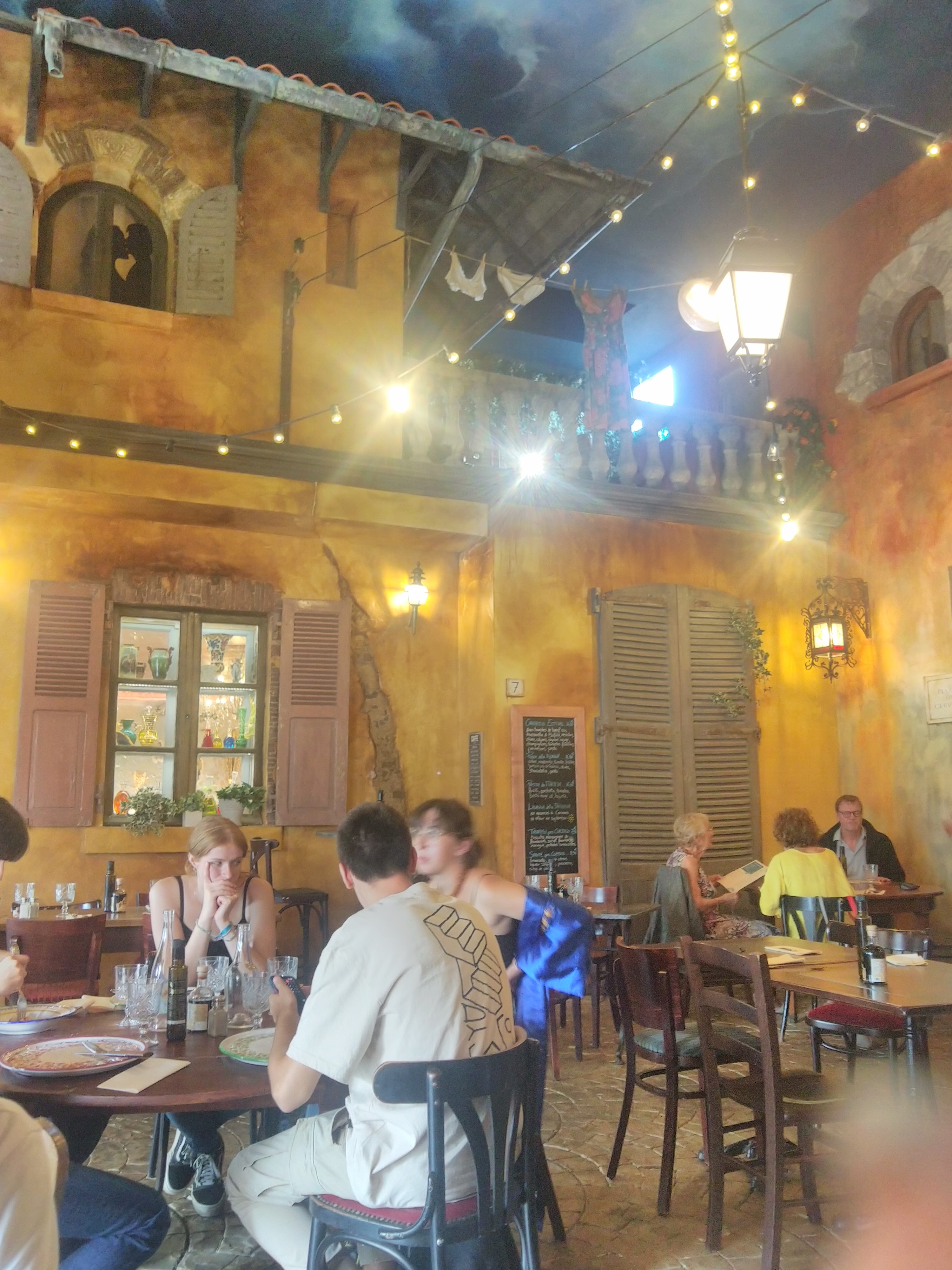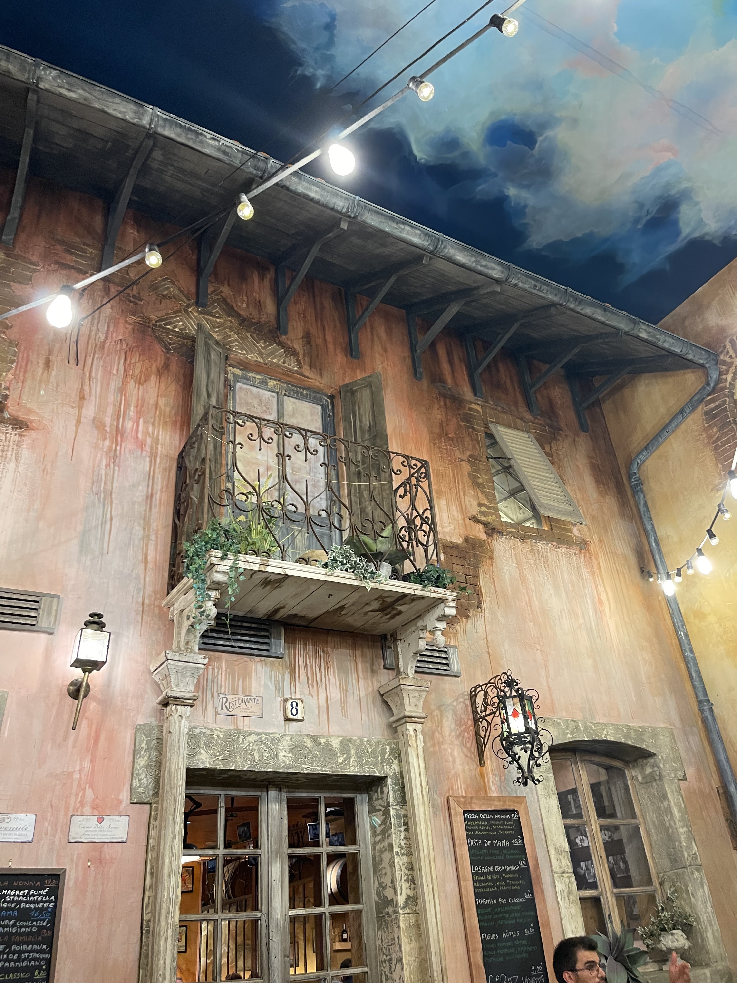 Cadre vraiment atypique et dépaysant; plusieurs ambiances, depuis le salon vénitien jusqu'à la taverne à la lumière tamisée en passant par la terrasse bistrot. Bonnes pizzas, excellentes escalopes milanaises. Tout bien, tout bon; service y compris. Y aller!