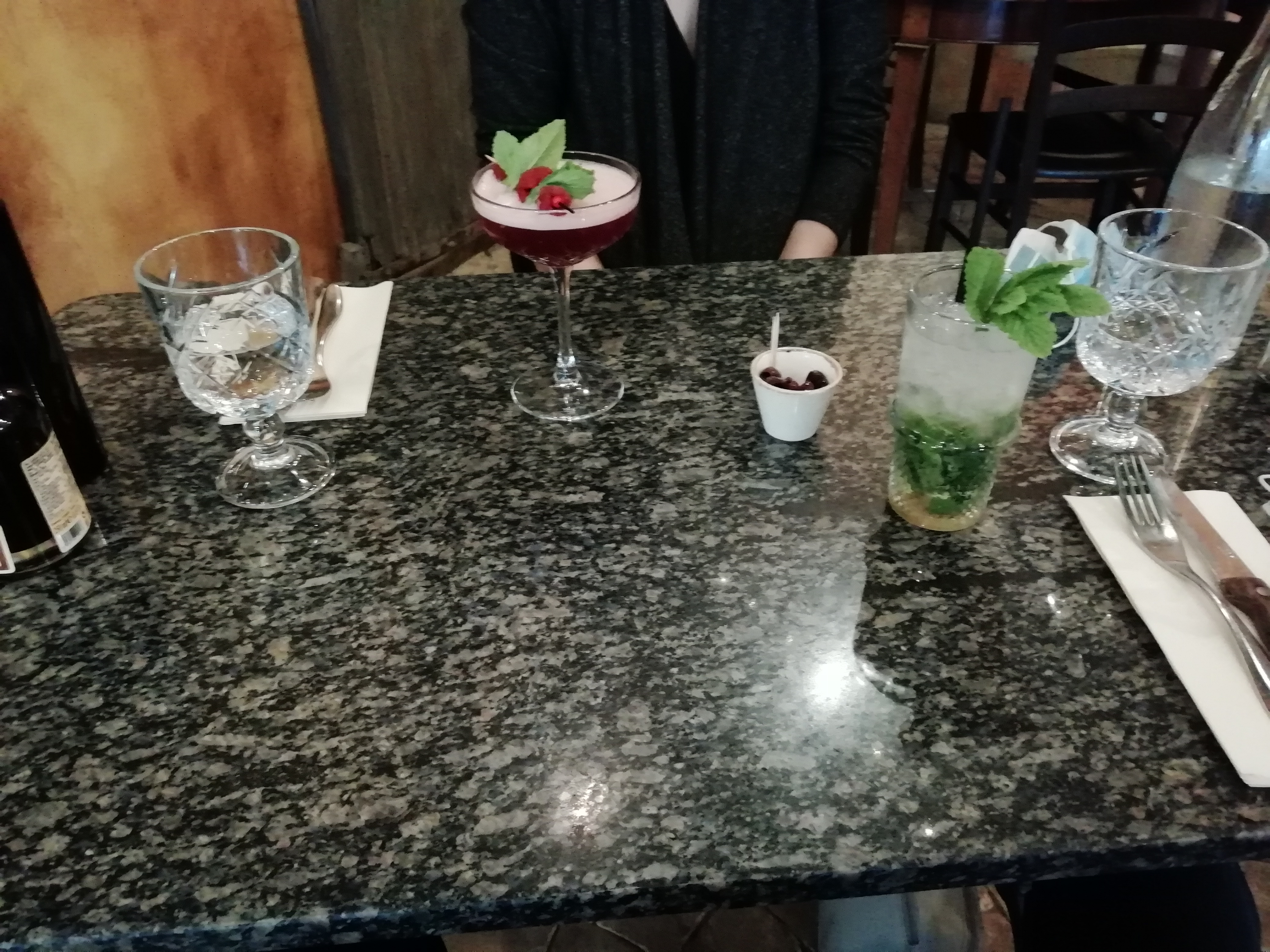 Le cocktail à la violette était sympa, après la pizza j ai trouvé qu il manquait de la garniture et j ai eu du mal à la couper et le dessert surment congelé j ai pas fini