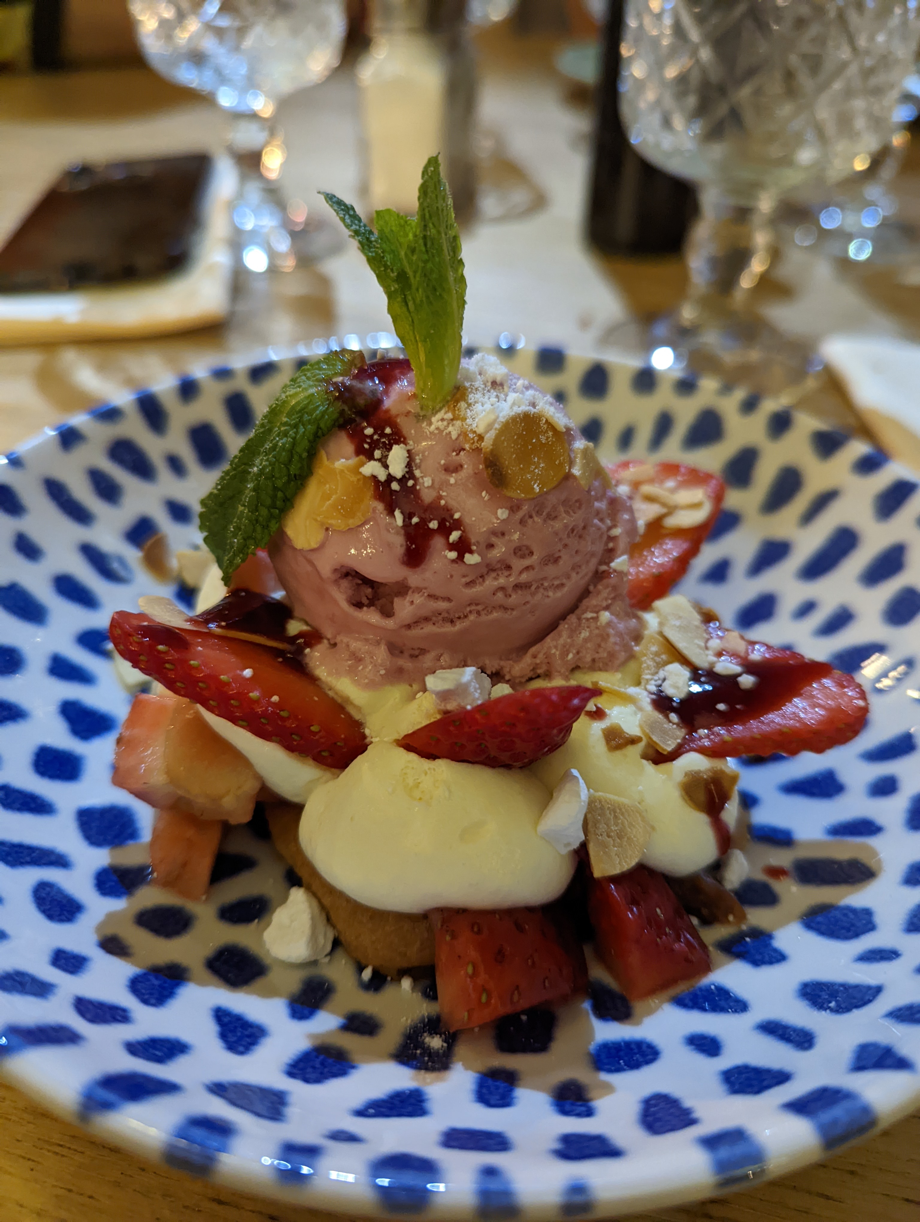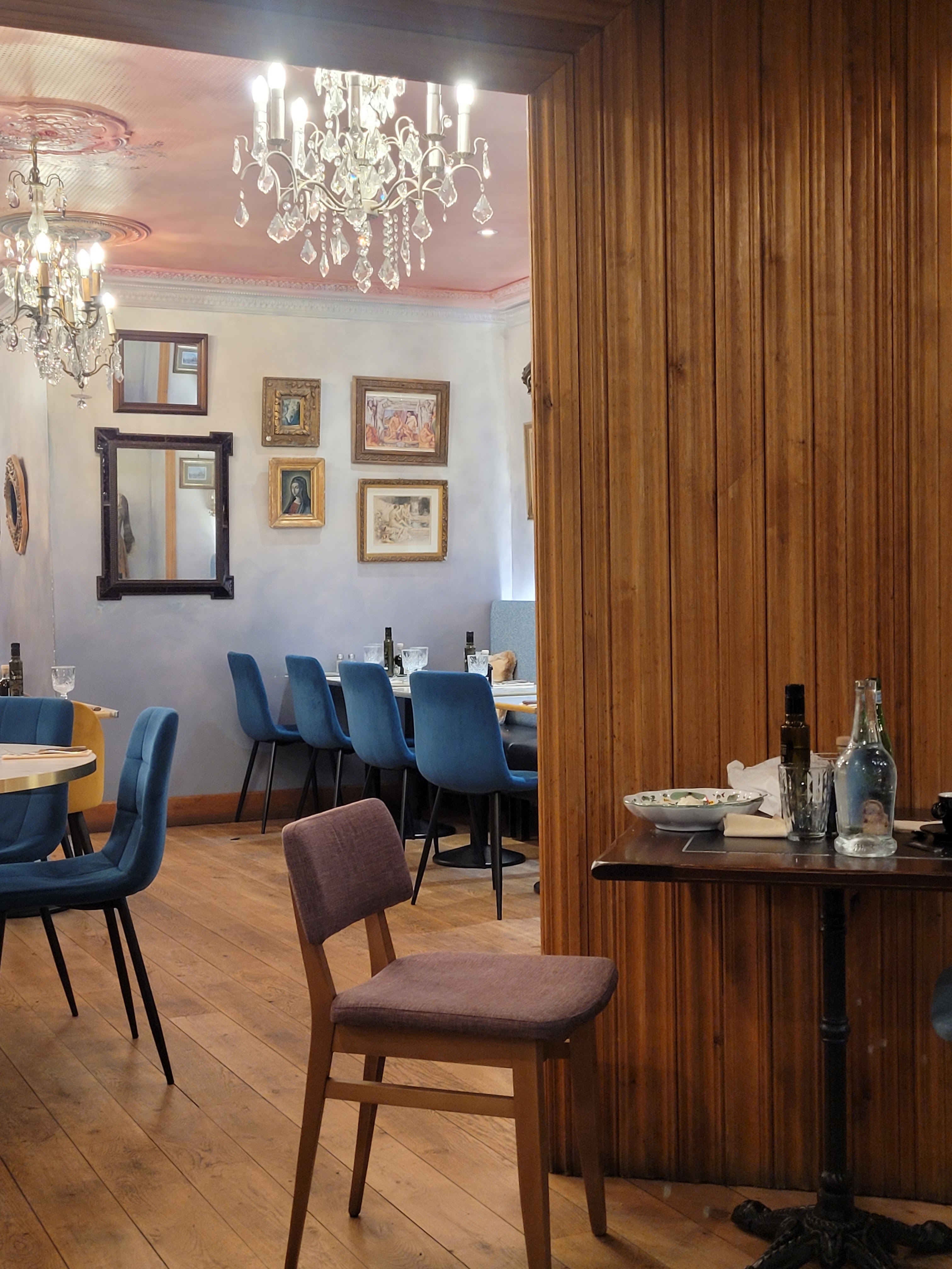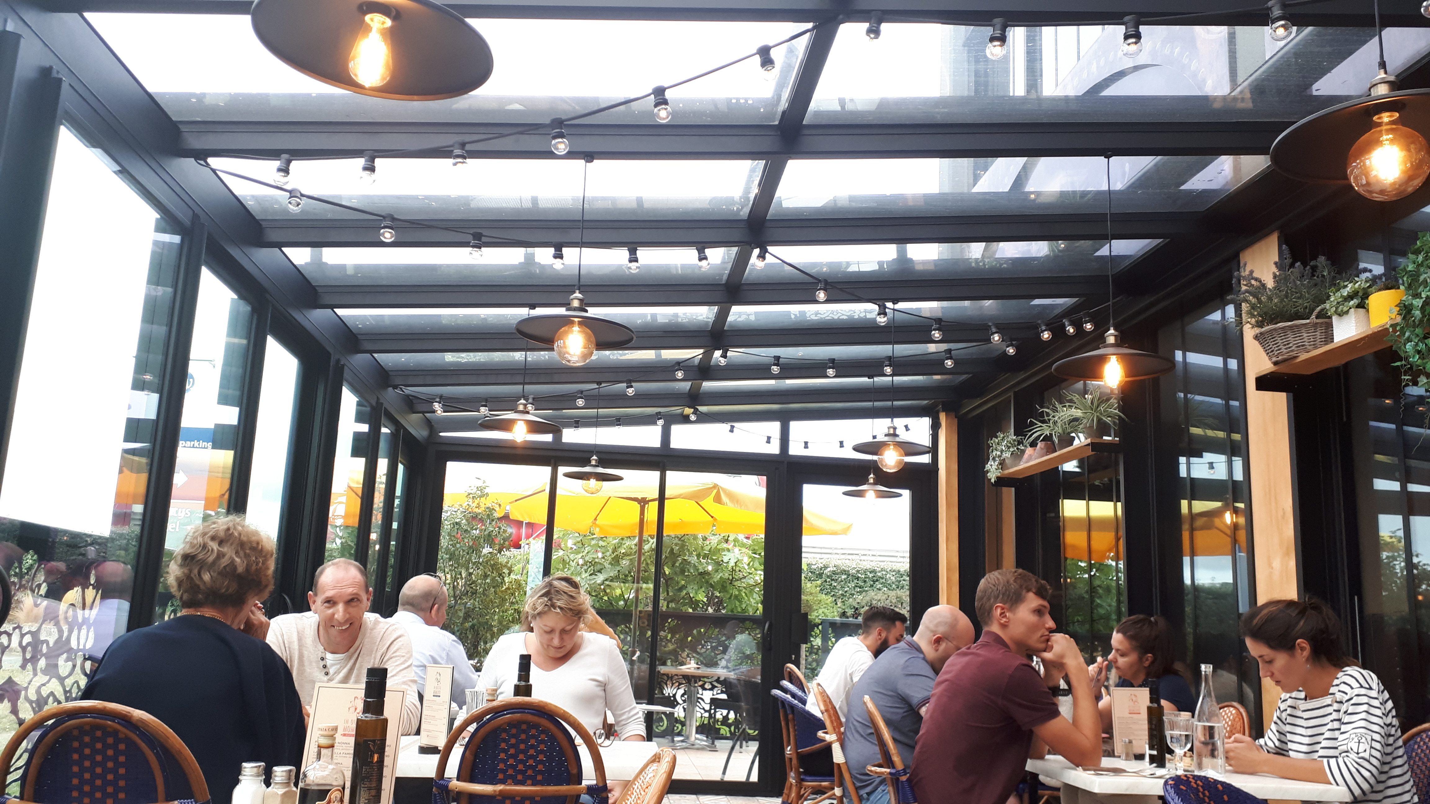 Déco très sympa. Par contre service un poil trop rapide. On nous a servi l apéro en même temps que le vin et les entrées 😅 pâtes au pesto un poil séches par contre tiramisu fraise déstructuré très bon!