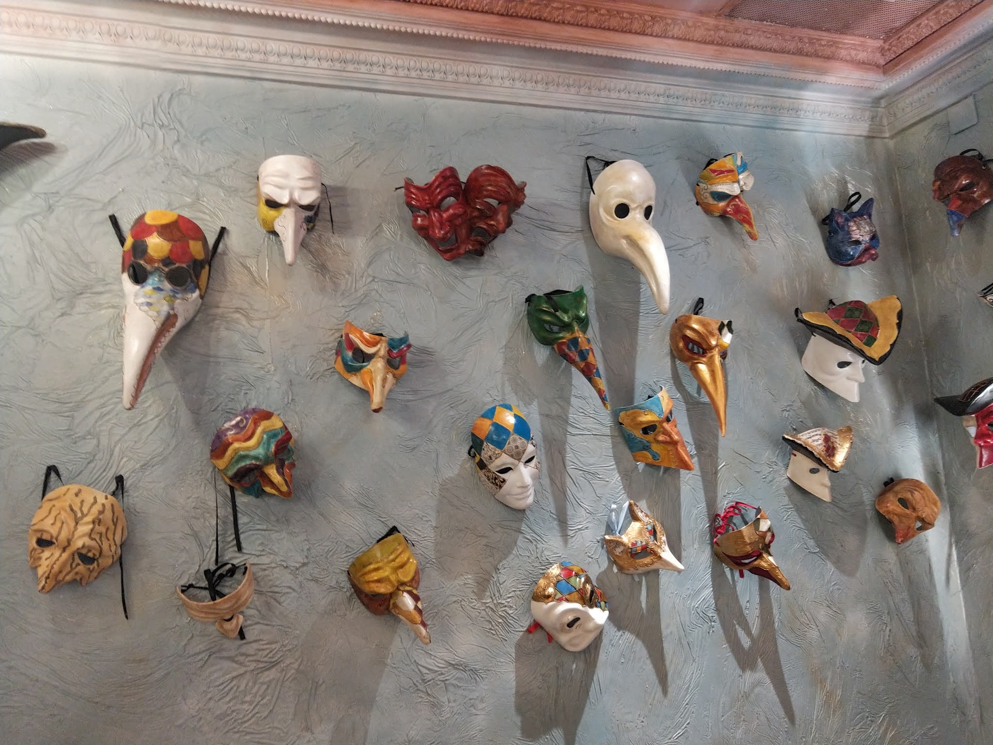 ❝ Murs paprika ornés de masques vénitiens et barriques en guise de tables hautes dans un restaurant italien. ❞
