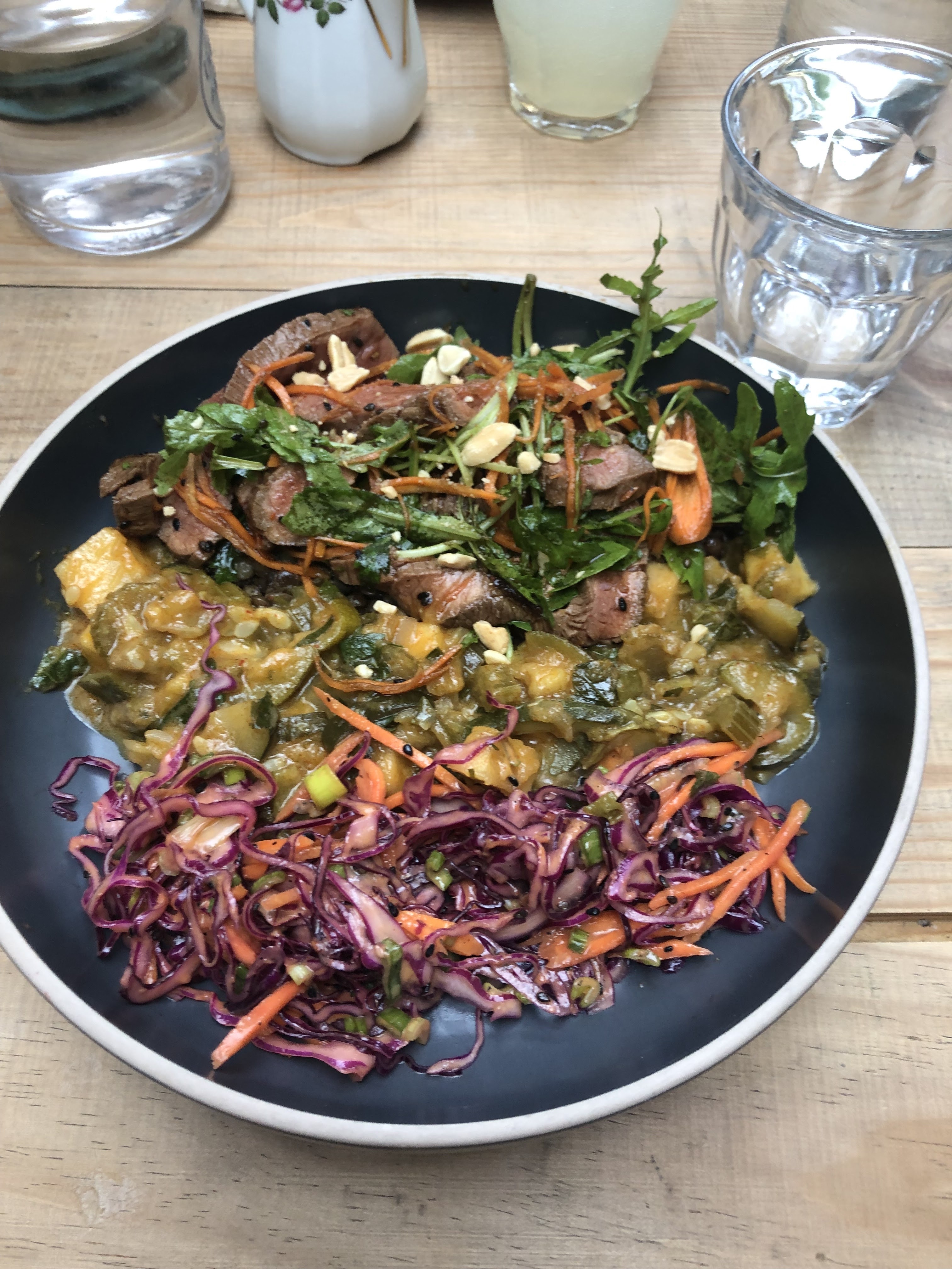Très belle découverte dans le quartier ! Le lieu est très sympa et les plats sont délicieux ! Une vraie recherche dans les saveurs. Il y a 2 choix : végétarien ou viande, et 2 accompagnements principaux au choix, puis après il y 2, 3 petits accompagnements identiques pour tous. Un seul dessert, ce qui peut est dommage selon moi : un choix fruit et un choix plus gourmand comme chocolat serait le top 😋