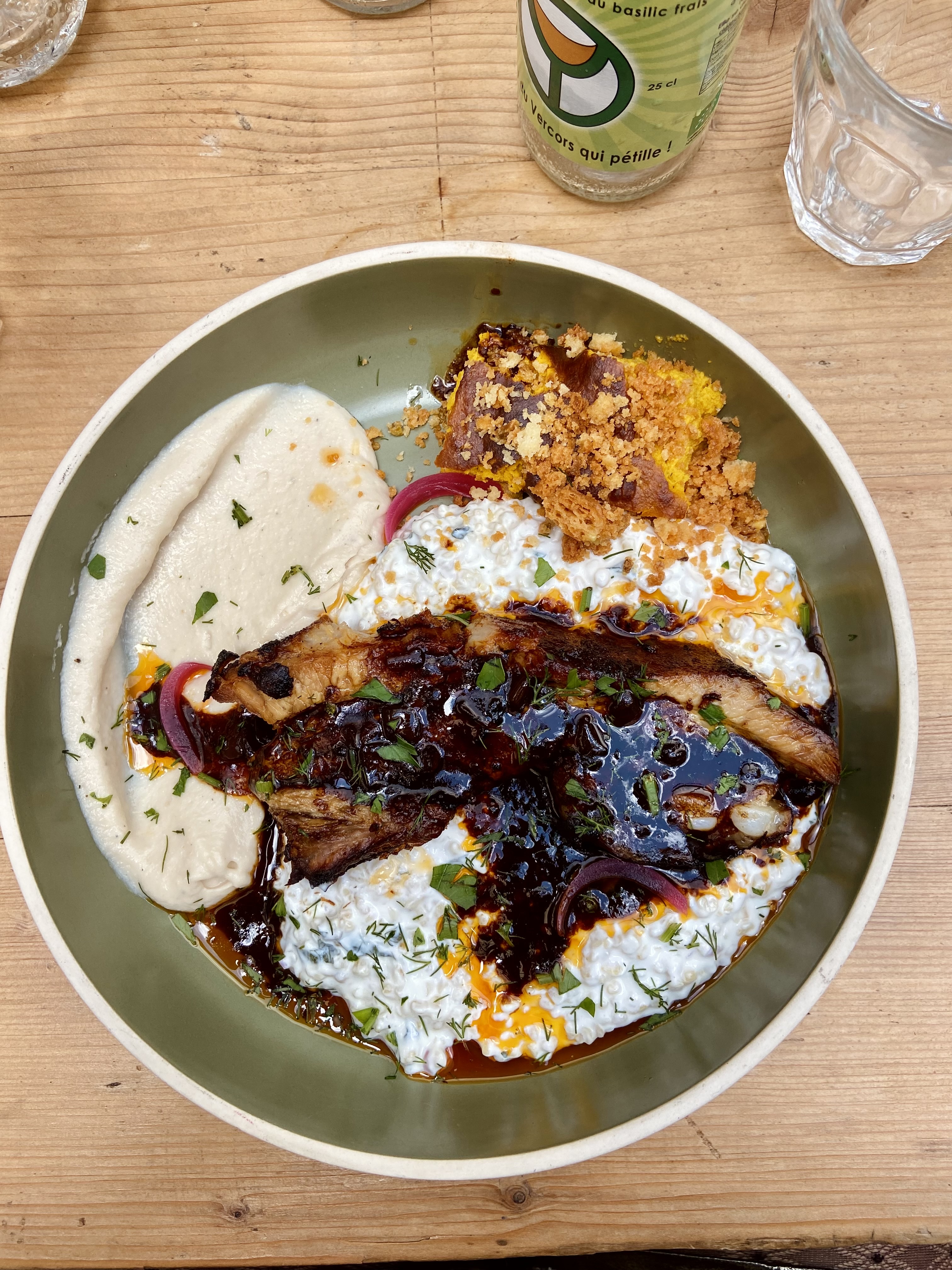 Voilà une super cantine guinguette ! La cour intérieur est très agréable et on a adoré l’ambiance avec des jolis meubles dépareillés et de la belle vaisselle. Les deux gérantes ont le sourire derrière le masque, ça se sent ! On a été reçu très chaleureusement. A l’heure de l’apéro, on s’est régalé avec des tartinades maison savoureuses. Il paraît que le chef change régulièrement de recettes, ça donne envie de revenir. Une belle adresse dans le quartier !