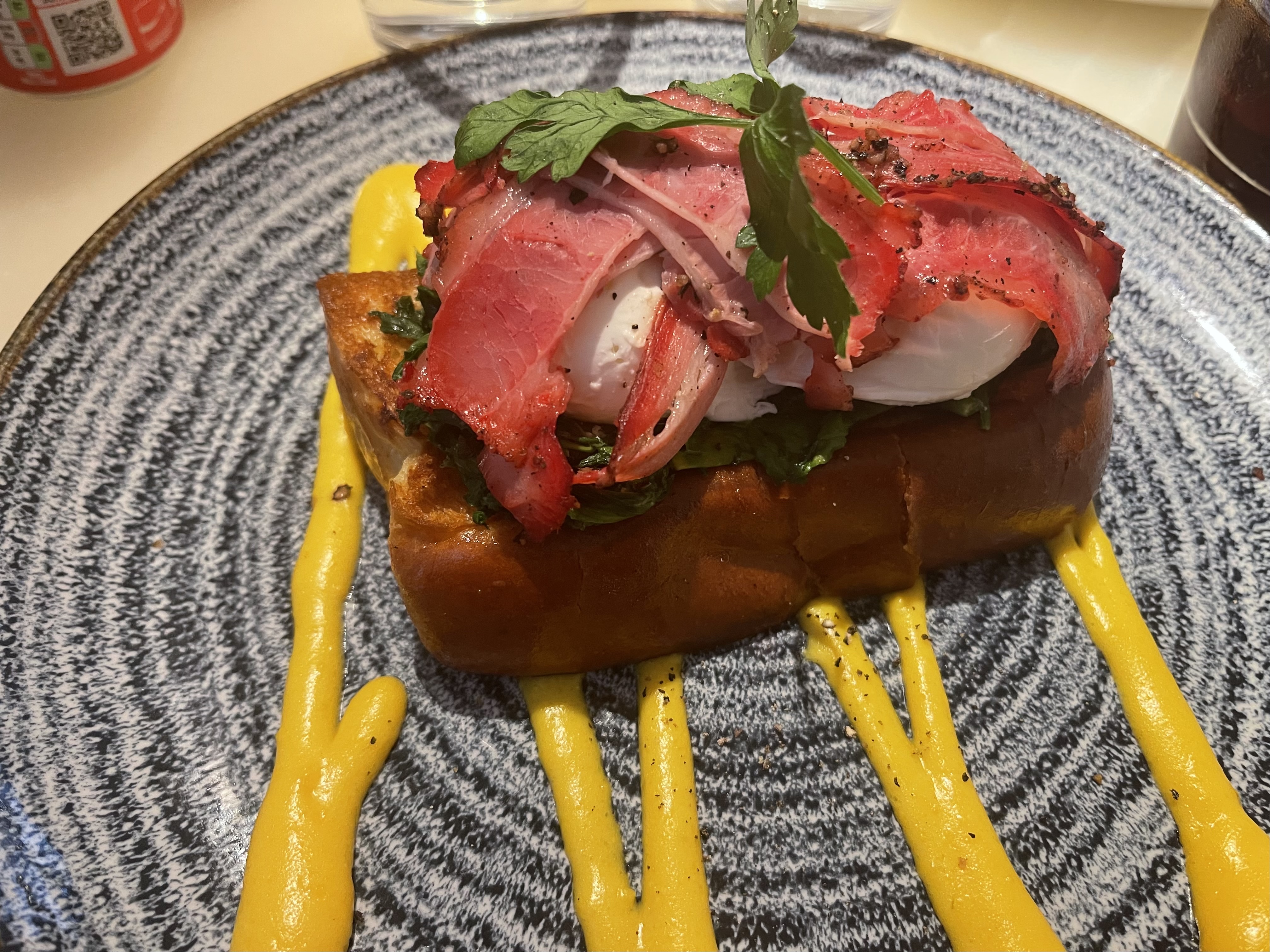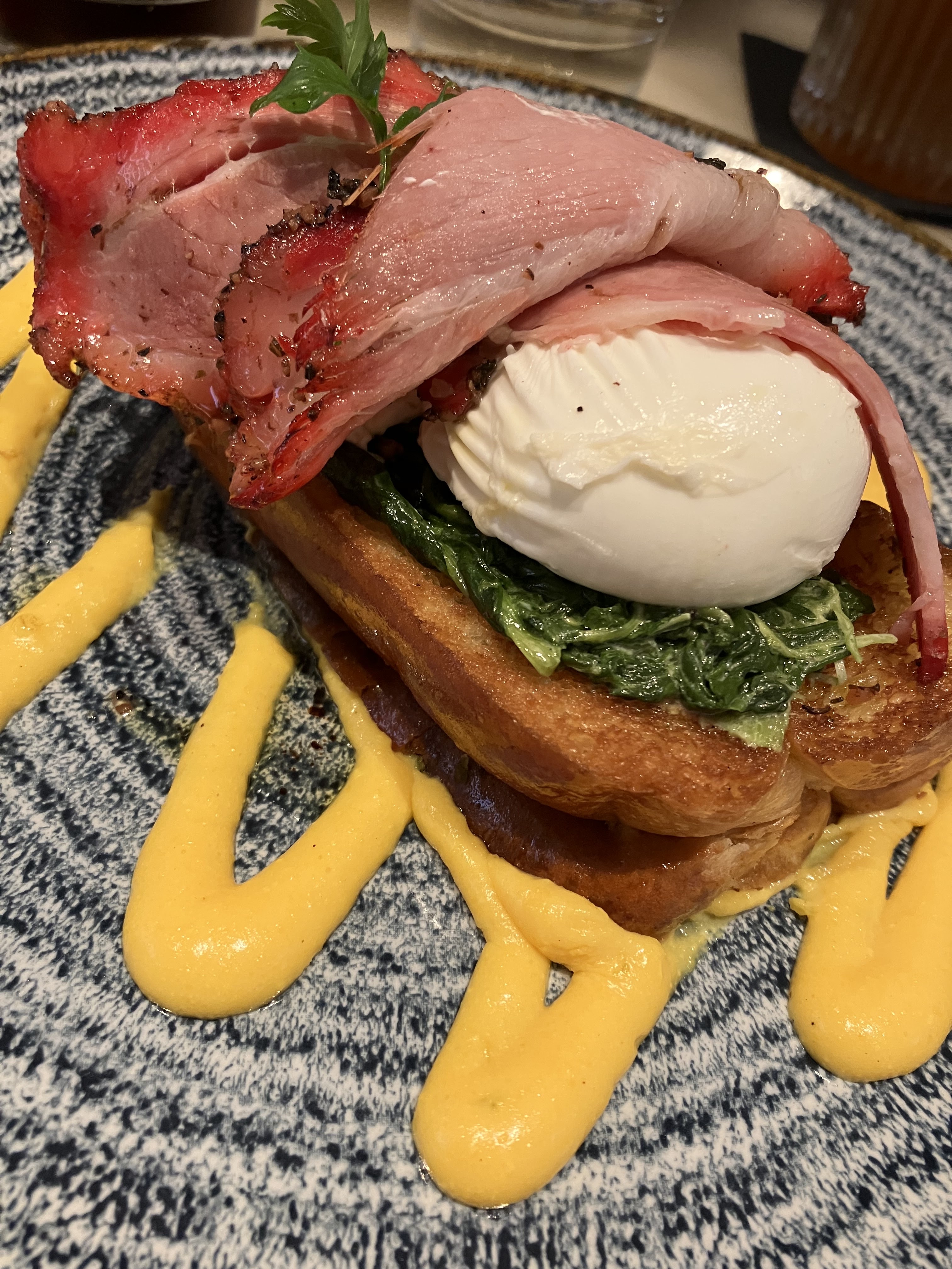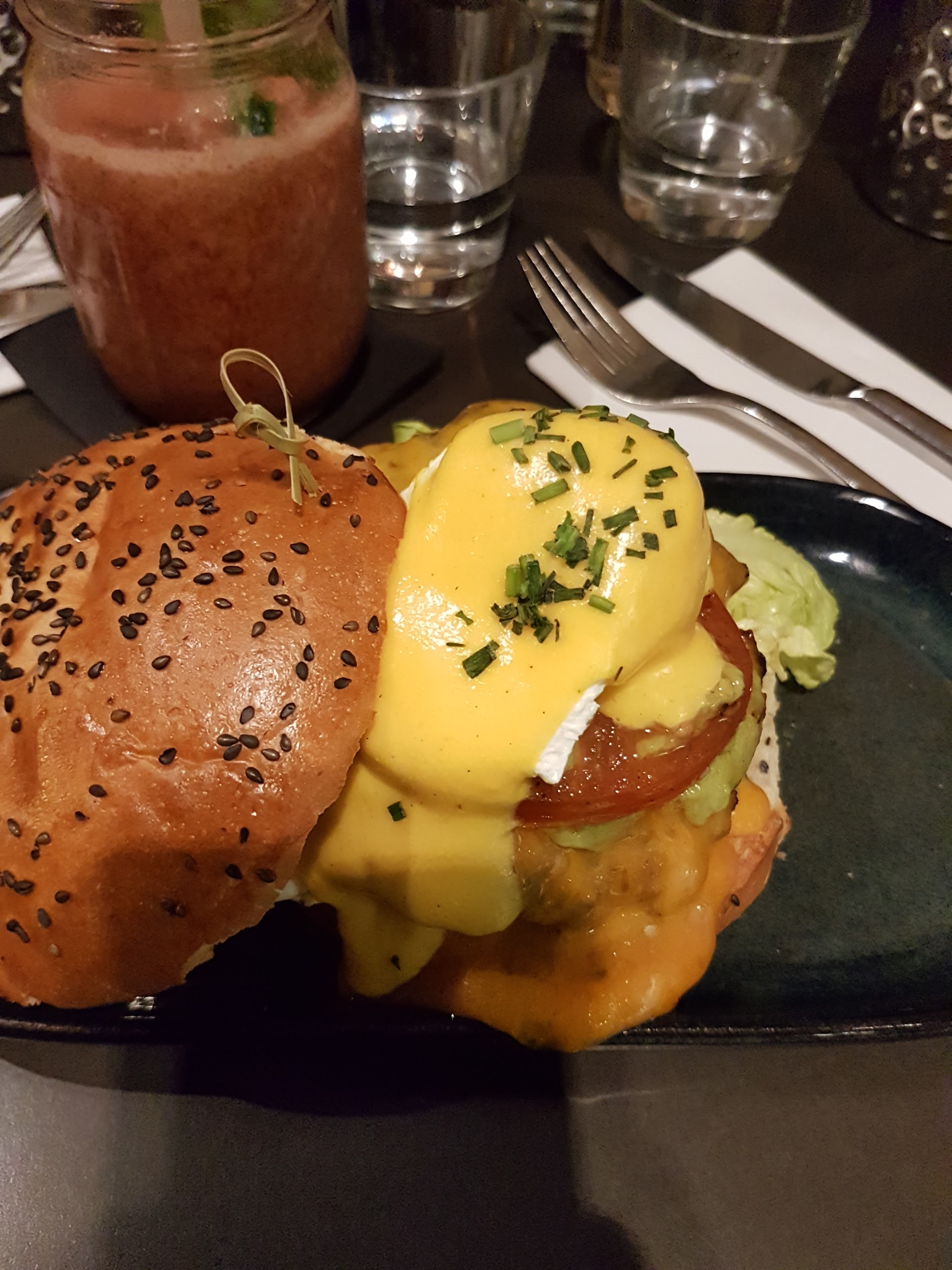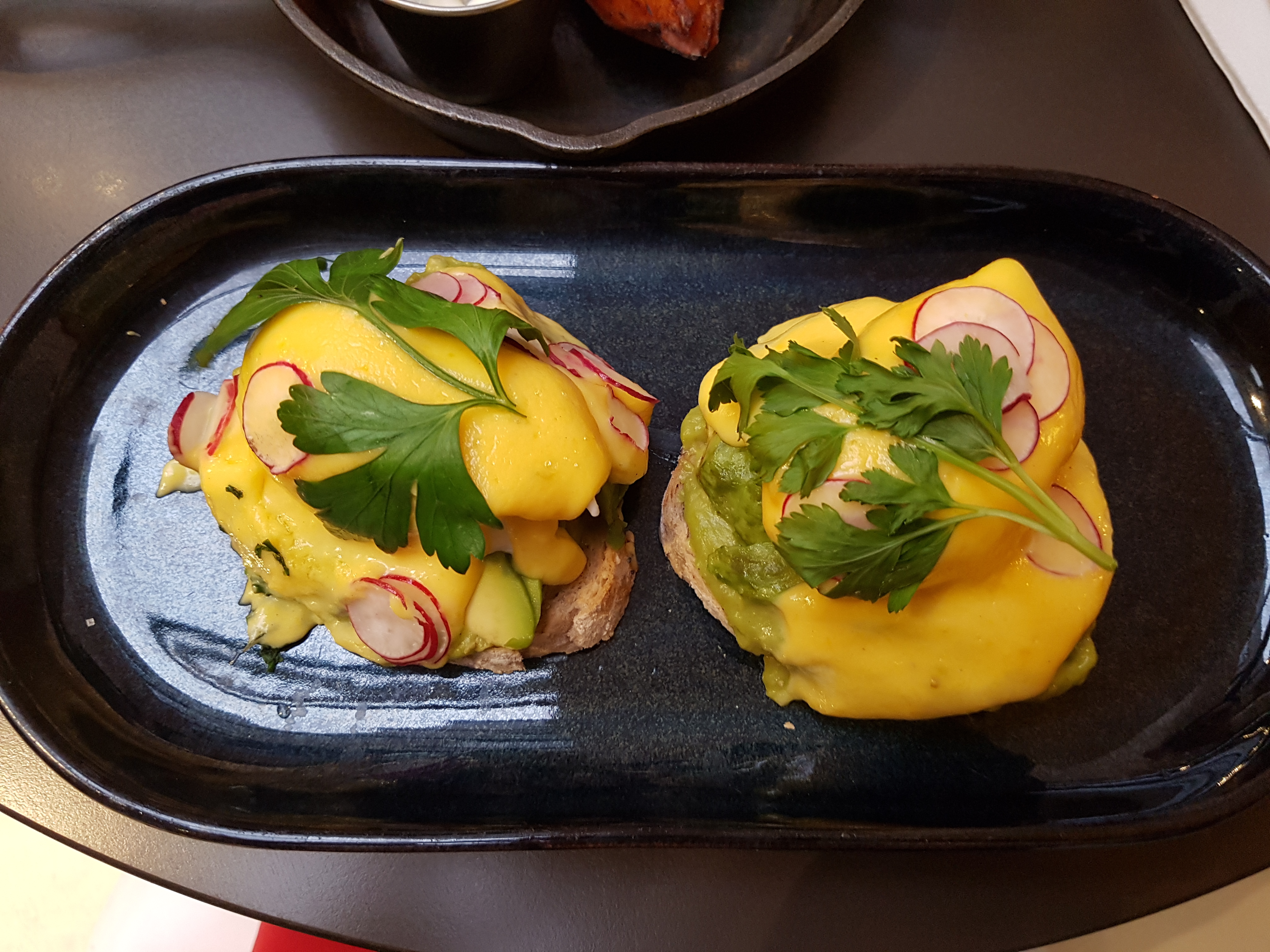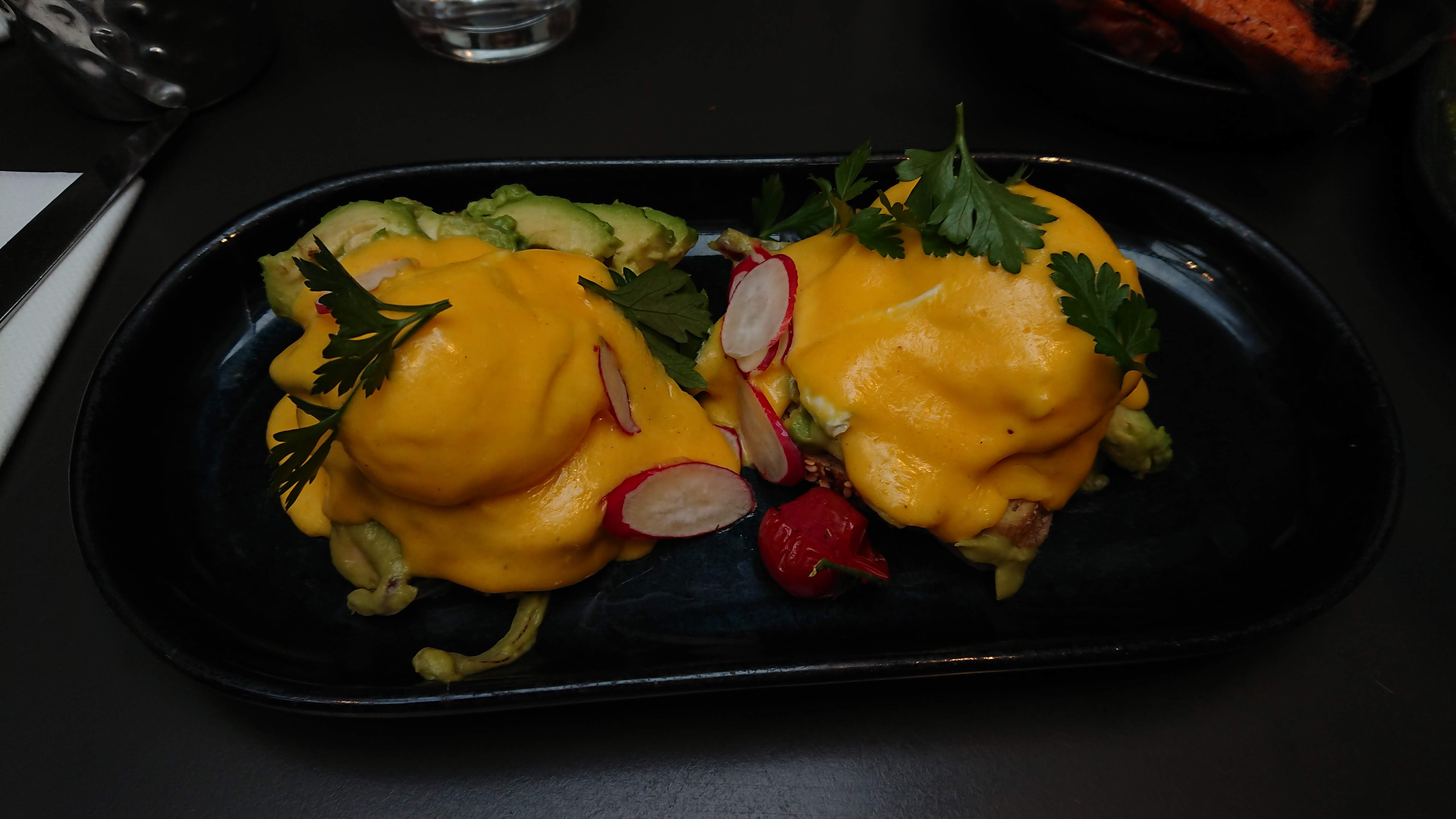 Un resto brunch spécialisé dans l’oeuf benedict, pancakes, burger avec foie gras et sauce truffe. Les patates douces grillées sont super bonnes (sans sauce) et bien sucrées. Framboise de bonnes qualités. Le saumon grillé est bien croustillant au dessus mais la sauce qui va avec est moyenne.