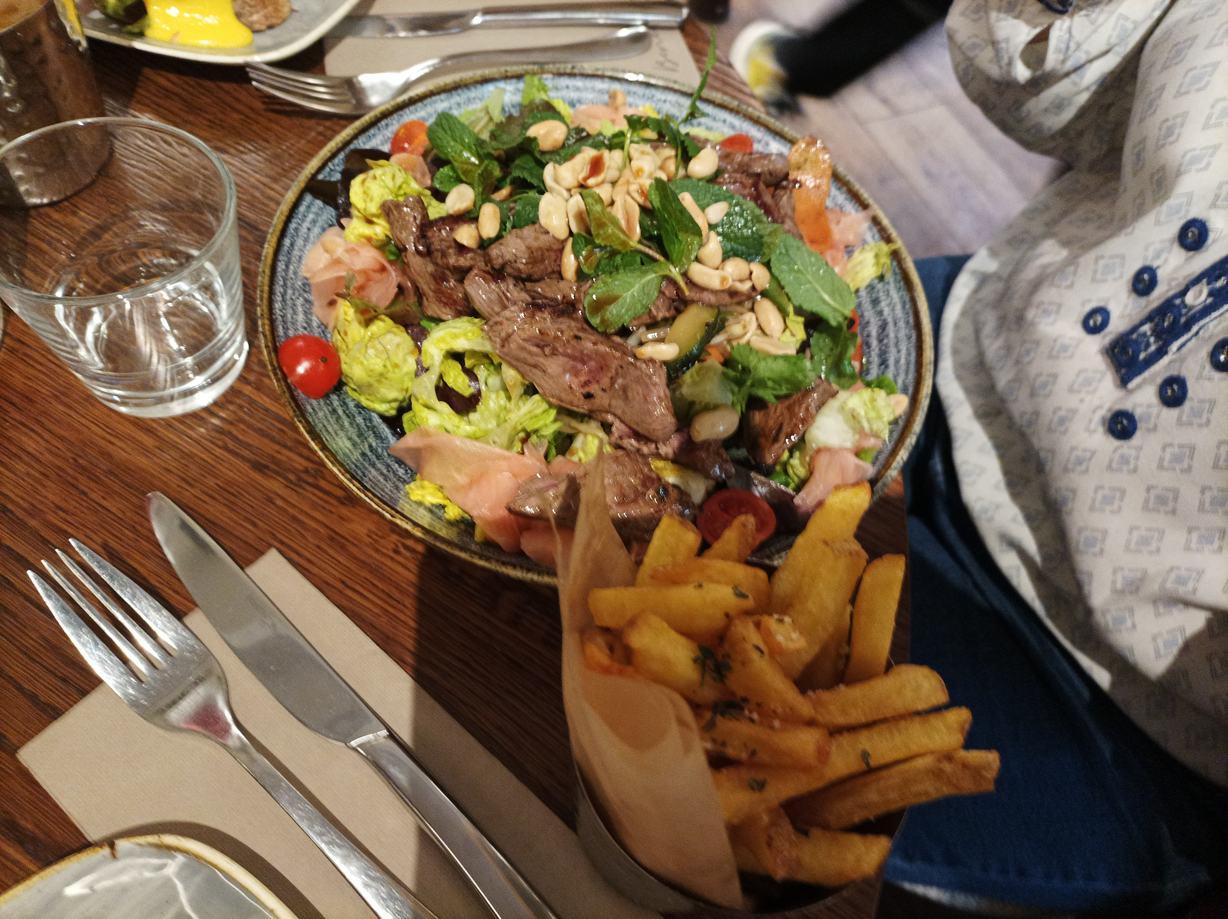 Plats bons, beaux et copieux. Bons cocktails (non alcoolisés) mais un peu trop sucré à mon goût et les frites étaient trop frits du coup il n’y avait pas le moelleux de la frite. C’était plus chips que frite, dommage. En revanche la patate douce était très réussie, un délice. Endroit spacieux et chaleureux, les prix sont corrects pour le quartier du Marais. Je vous conseille !