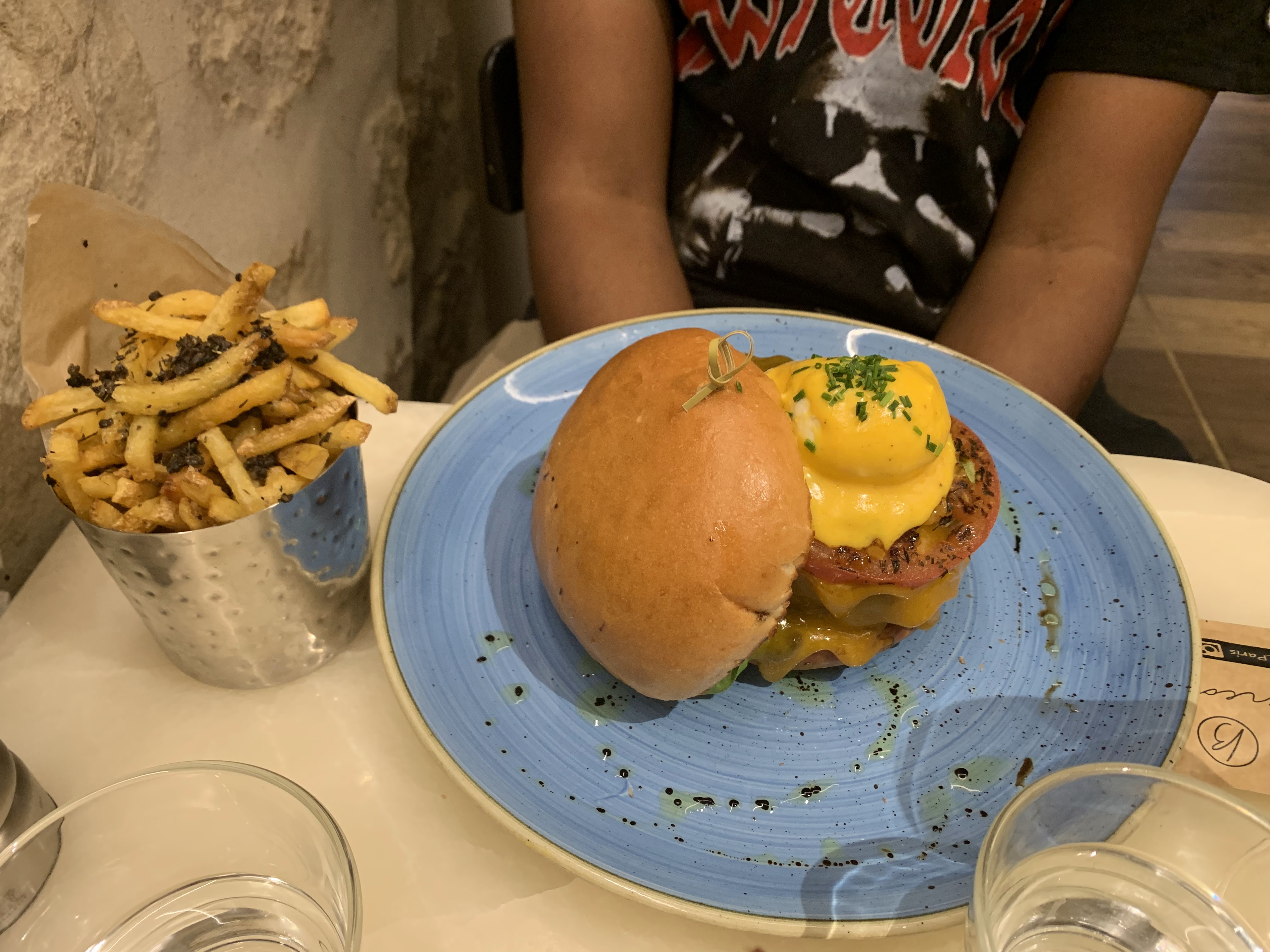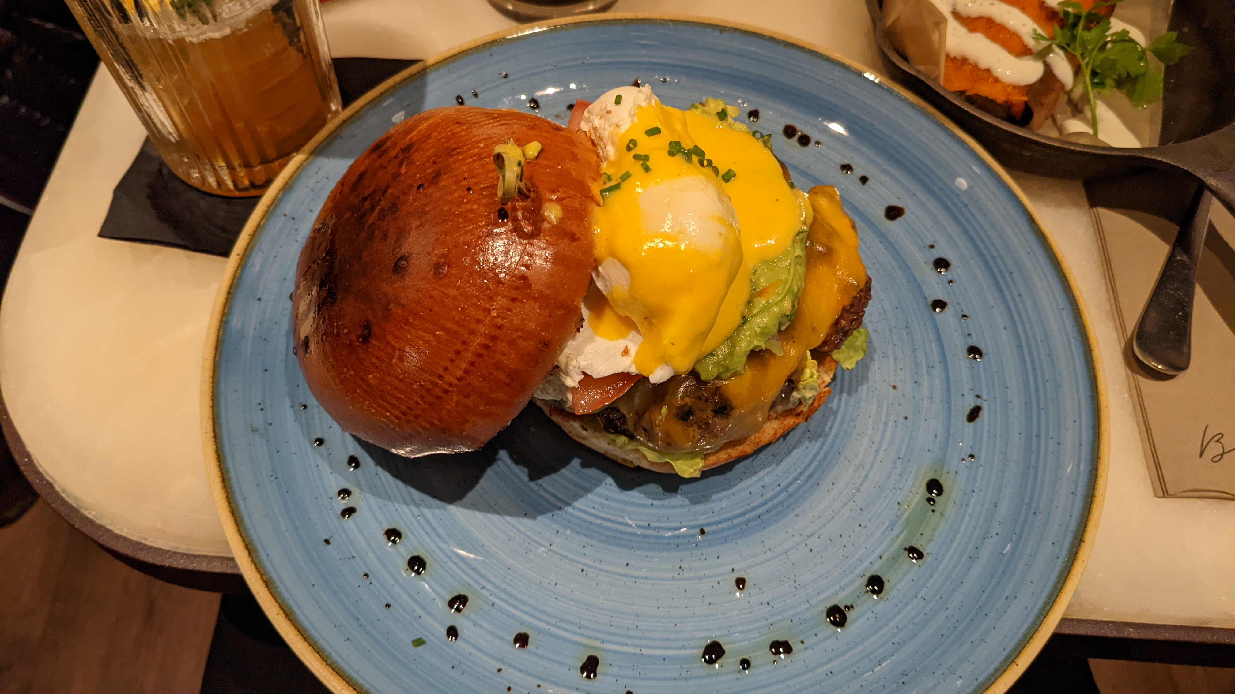 Le Burger avec son œuf poché dessus avait l'air bien appétissant, dommage que l'oeuf et la viande soient froides à l'intérieur. La bière Schwartz machin était délicieuse et rien à dire pour le service.