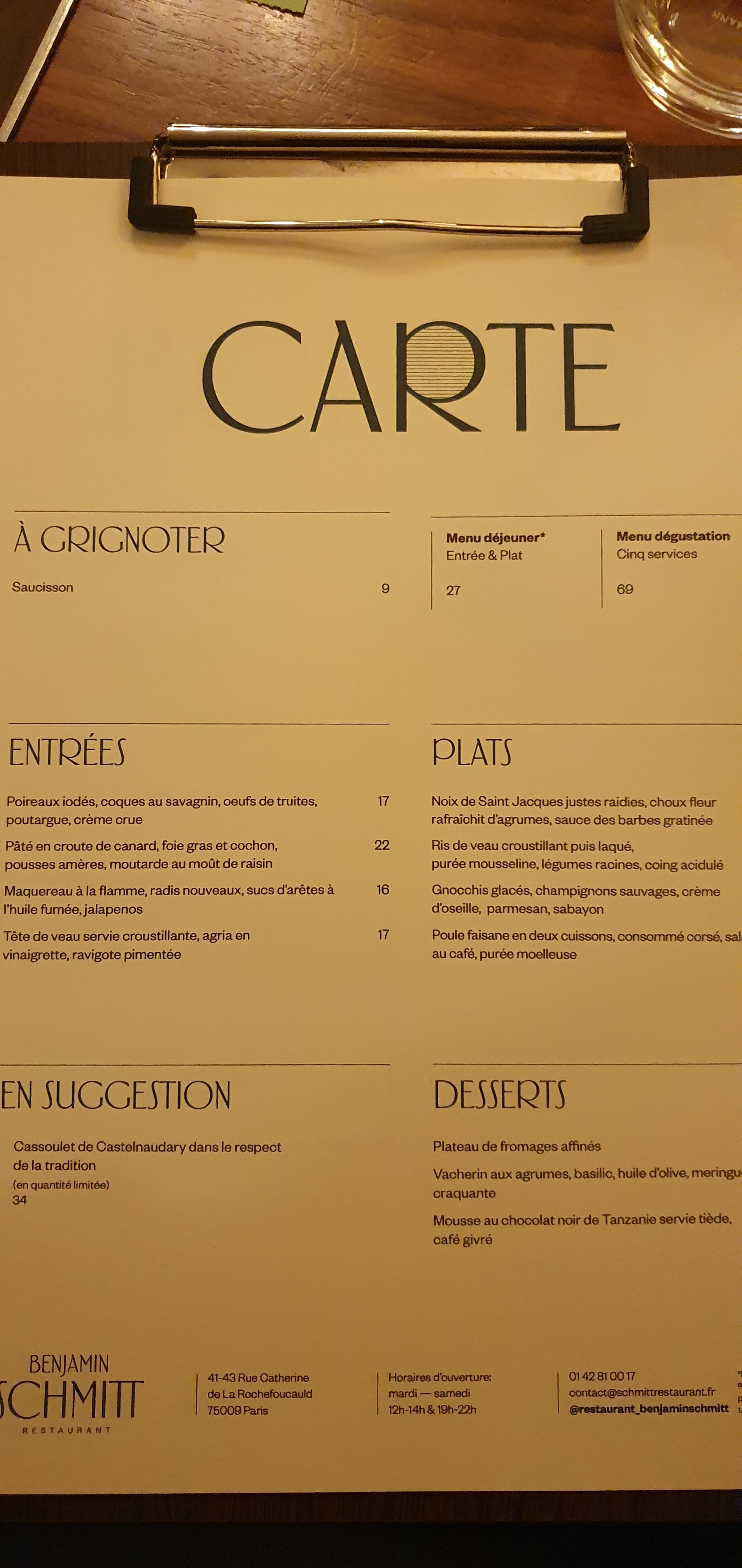 Enfin l'adresse personnelle du chef Benjamin Schimdt. J'ai découvert sa cuisine au Taillevent, puis changé ma table pour le péninsula. Suis content de redécouvrir sa cuisine dans un style plus personnel et toujours élégant.