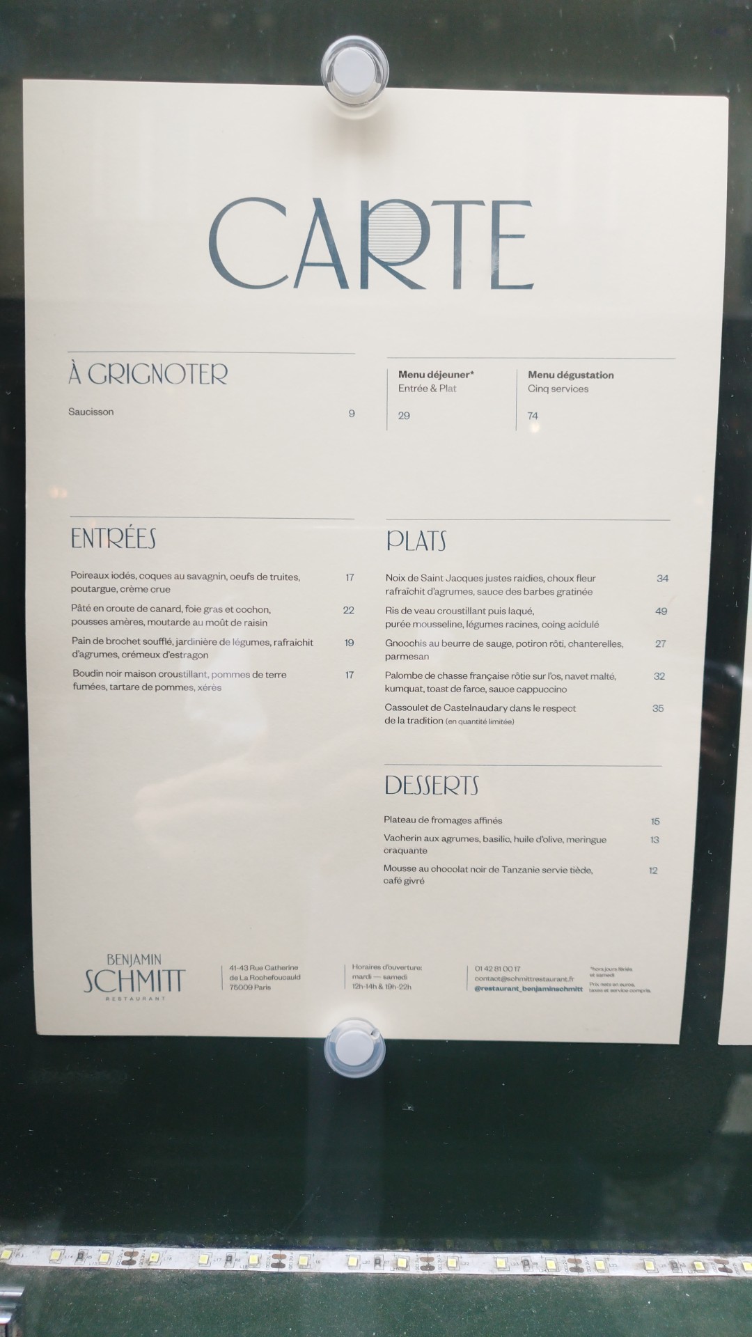 Nous avons passé un excellent repas chez Benjamin Schmitt ce soir. Je suis allé dîner tard. Les serveurs étaient très serviables, parlaient anglais et connaissaient bien la nourriture et le vin. Deux d'entre nous ont pris l'agneau et les raviolis végétariens. Les deux étaient excellents, très savoureux et juste ce qu'il fallait de nourriture. Le serveur a suggéré un cab sauvignon et un cab franc, qui s'accordaient bien avec la nourriture. Les serveurs étaient très attentifs. Plus tard, le chef propriétaire est venu et nous avons eu une discussion sur les combinaisons mets et vins. Le chef consacre beaucoup de temps à s'assurer qu'il obtient les meilleurs vins à un prix raisonnable pour la nourriture servie. J'y retournerais certainement. Deux verres de vin, deux plats et un dessert coûtaient 95 euros, ce qui est un bon rapport qualité-prix.