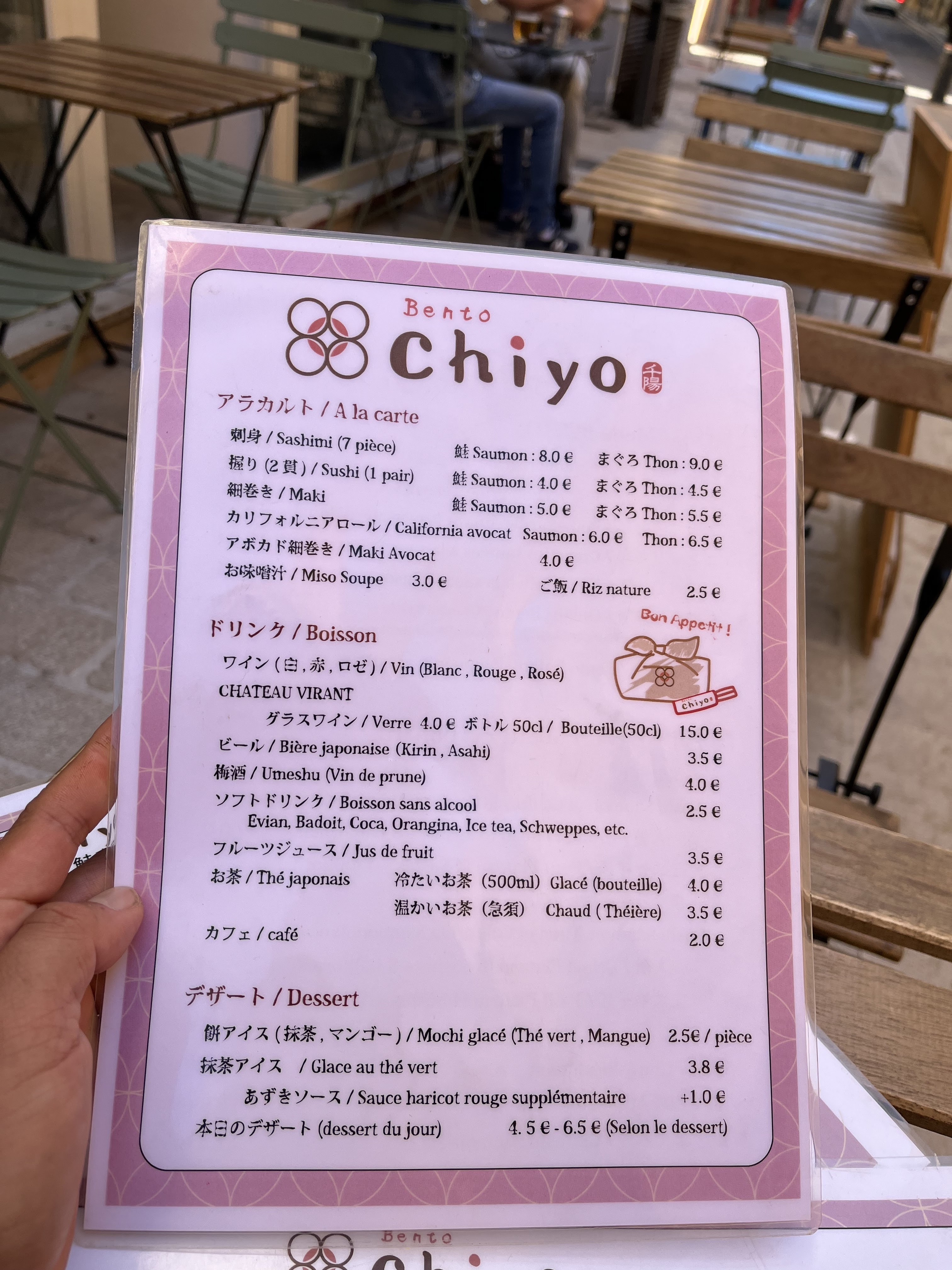 Le repas était délicieux. J'ai commandé un plateau de sushi saumon/thon et un bento Onigiri. Les deux étaient incroyable. Il faisait froid et nous attendions dehors (par choix) que la commande soit prête et on nous a offert une boisson chaude pour nous réchauffer. En plus sur chaque chaise dehors il y avait un petit plaid afin de se réchauffer si l'ont mange dehors. L'ambiance était vraiment incroyable, hâte d'y retourner !! Je recommande à fond et en parlerais a toutes mes connaissances qui vont à Aix !
