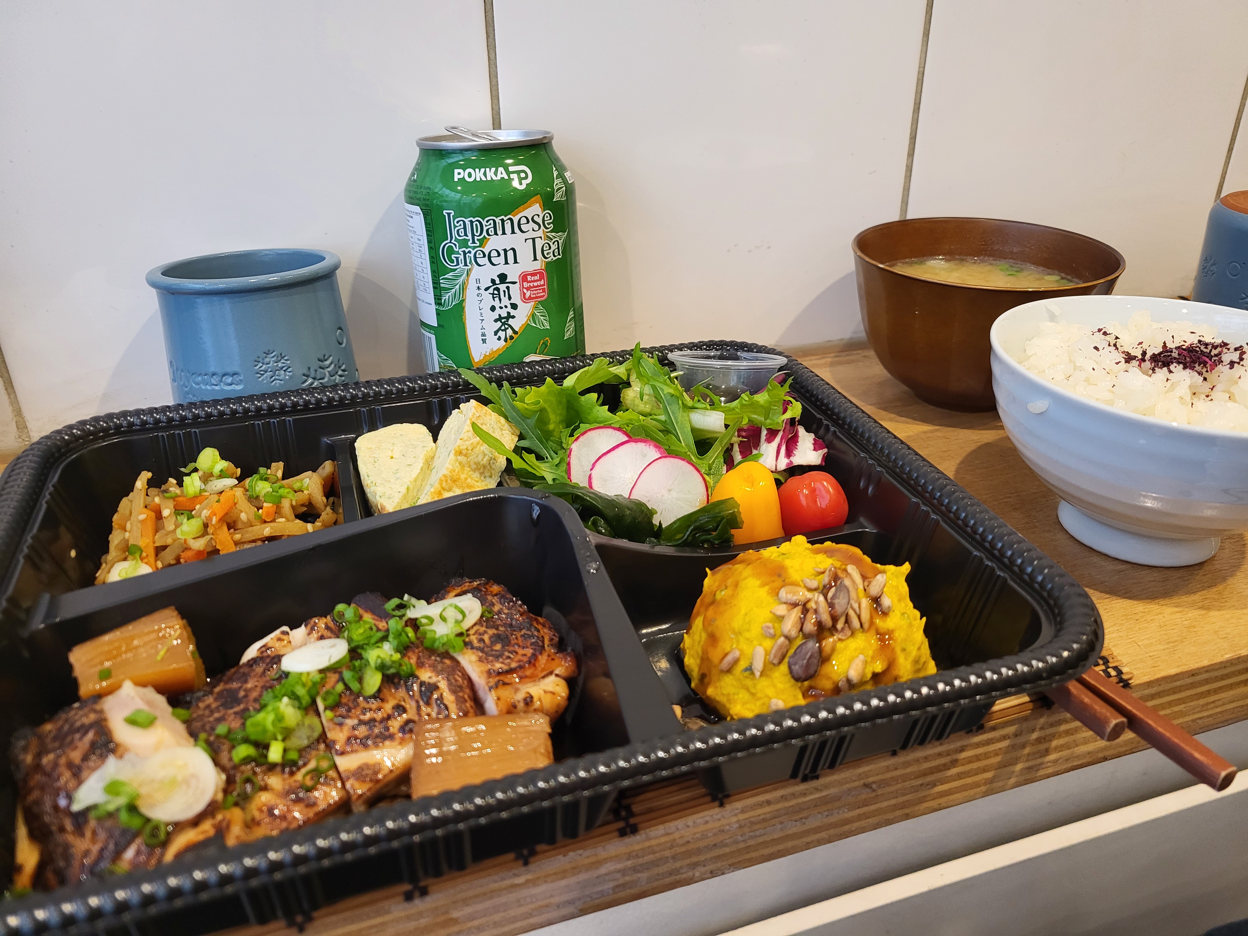De délicieux bento à emporter pour 12 euros comprenant une salade et sa sauce sésame, une purée de pomme de terre avec des carottes et concombres et de l’oignon croustillant sur le dessus, des fines lamelles de salsifis et carottes sautées au soja, une omelette à la ciboulette du riz et la protéine de votre choix -poulet/ saumon ou tofu pour les végétariens. J’ai testé le saumon grillé mais mon coup de coeur est le tofu à la sauce champignons un régal sachant que je ne suis pas végétarienne de base mais j’ai trouvé ça très savoureux!) J’ai goûté leur dessert de dorayaki azuki (un délice car pas trop sucré) Le gros plus, ce sont de véritables japonais qui tiennent ce restaurant 😊