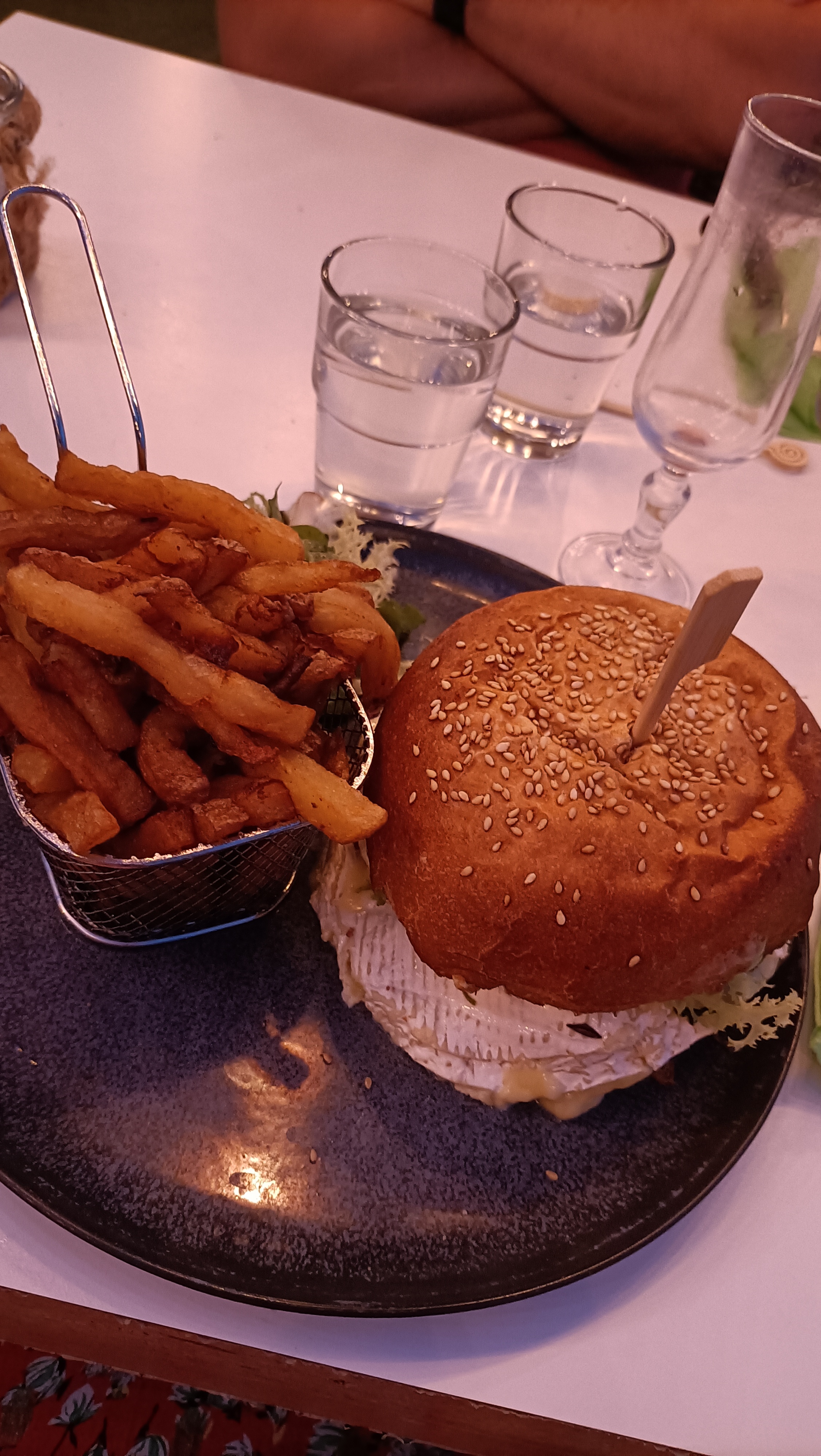 Une superbe découverte ! On regrette de ne pas s’y être perdus plus tôt dans nos vacances :) A ceux qui disent que le service est long, à notre goût pas du tout ! Parfois maladroit ( manque un verre ou la serviette) mais c’est à taille humaine avec des serveurs/serveuses avec un sourire superbe, pas stressés, qui prennent le temps d’un mot ou d’une blague avec les enfants … La patronne (?) est super ! Nous étions sur la plage avec notre chienne et elle nous a interpellé pour nous donner une gamelle d’eau 😍 et après le repas nous a rattrapé sur le trottoir pour nous souhaiter bonne route ! Dans ce monde de fou ce genre d’établissement fait un bien fou et réchauffe le cœur :) Et … le plus intéressant : la cuisine est excellente ! Burgers, viandes, tapas, desserts, testés et approuvés ! Le cadre est sublime et nous y reviendrons l’an prochain 😍🫶🏼