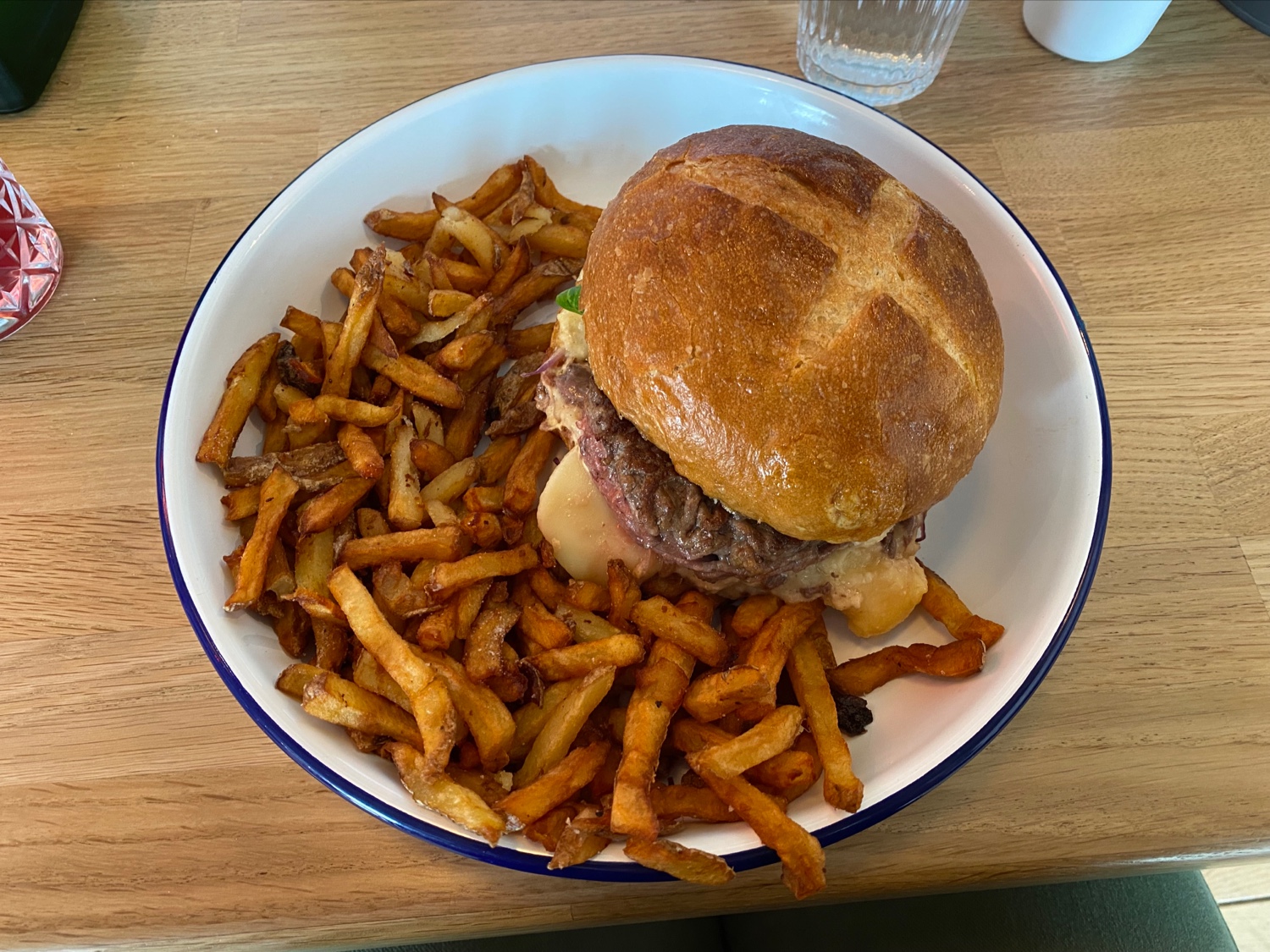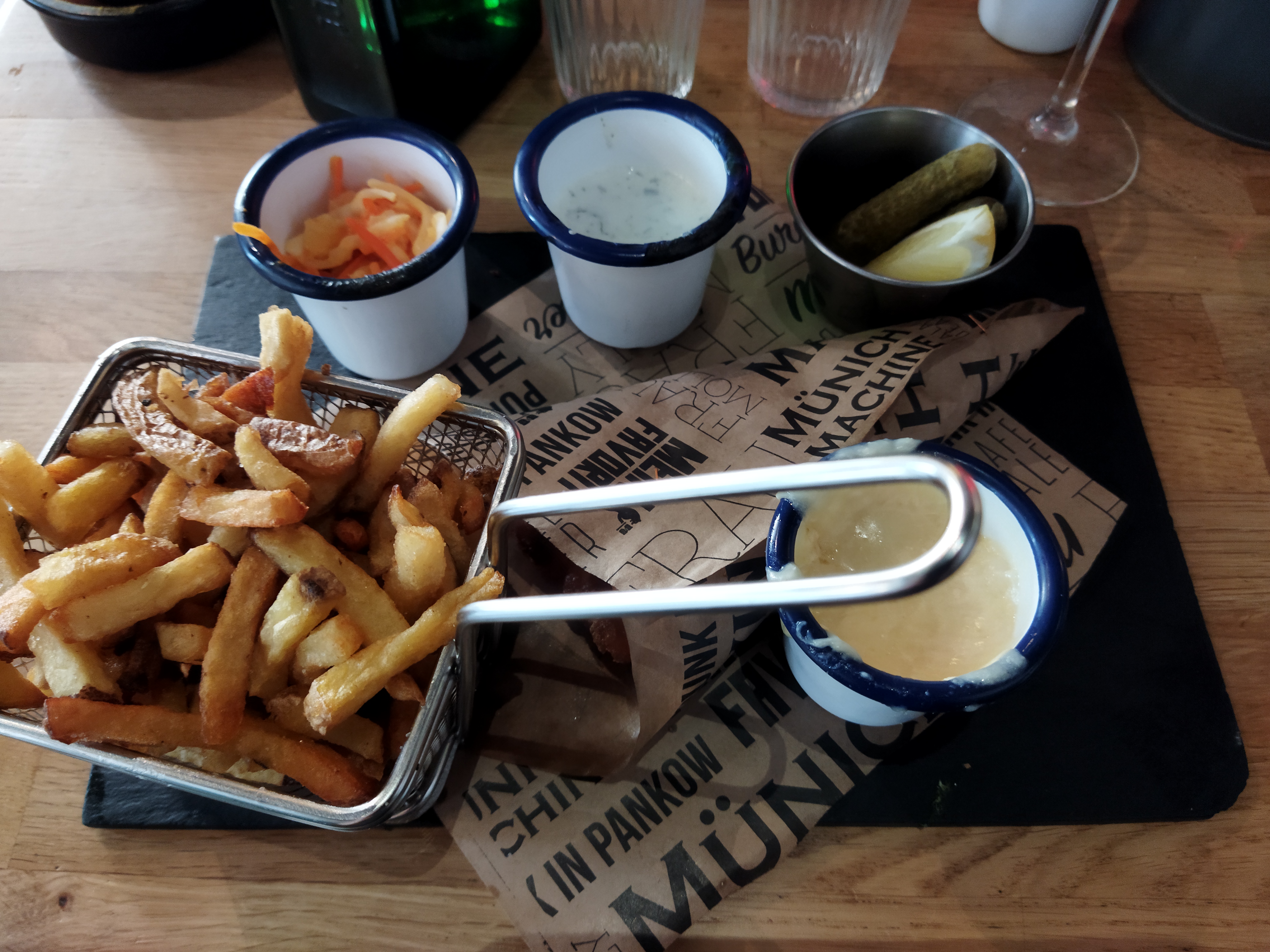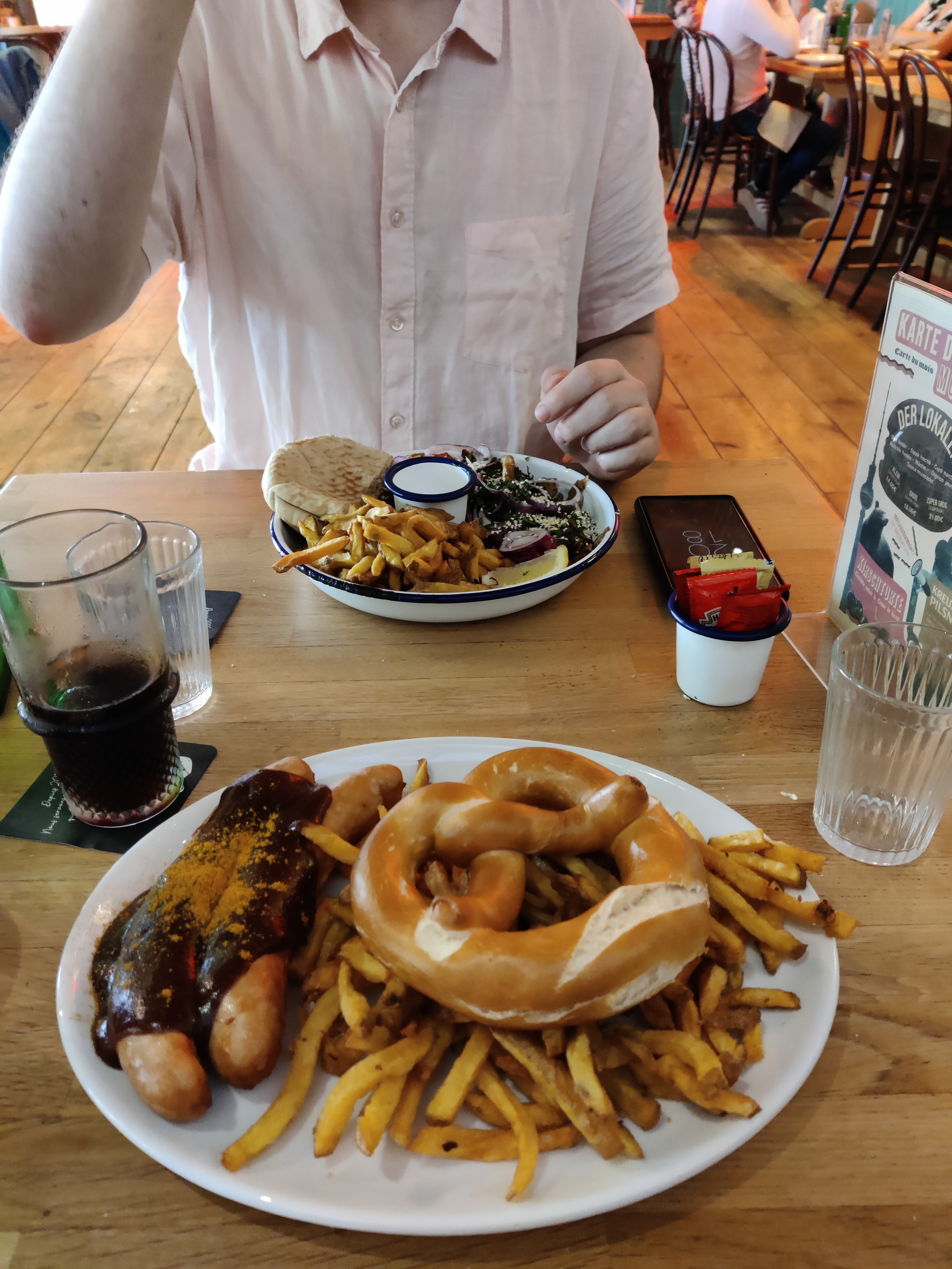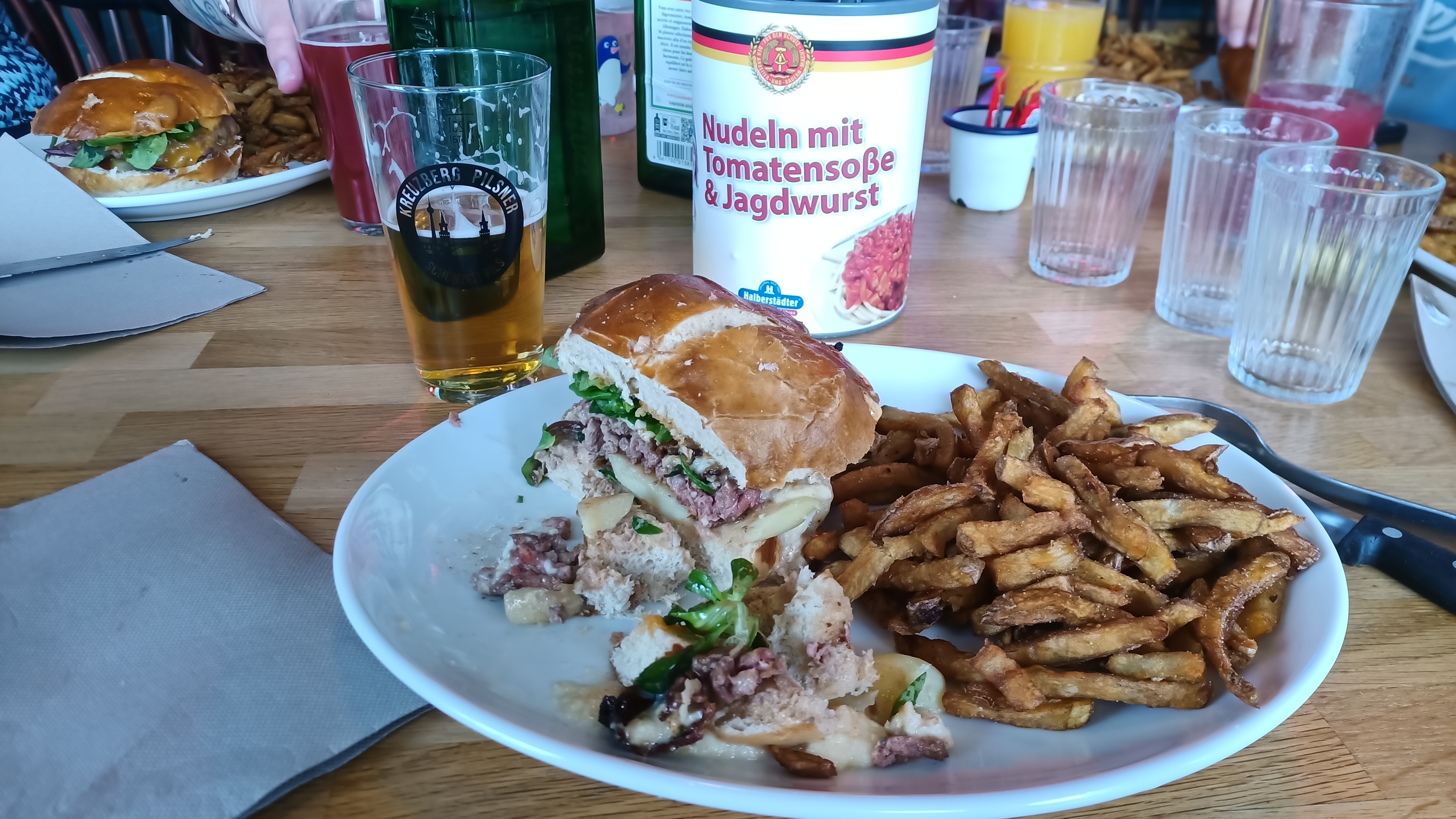 Famille franco-allemande, on n'a pas pu résister à trster ce restaurant, surtout qu'on revenait tout juste de Berlin. Malgré notre arrivée un peu tardive (on avait pensé par erreur qu'il y avait un service continu), la cuisine a encore pris nos commandes : un burger Mein Favorit, une double Currywurst et un Döner Kebab. Tout était excellent, la bretzel avec la Currywurst un bonus. Le Döner est servi dans une assiette, on remplit le pain (trop petit pour tout contenir) soi-même. Comme boissons on a pris des limonades Fritz qu'on connaissait de Berlin. Les serveurs étaient très gentils, la déco (fin XXe siècle) originale. Ce qui nous a fait rigoler : la projection d'épisodes d'Inspecteur Derrick sur le mur.