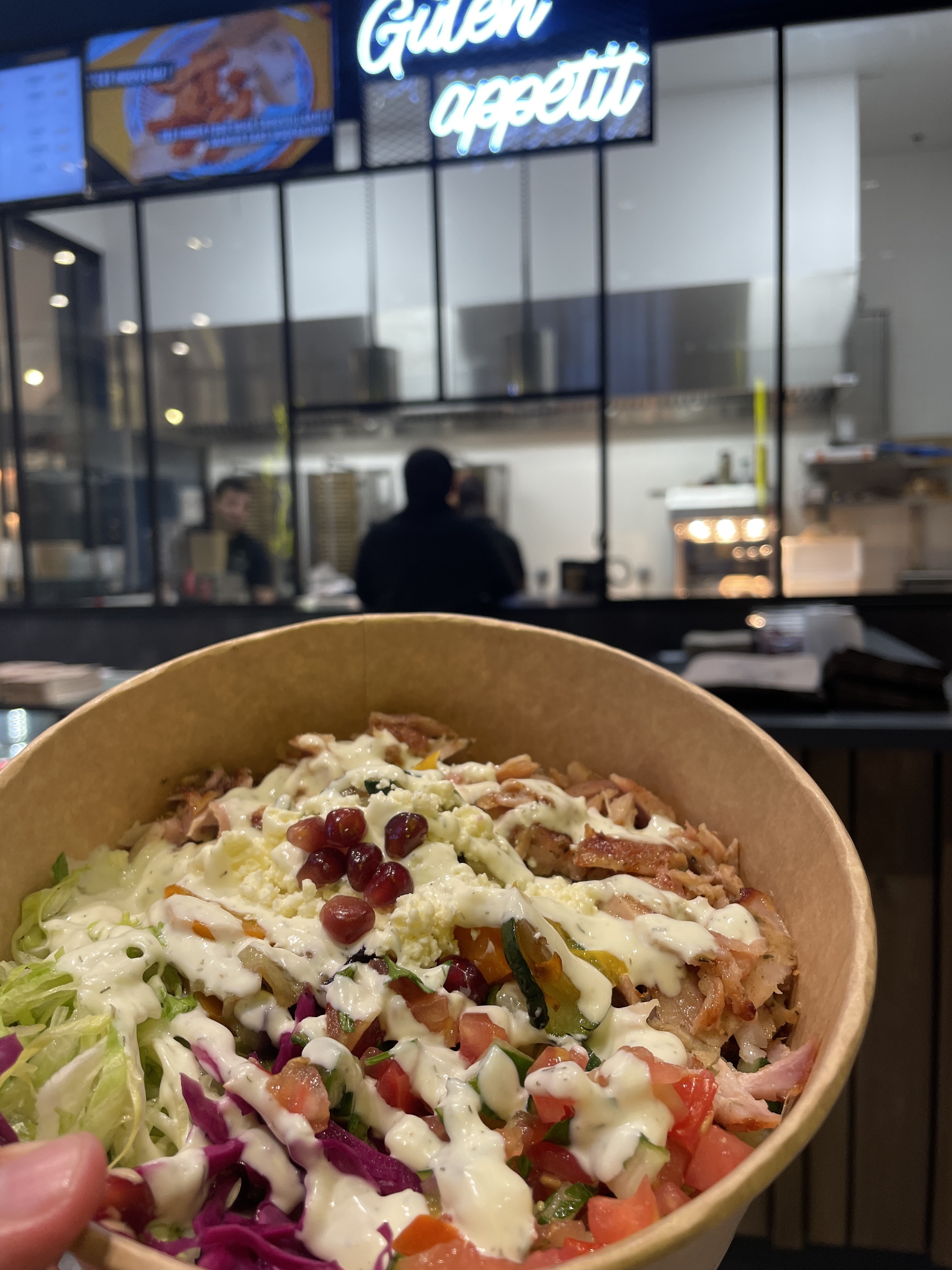 De passage sur Noisy Le Grand, j’ai voulu goûter un bol kebab de cette enseigne BERLINER tellement préconisé sur le net mais quelle déception! Premièrement, je pense que staff n’a jamais goûter un vrai kebab de Berlin. On est à des années lumières de ce qu’ils vendent en Allemagne. La quantité est ridicule et l’assemblage du bol est vulgaire. Il restait tellement d’espace dans le bol que tout était mélangé comme de la ratatouille. Au mieux prenez un emballage plus petit comme ça l’illusion d’en avoir pour son argent sera plus crédible. Le rapport prix/quantité/qualité n’est pas justifié. Le fait de mettre quelques graines de grenades ne fait pas tout la différence. Le kebab est à la base un sandwich populaire et accessible. … Das Original ? Je doute fortement surtout pour le prix appliqué.