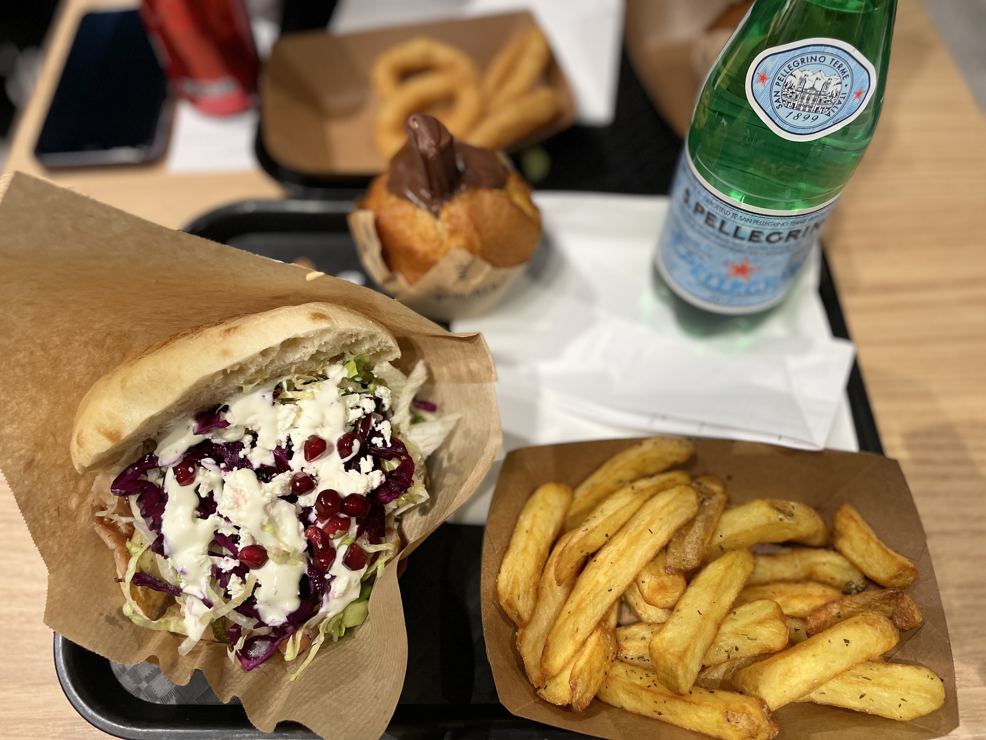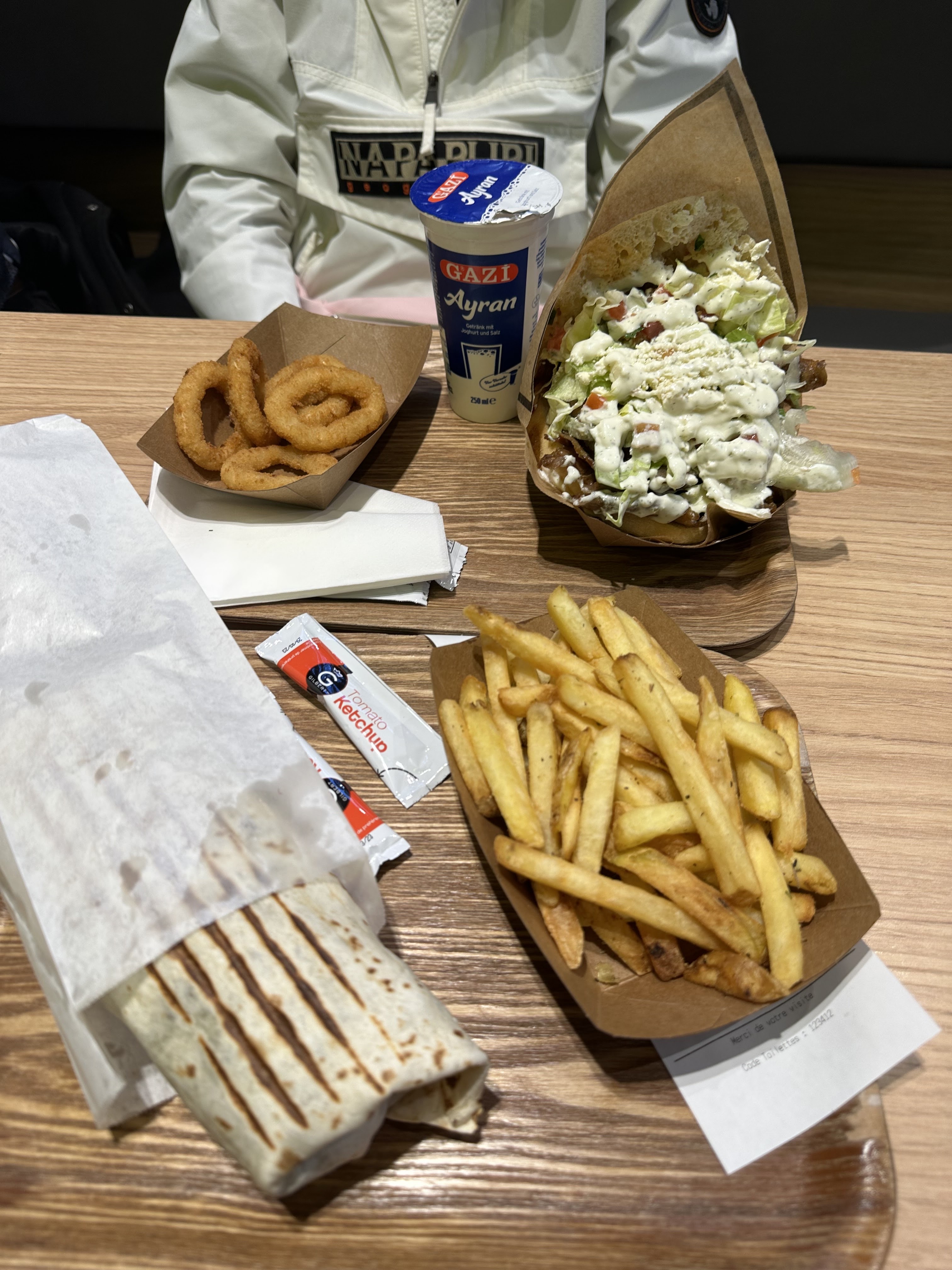 Nous avons découvert pour la première fois ce fast-food alors j’ai pris un wrap poulet et mon mari une pita. Pour le wrap je le trouve légèrement petit en revanche le goût est la. J’ai préféré La pita car les crudités frais était meilleur que dans la pita qui elle était chauffé forcément. Le goût est la mais nous avons été surpris par la prix!!! Le sandwich coûte 9,50€ vous devez ensuite rajouter 4€ pour la boisson et frites. La portion de frites et vraiment petite au vu du prix il devrait être beaucoup plus généreux c’était assez décevant. Nous avons payé pour deux sandwich 2 frites et 2 boissons ( frites et boissons à payer a part) 27€50.