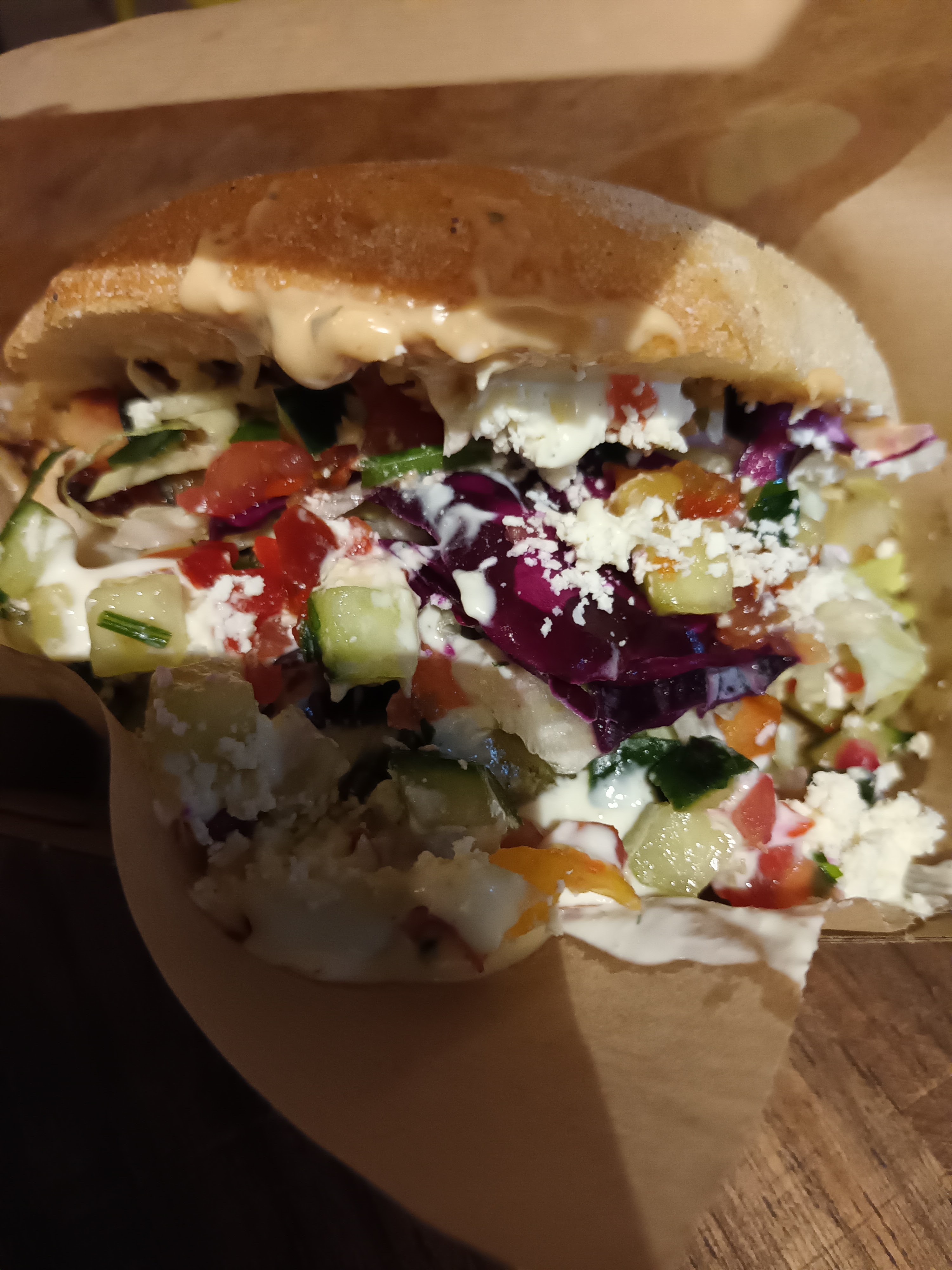 Nous nous sommes régalés . Les légumes super bien mariné , très bon goût. Tout s'assemble parfaitement, les frites délicieuses, la sauce blanche de même . C'est vraiment différent du kebab classique !