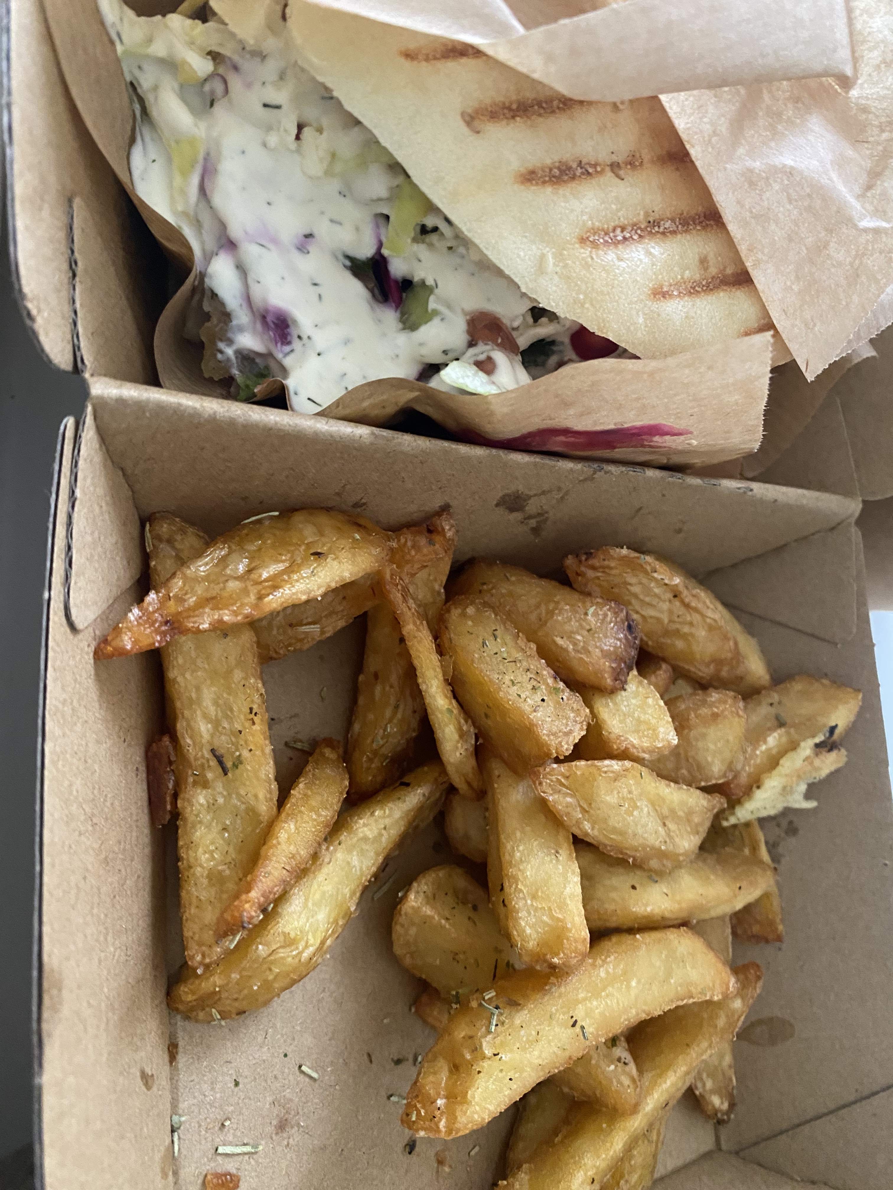 J’au adoré ! C’était comme un kebab mais très complet avec beaucoup de salade qu’on a pas l’habitude d’avoir. Cela donnait une touche de fraîcheur au sandwich très appréciable. Je recommande le pain pita qui était délicieux.