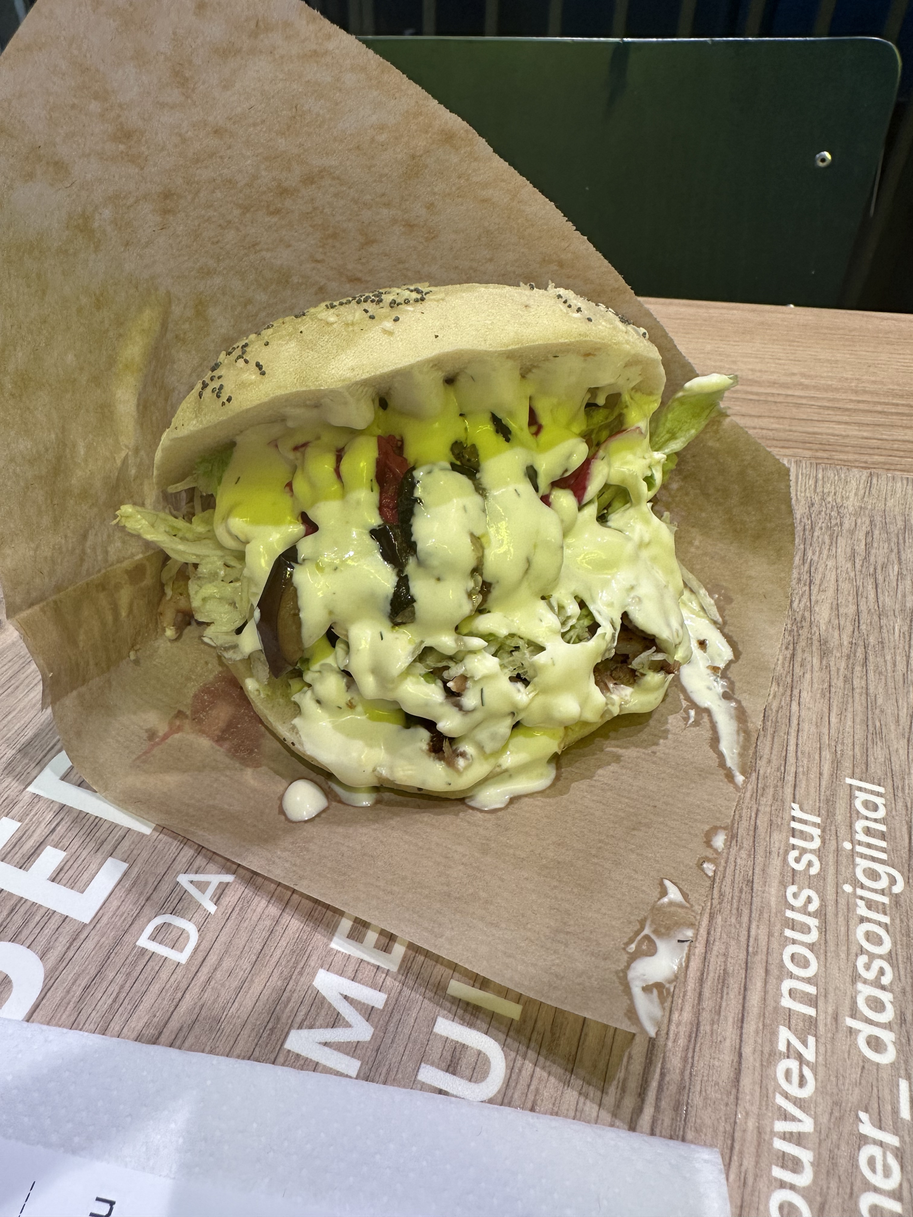 La version végé des kebab est très bonne avec des falafels à la courgette et au fromage. Les légumes qui accompagnent les falafels dans le pain étaient aussi tres bons, ça change du classique salade, tomate et oignons. La sauce était également très bonne.