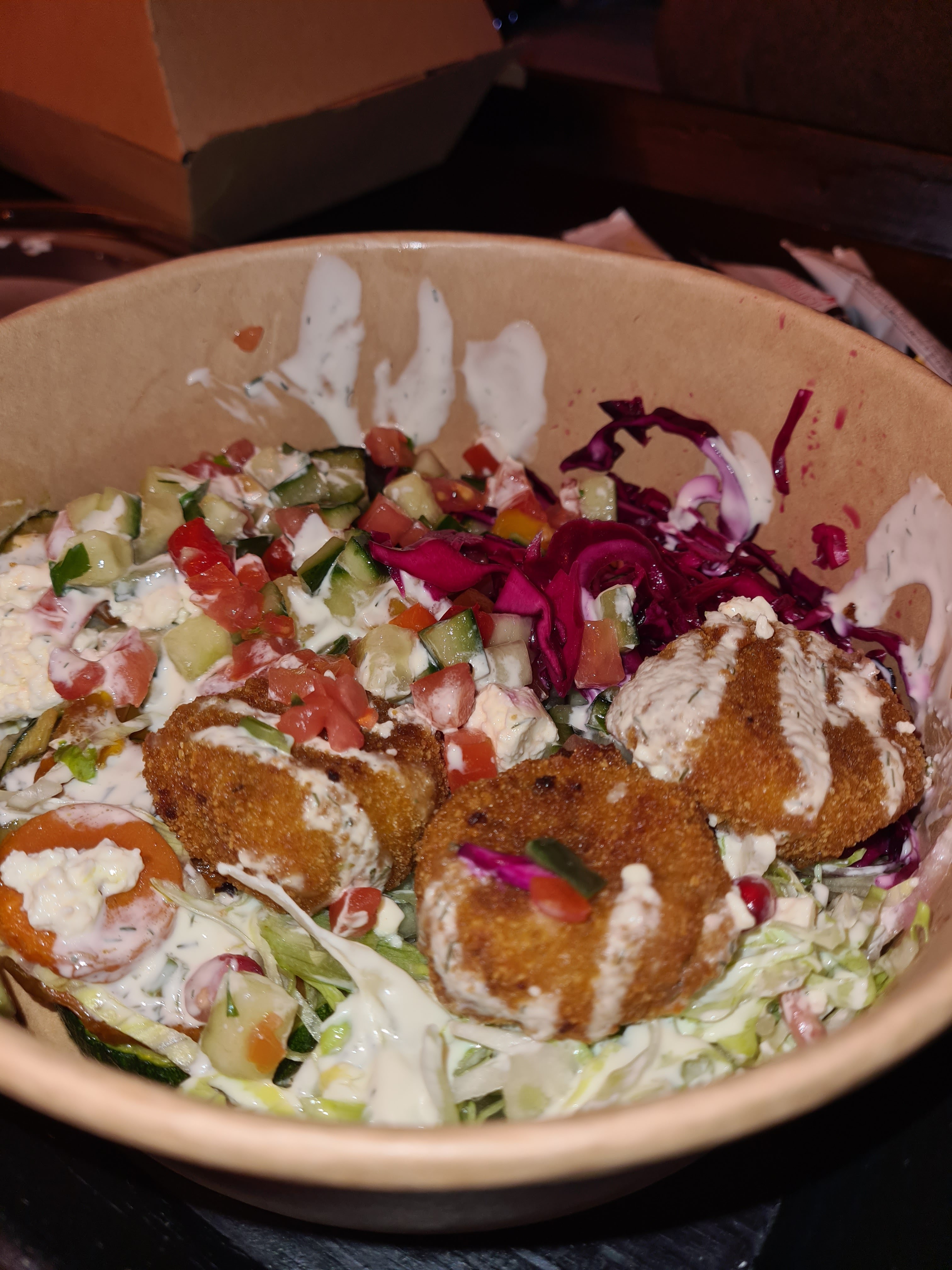 Plutôt déçue ! Ce n’est vraiment pas mauvais. Toute fois attention au peu de quantité ! Une portion de frite molle et froide remplit qu’à 1/3 , seulement trois petites falafels dans un Bowl remplit quasiment qu’avec de la laitue. Un supplément pour avoir un coca cherry en bouteille mais finalement on reçoit une cannette de coca classique. 15€ Cela est beaucoup trop chère au vu de la quantité , même si cela est plutôt bon.