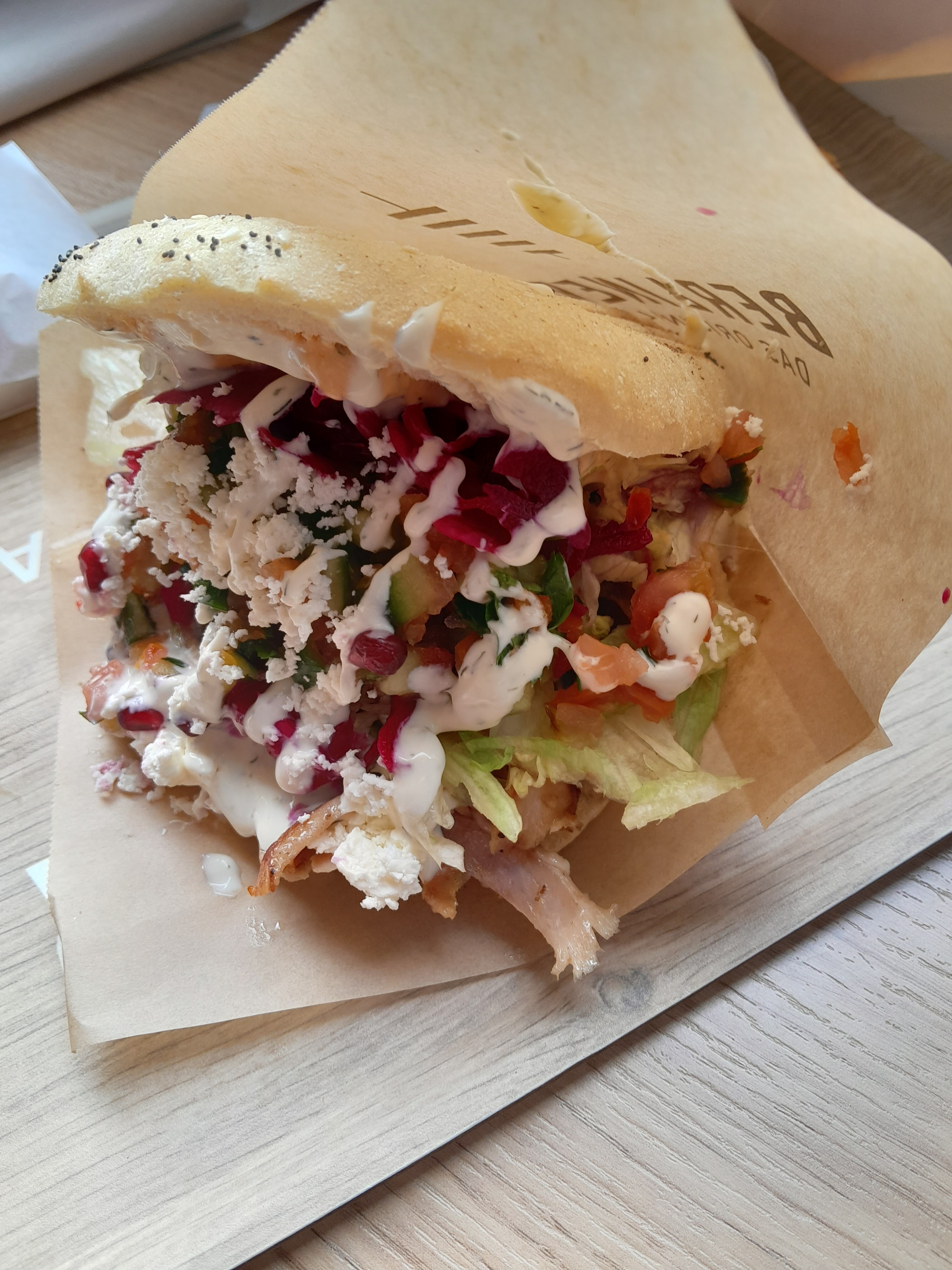 C'est très frais, pas lourd du tout comme les autres kebab classiques. Les portions ne sont pas immenses, juste parfaites !! Un peu d'attente, mais il y avait du monde aussi.