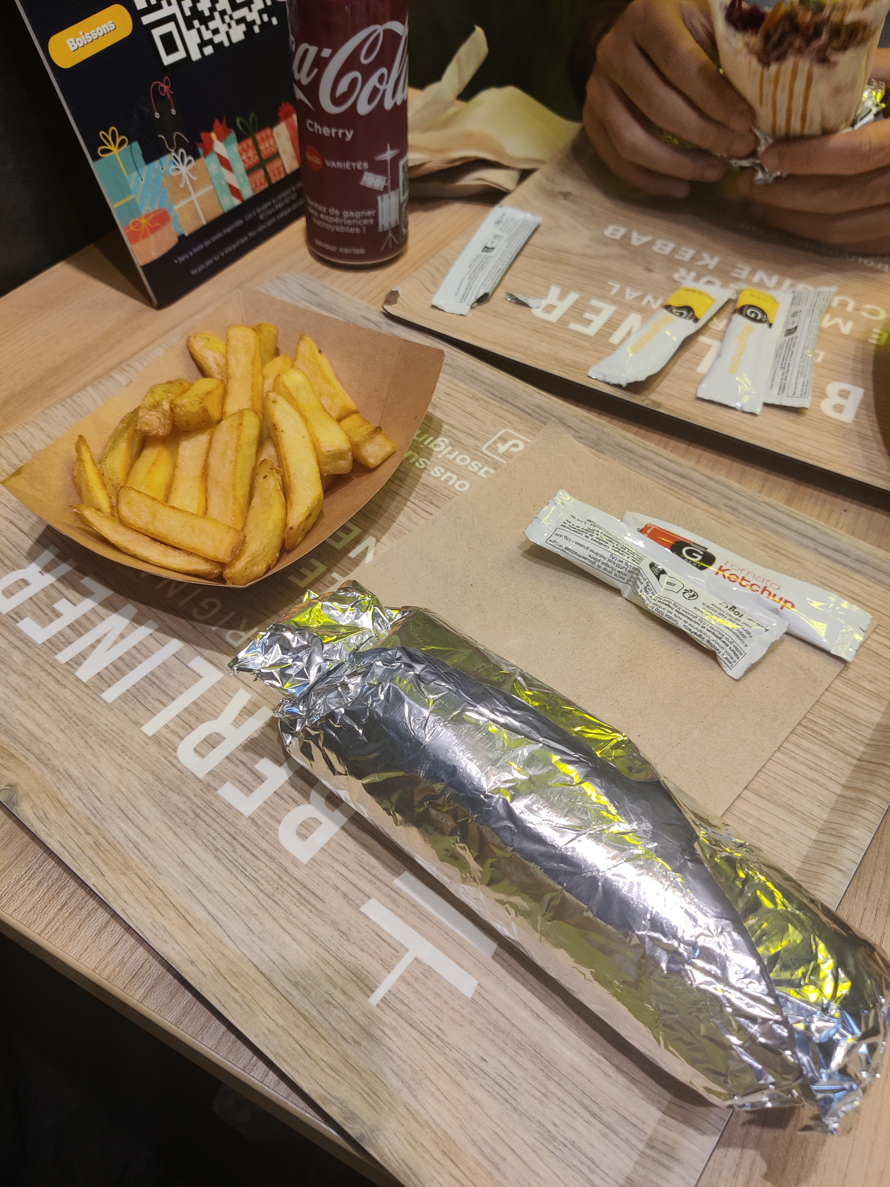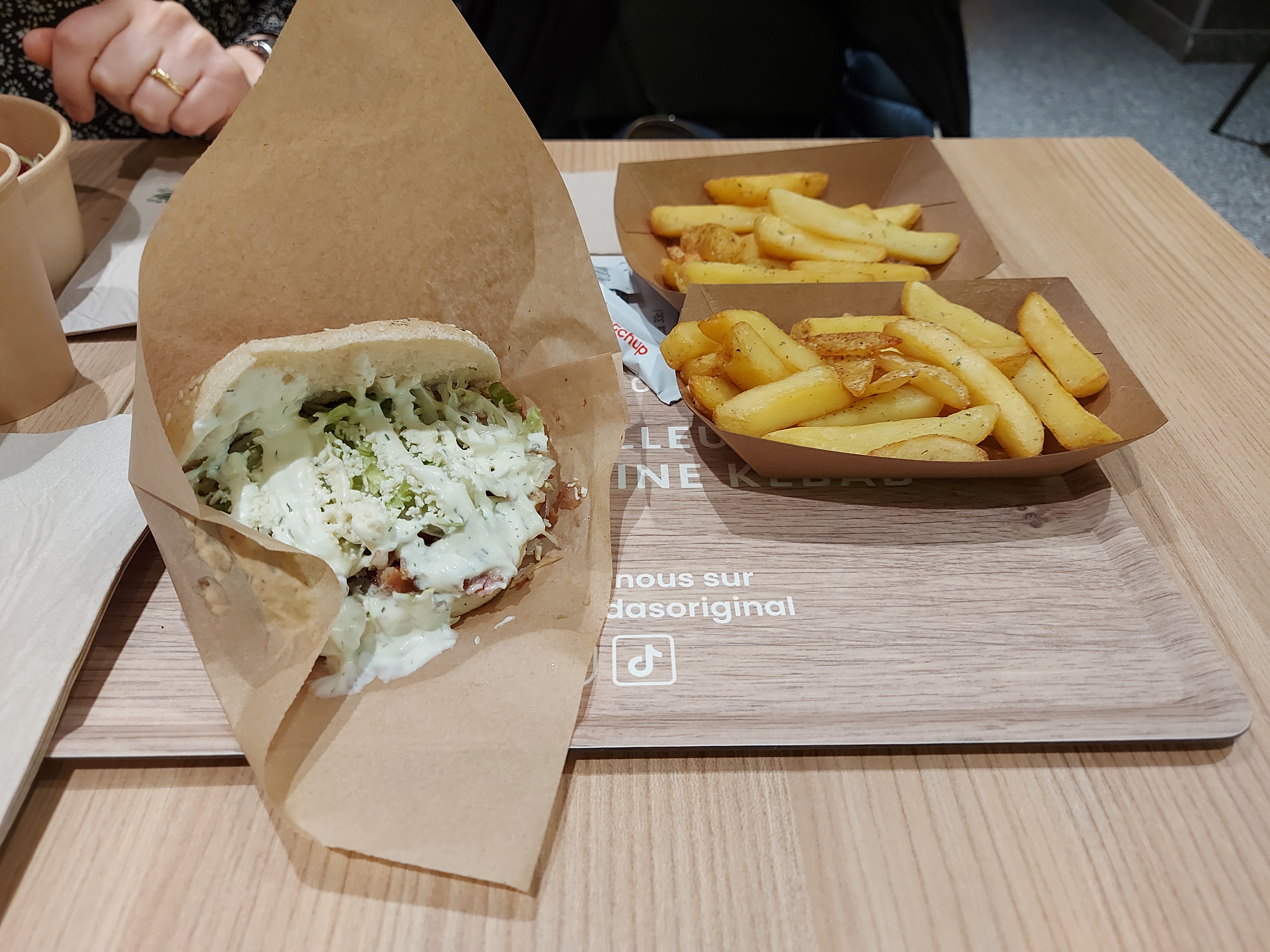On croirait à une mauvaise blague mais non, c’était bien le contenu de nos paquets de frites. Le kebab est ok sans plus. Je ne recommande pas pour le prix, autant aller au restaurant ou à la concurrence.