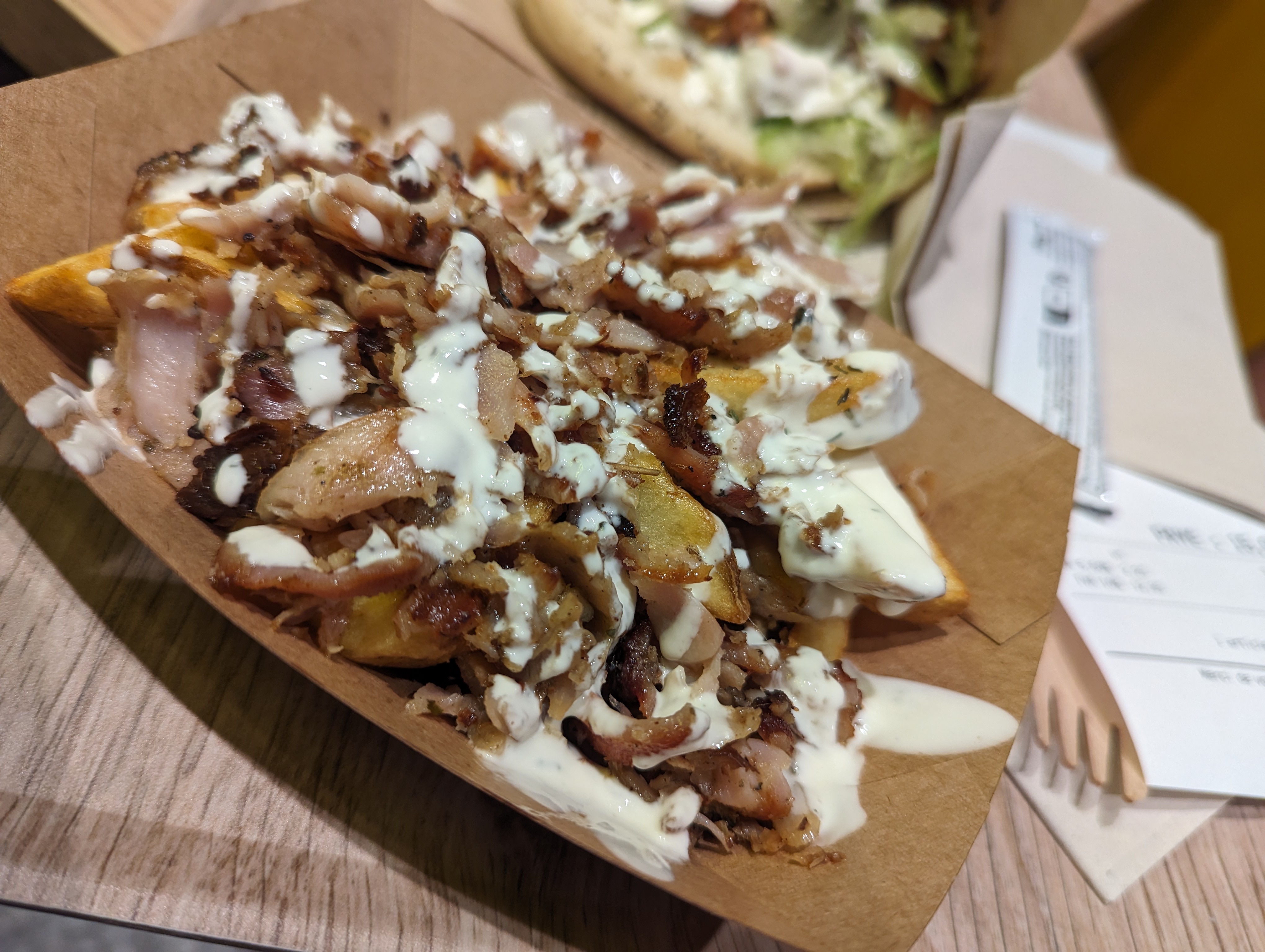 Très bon kebab, j'ai goûté au deux broches (poulet et veau/dinde). Le pain est goutu avec les graine de sésame noir au dessus. Les frites le sont aussi avec les herbes dessus. Rien à dire. PS : les 3 étoiles pour l'ambiance c'est pas leurs faute. Comme ils sont dans un mall, il y a pas mal de bruit.