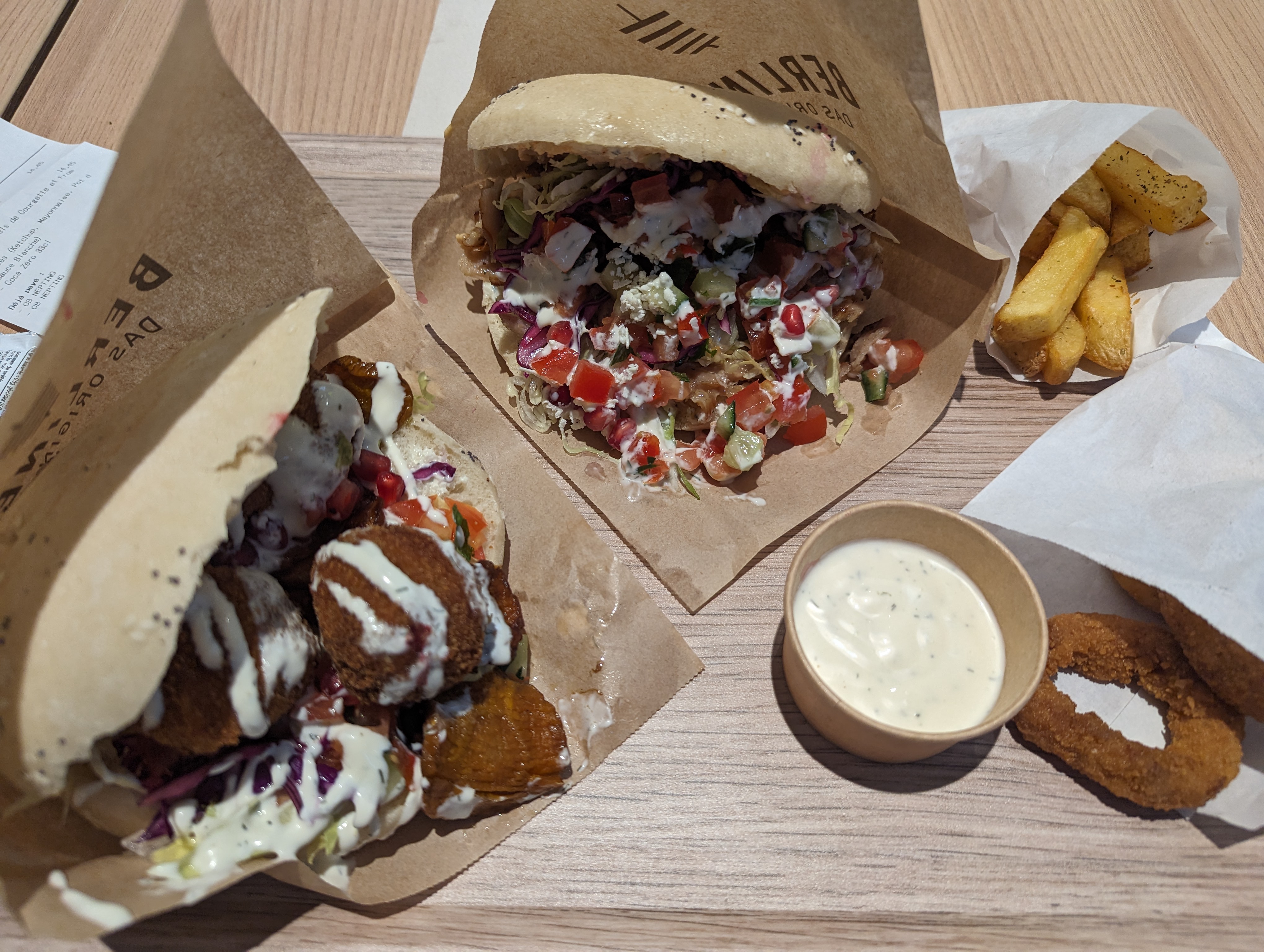 Nous avons pris 2 menus pita : fala fels de courgette et fromage. Une formule veau et dinde. Les frites aux herbes sont très bonnes. Le pain est bon et bourratif.
