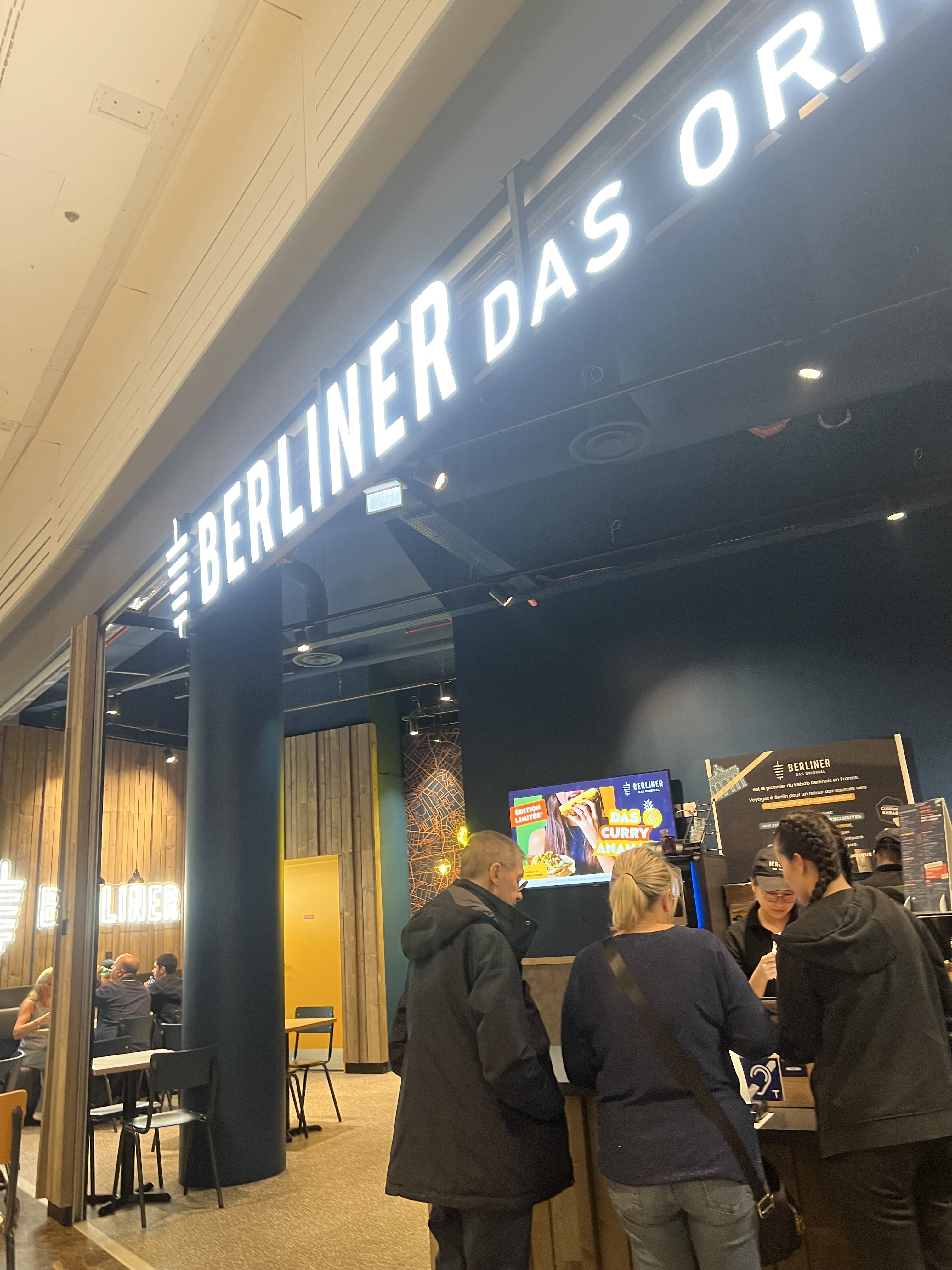 Je suis venu avec mon fils un samedi soir pour manger surplace avant un ciné. Peut-être n'etait-ce pas le meilleur jour pour ce Berliner... Le service m'a paru long pour de la resto rapide, les frites étaient mal cuites et le falafel froid à l'intérieur. J'ai demandé à mon fils (amateur de Kebab) son avis: Pas fou fou il m'a répondu. Bref, j'ai mangé dans des Berliner de meilleur qualité et pour moins cher.