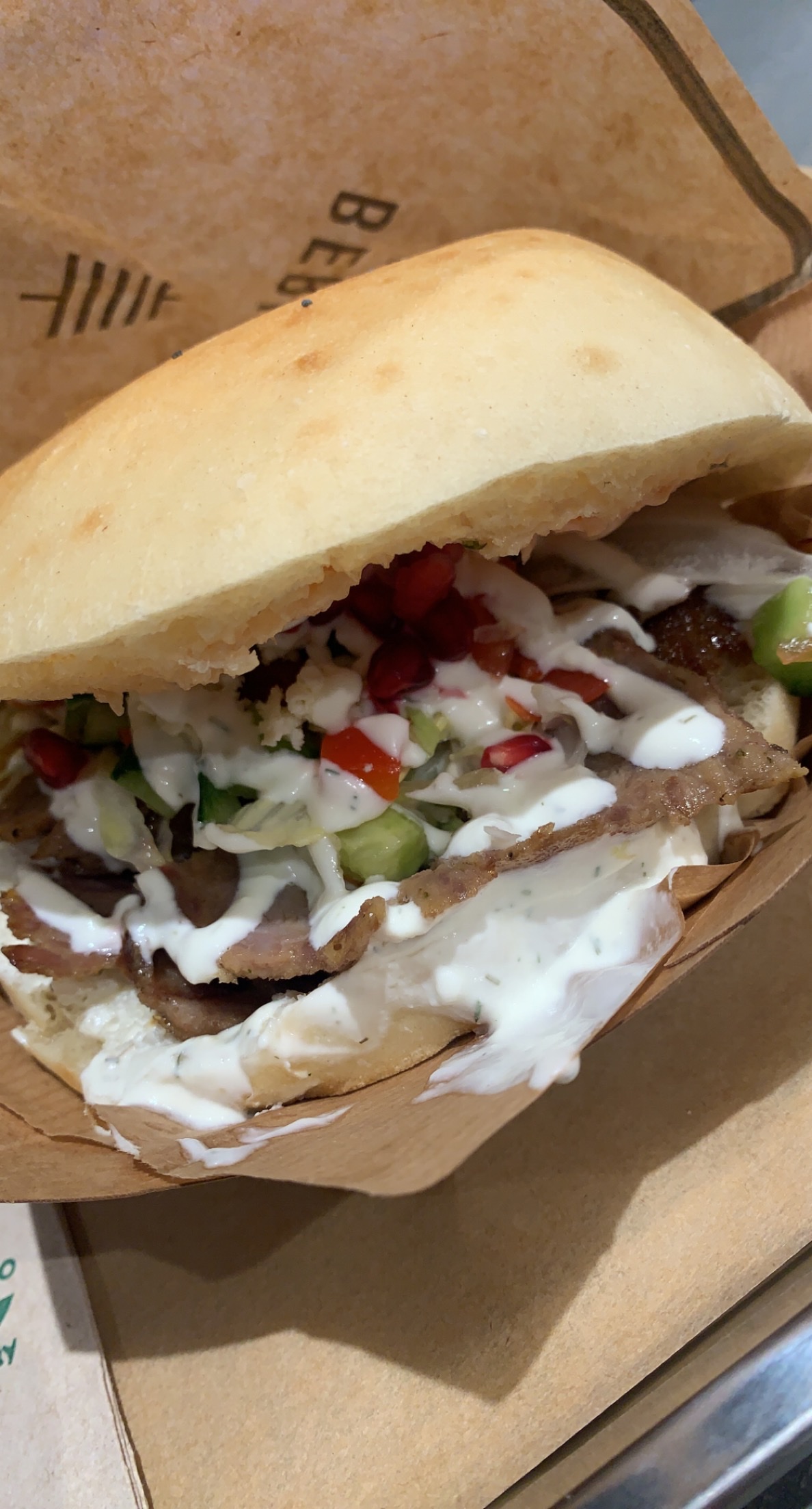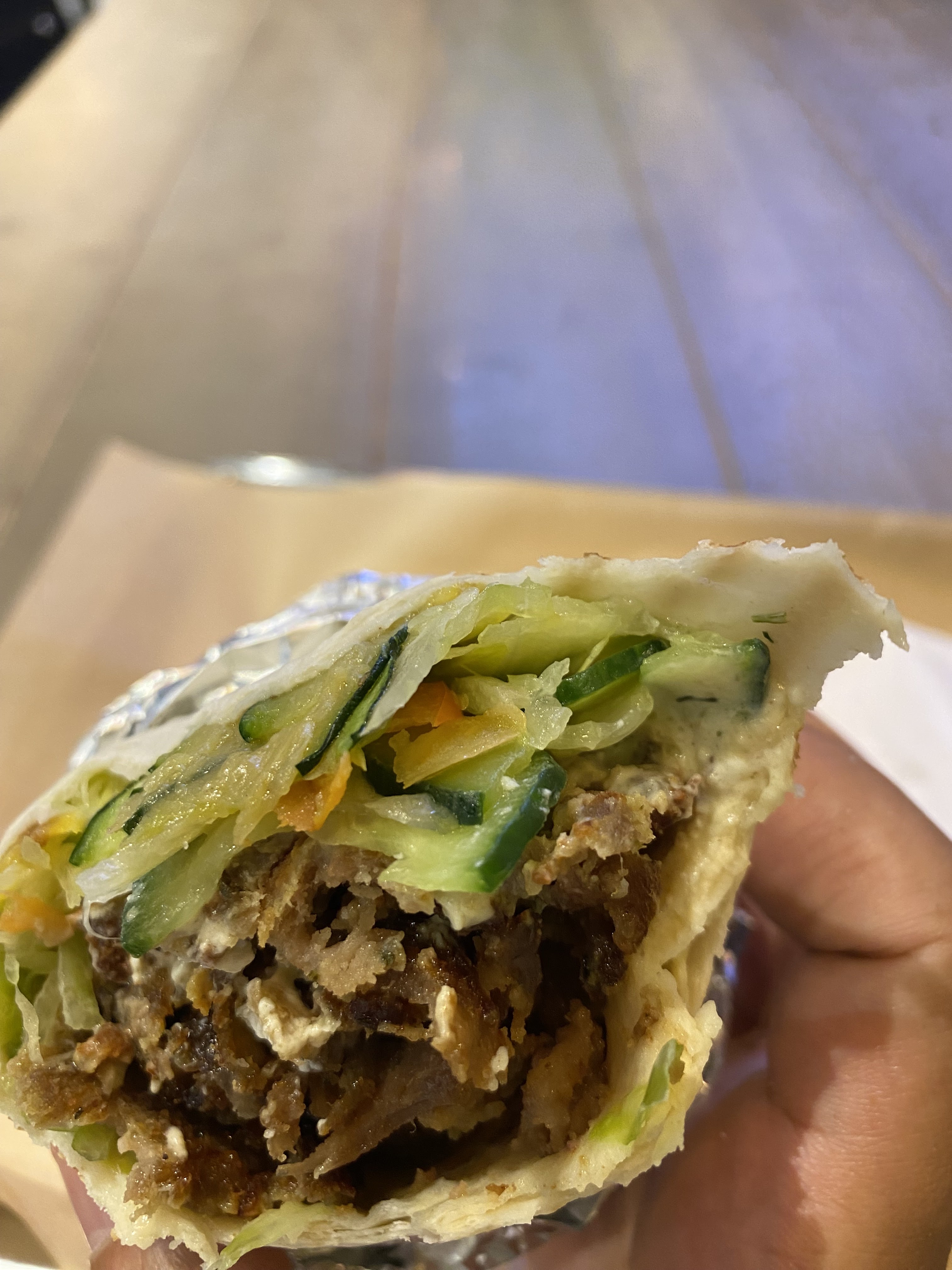 Très décevant ! Ils mettent bcp de crudités dans le sandwich et très peu de viandes, la viande n'est qu'au fond du sandwich, du coup vous passez les premières minutes à manger que des crudités... Aussi, la viande est très très fade ! Elle était totalement noire dans mon sandwich, c'est donc excessivement cher un sandwich rempli de crudités. Passé votre chemin, y'a de meilleurs grecs dans le coin pour moins cher !