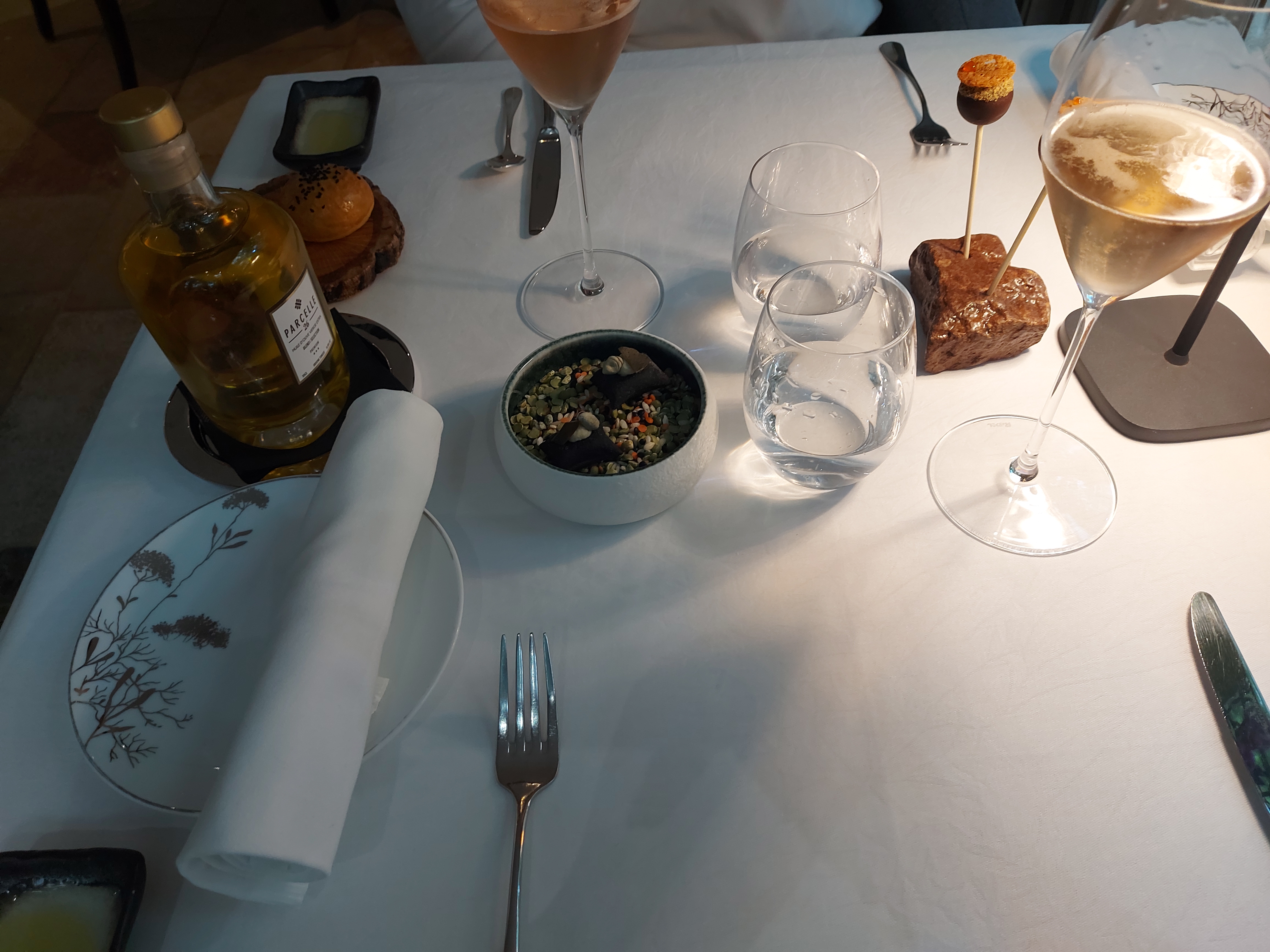 Dîner pour 2 personnes le 22 mars 24! Excellent accueil de la réservation par téléphone au départ du restaurant. Service non moins excellent, attentif, souriant et sans pression. Atmosphère détendue et apaisante. On dîne dans le calme en prenant son temps. Excellente cuisine gastronomique, raffinée, subtile et originale. Nous avons pris le menu decouverte/surprise à 95 euros avec la possibilité de l'adapter à vos allergies, goûts etc...Nous sommes répartis avec une très belle bouteille d'huile d'olive de Tunisie (parcelle du chef). Nous avons d'ailleurs pu échanger avec le chef qui est venu à notre table. Nous reviendrons dîner dès que le temps permettra de profiter de la magnifique terrasse.