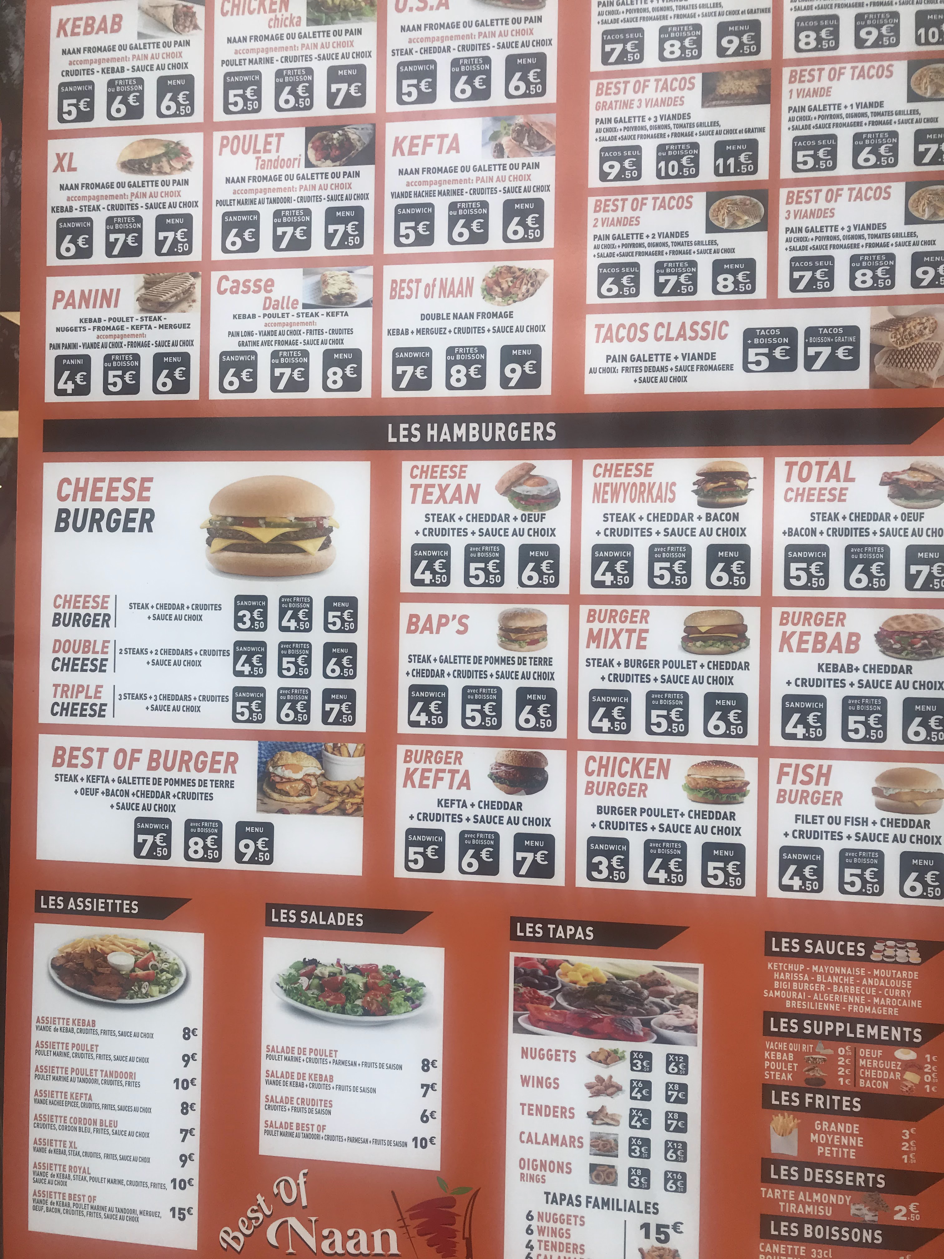 Naan USA, Burger kefta et Tacos 2 viandes très copieux et vraiment très bons tous les 3, nous nous sommes régalés pour une 1ère visite en fin de soirée ! Resto très propre et personne, au service, très cordiale, tarifs abordables et pas du tout excessifs, on reviendra sans problème et heureusement que nous ne nous sommes pas fiés à certains commentaires non constructifs. On peut également se garer dans le parking situé à la gare juste en face ou sur les places gratuites le long de la rue. Merci à Best of Naan et à bientôt !