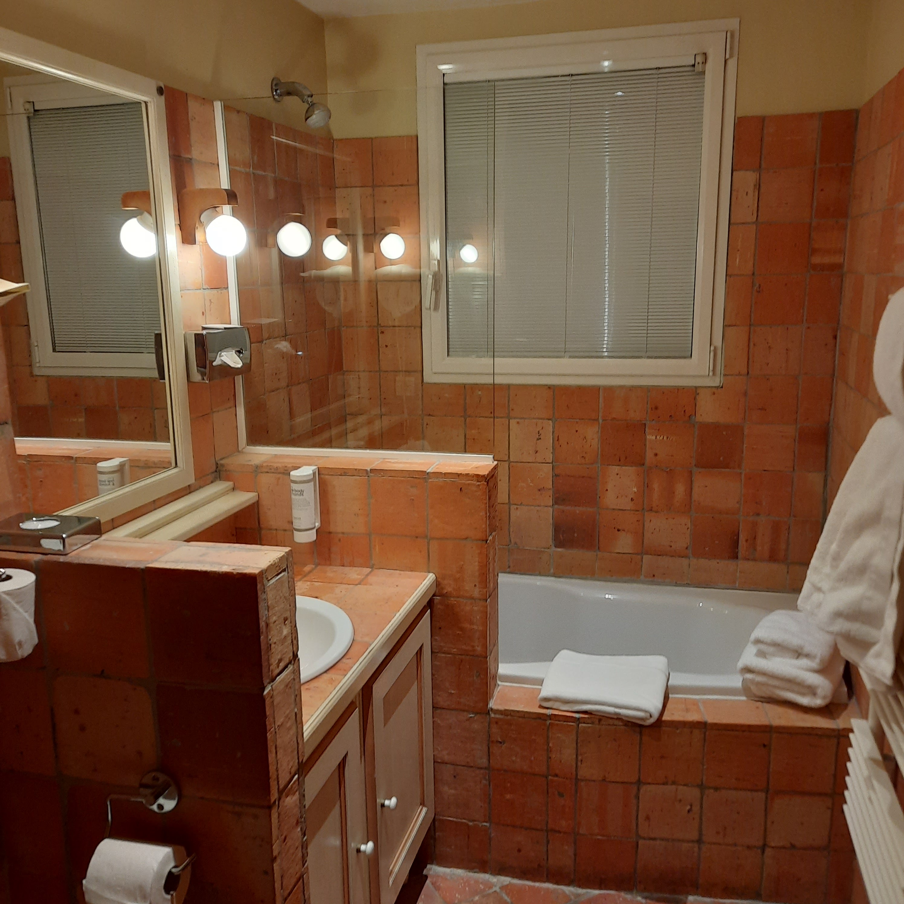 Chambre prestige tout simplement magnifique. Briques et tomettes, très spacieuse. Un hôtel délicieux ! Très bon accueil !