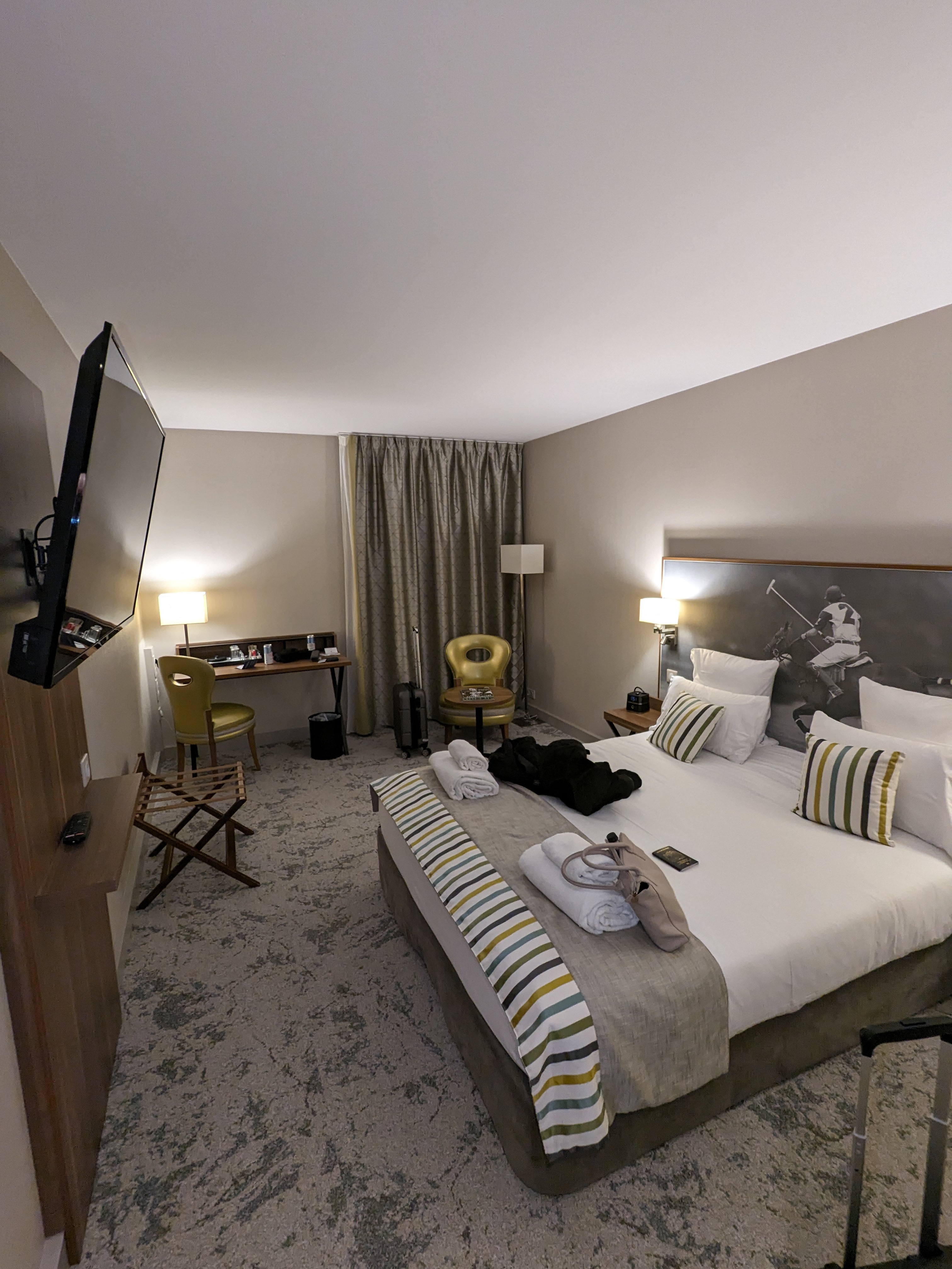 Nous avions 2 chambres familiales et toutes deux étaient spacieuses aux étages supérieurs, 4 adultes dans chaque chambre. L'accès à l'hôtel est assez facile, cependant le stationnement peut être difficile si vous disposez d'un véhicule plus gros. Les chambres étaient propres et parfaites pour notre séjour de 2 nuits. Accessible à pied à la gare pour rejoindre Paris en 45 minutes environ et à proximité de plusieurs bons restaurants si vous choisissez de ne pas manger sur place. Ça vaut le détour si vous ne voulez pas l’agitation de Paris. Le palais et le musée du cheval sont également très accessibles à pied. Le personnel était très serviable.